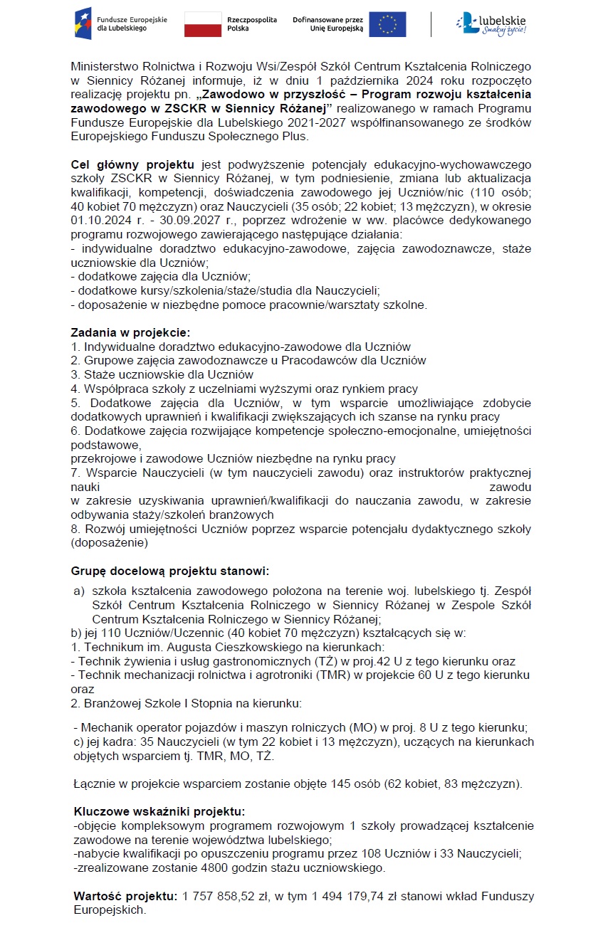 Zawodowo w przyszłość - Program rozwoju kształcenia zawodowego w ZSCKR w Siennicy Różanej #FunduszeUE #FunduszeEuropejskie