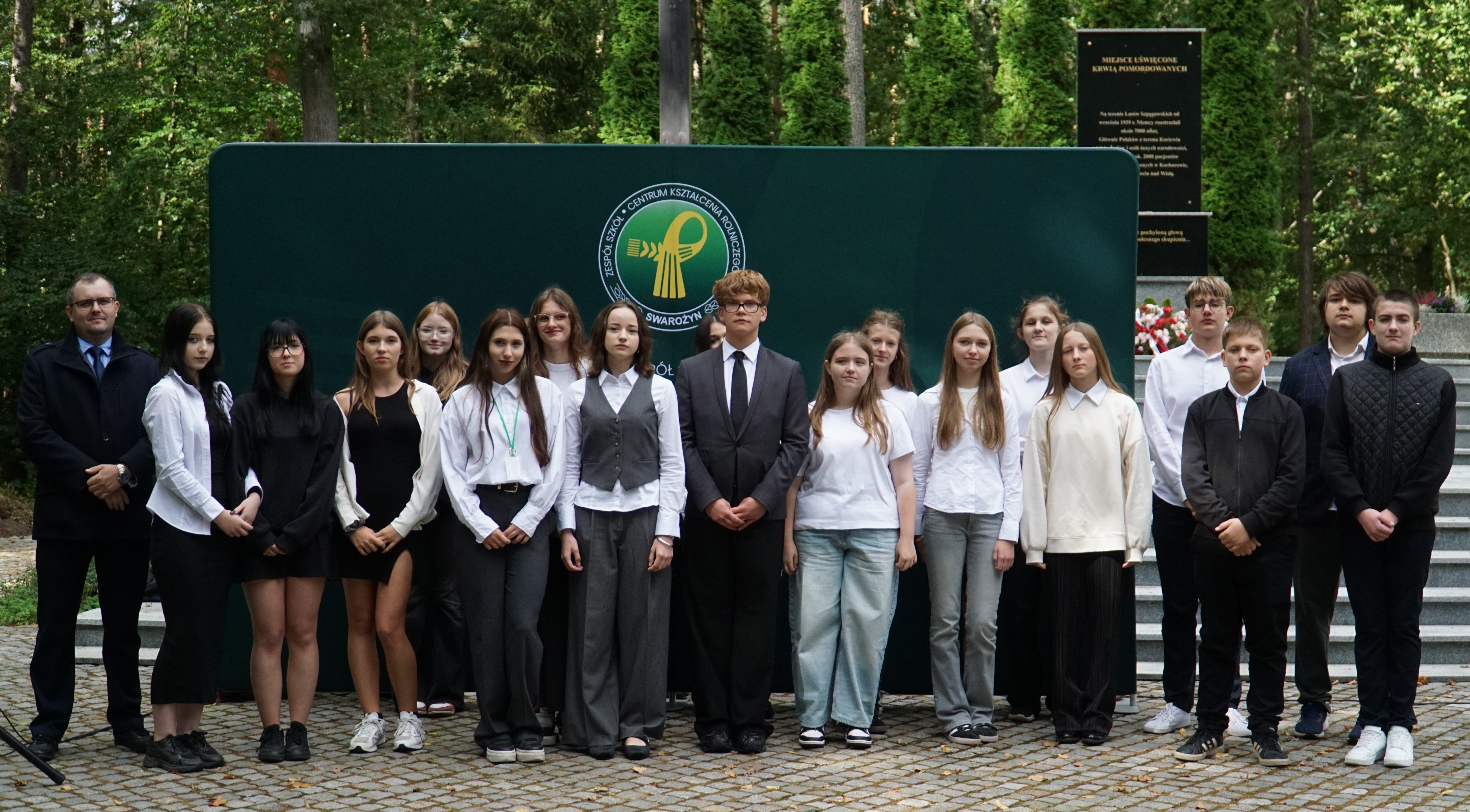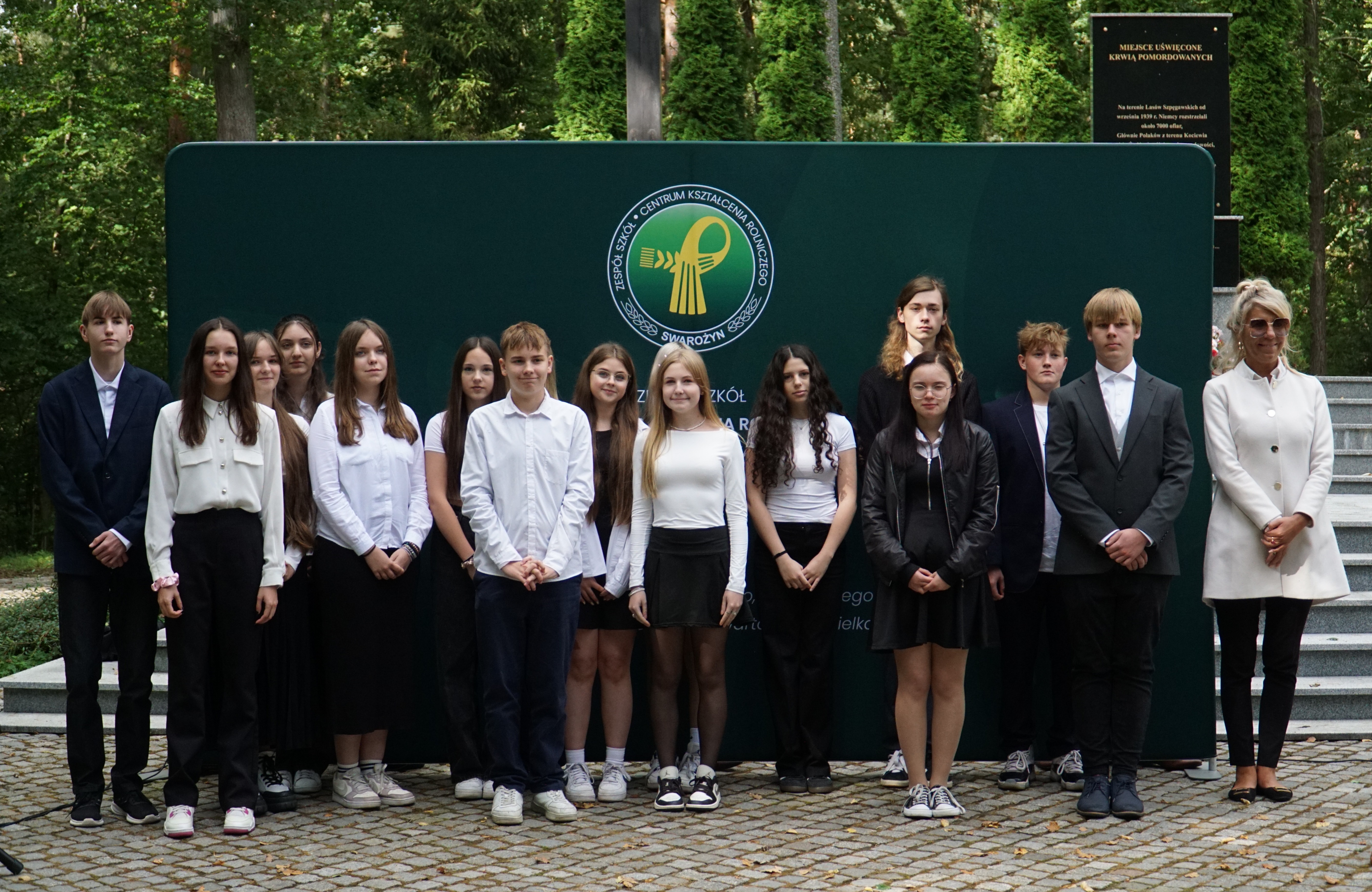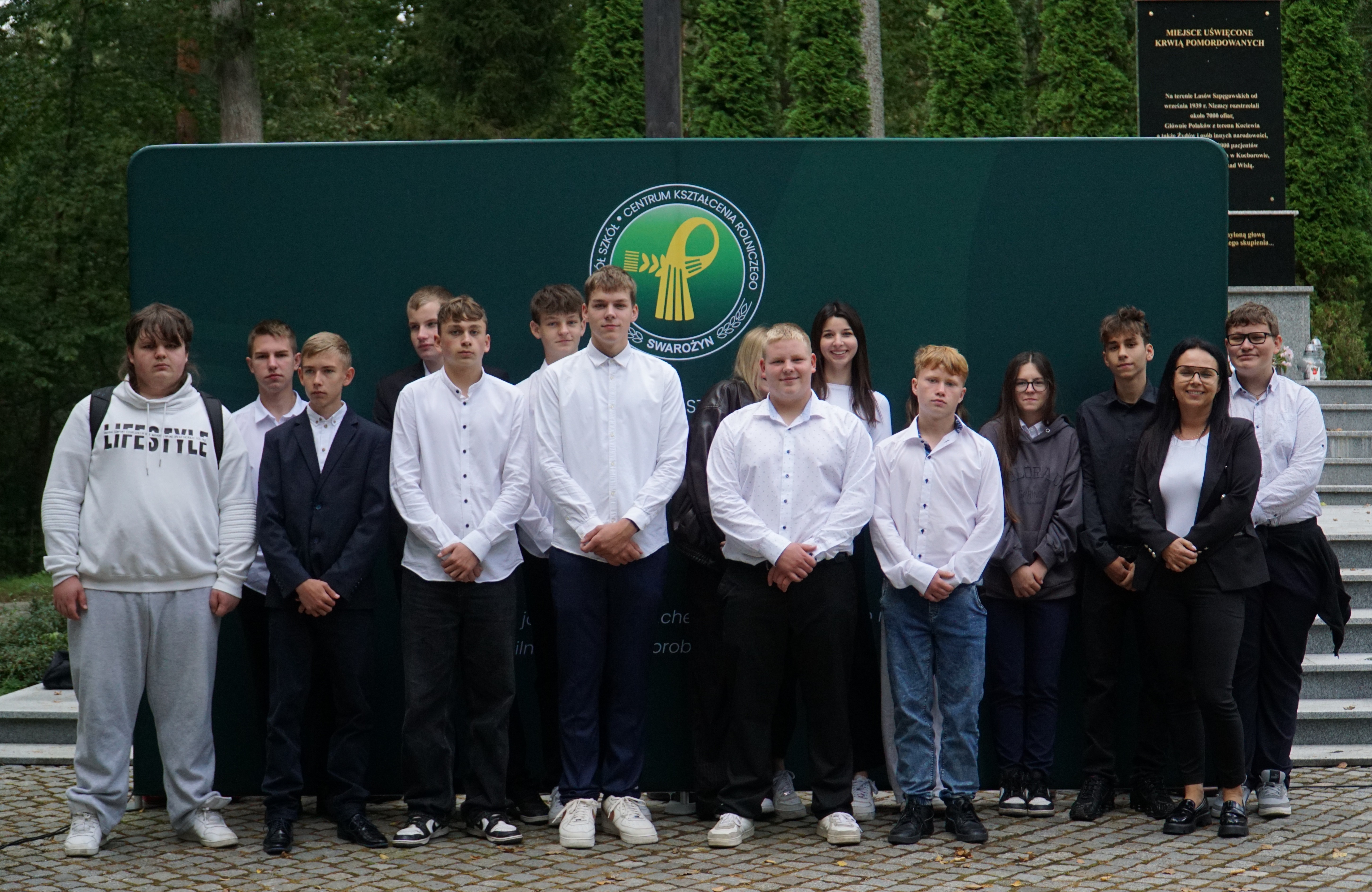 Uczniowie klas pierwszych wspólnie z rodzicami zgromadzili się dzisiaj na Cmentarzu Wojennym w Lesie Szpęgawskim, gdzie w uroczysty sposób złożyli ślubowanie, oficjalnie stając się pełnoprawnymi członkami naszej społeczności szkolnej. Rotę przysięgi odczytał Dyrektor ZSCKR Swarożyn Piotr Popielarczyk. Dzisiejsza uroczystość odbyła się przy grobach pomordowanych za polskość nauczycieli, którzy zginęli z rąk niemieckich okupantów jesienią 1939 r. Las Szpęgawski jest również miejscem gdzie niemiecki terror pozbawiał życia Żydów, przedstawicieli miejscowych elit społecznych, księży, osób z niepełnosprawnościami, a także dzieci. Zginąć tu mogło nawet 7 tysięcy osób z czego znamy około 2400 nazwisk upamiętnionych na monumencie. Pierwszoklasiści zostali zapoznani z historią tego miejsca, następnie uczcili ofiary wojny minutą ciszy i złożyli symboliczny znicz pod pomnikiem pamięci.