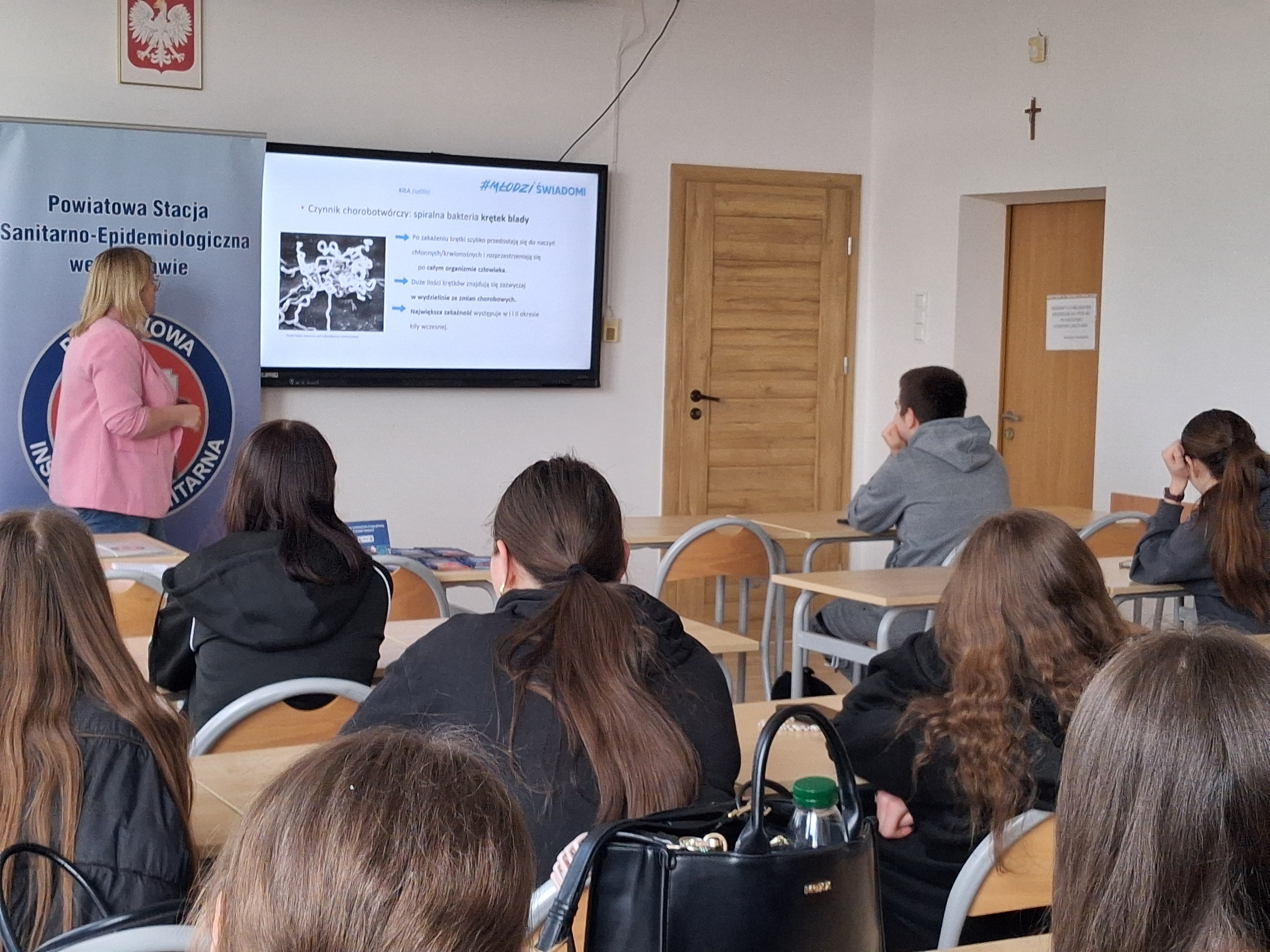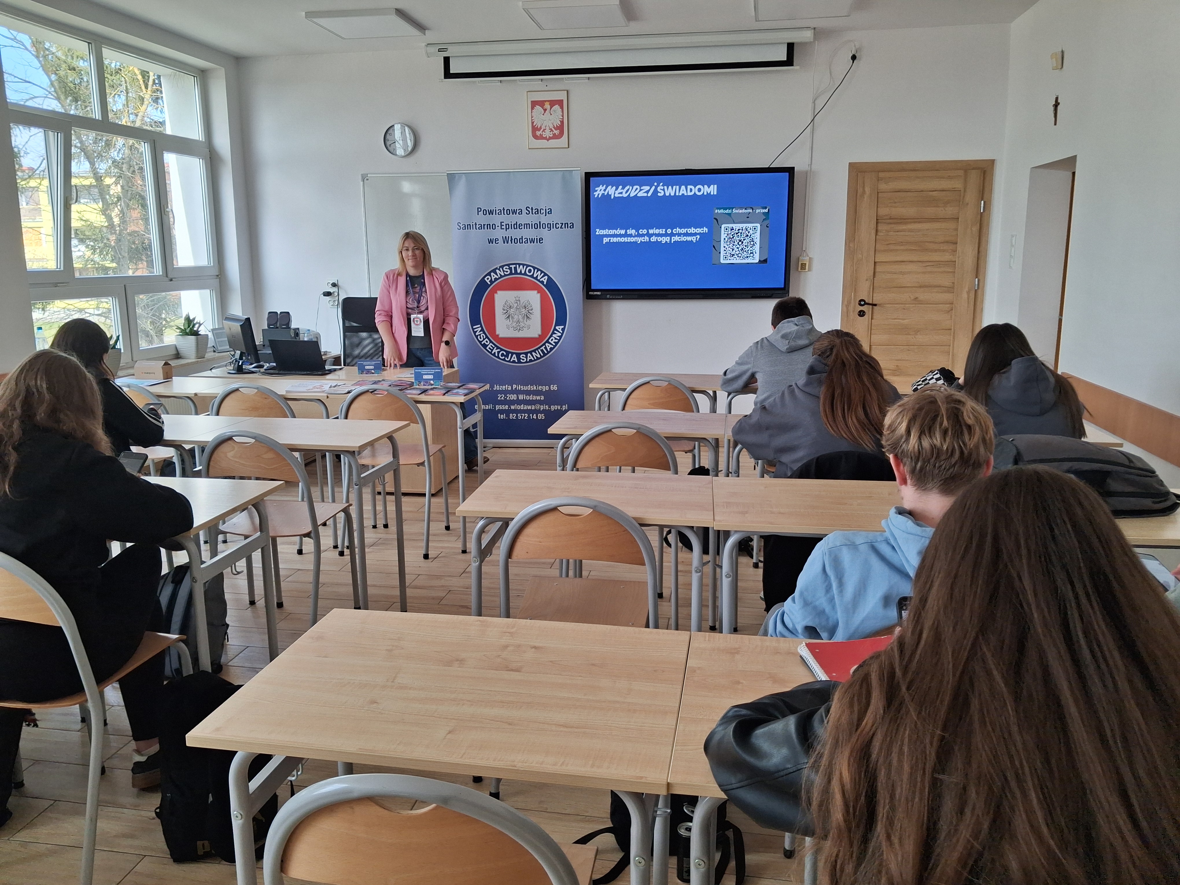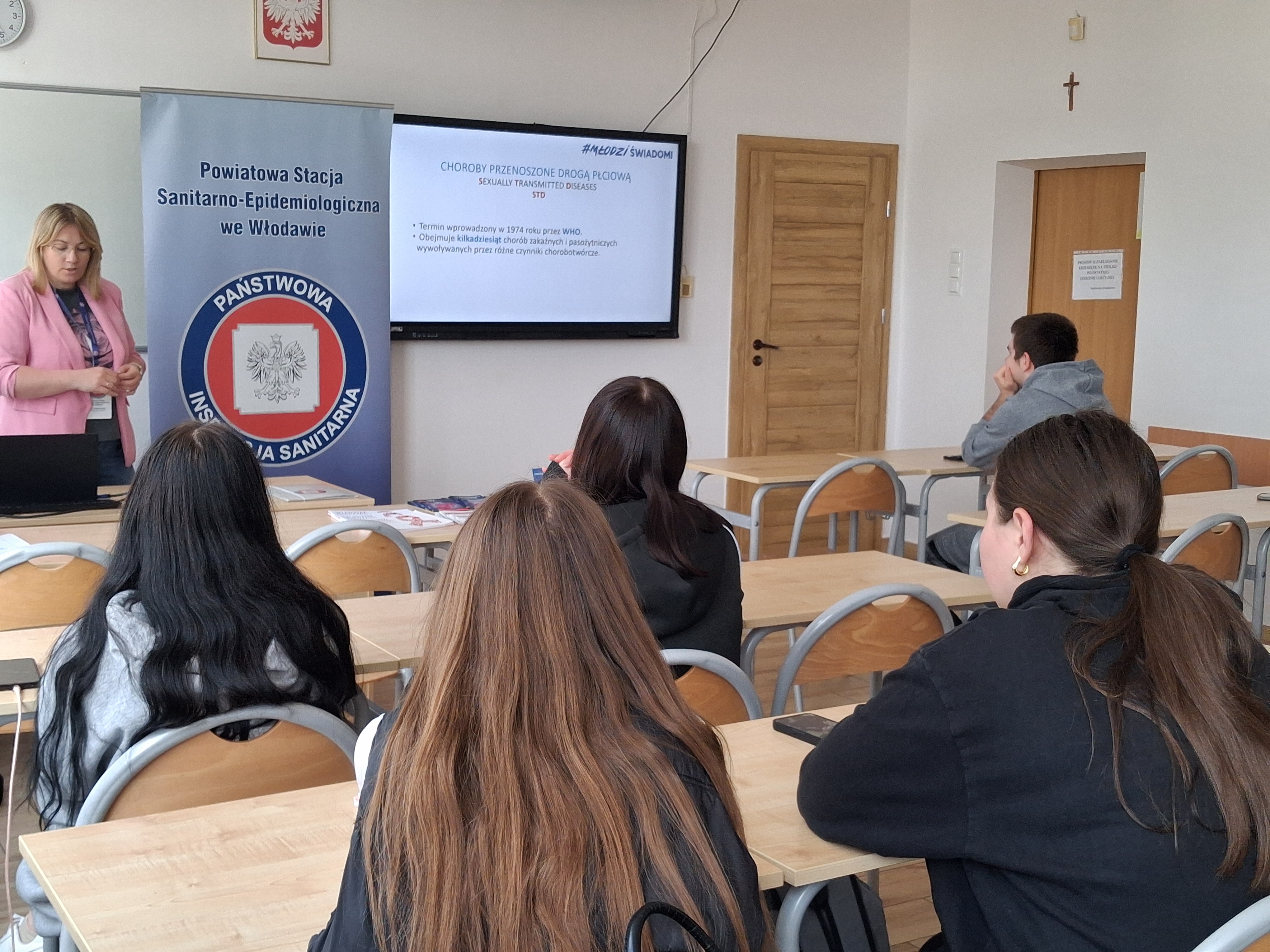 W poniedziałek 23 marca 2026r. odbyło się spotkanie uczniów klasy 4MT z pracownikiem Powiatowej Stacji Sanitarno-Epidemiologicznej we Włodawie Panią Ewą Kędzierską. Celem spotkania była realizacja nowego programu edukacyjnego dla młodzieży na temat chorób przenoszonych drogą płciową pt. "# Młodzi Świadomi ".