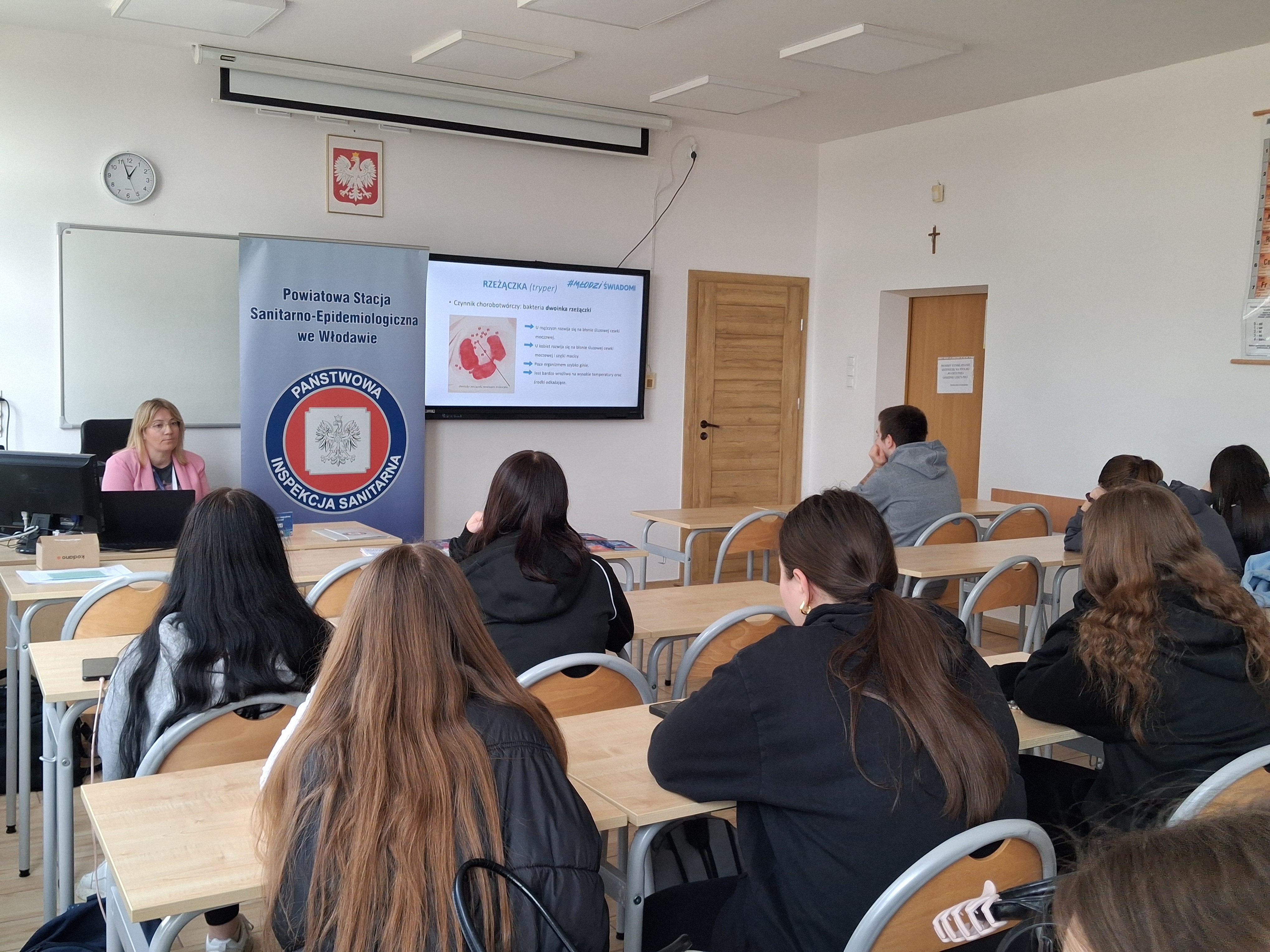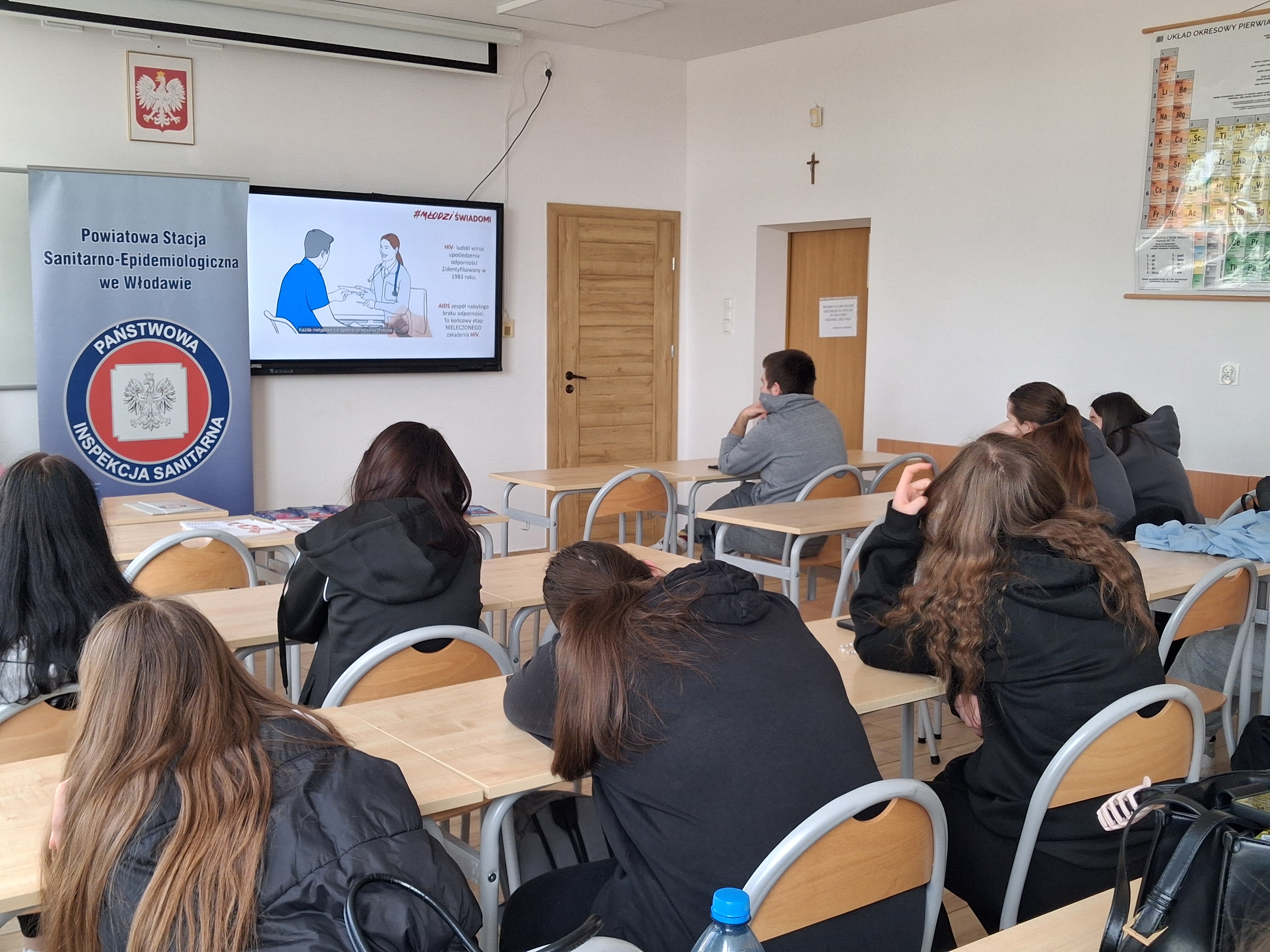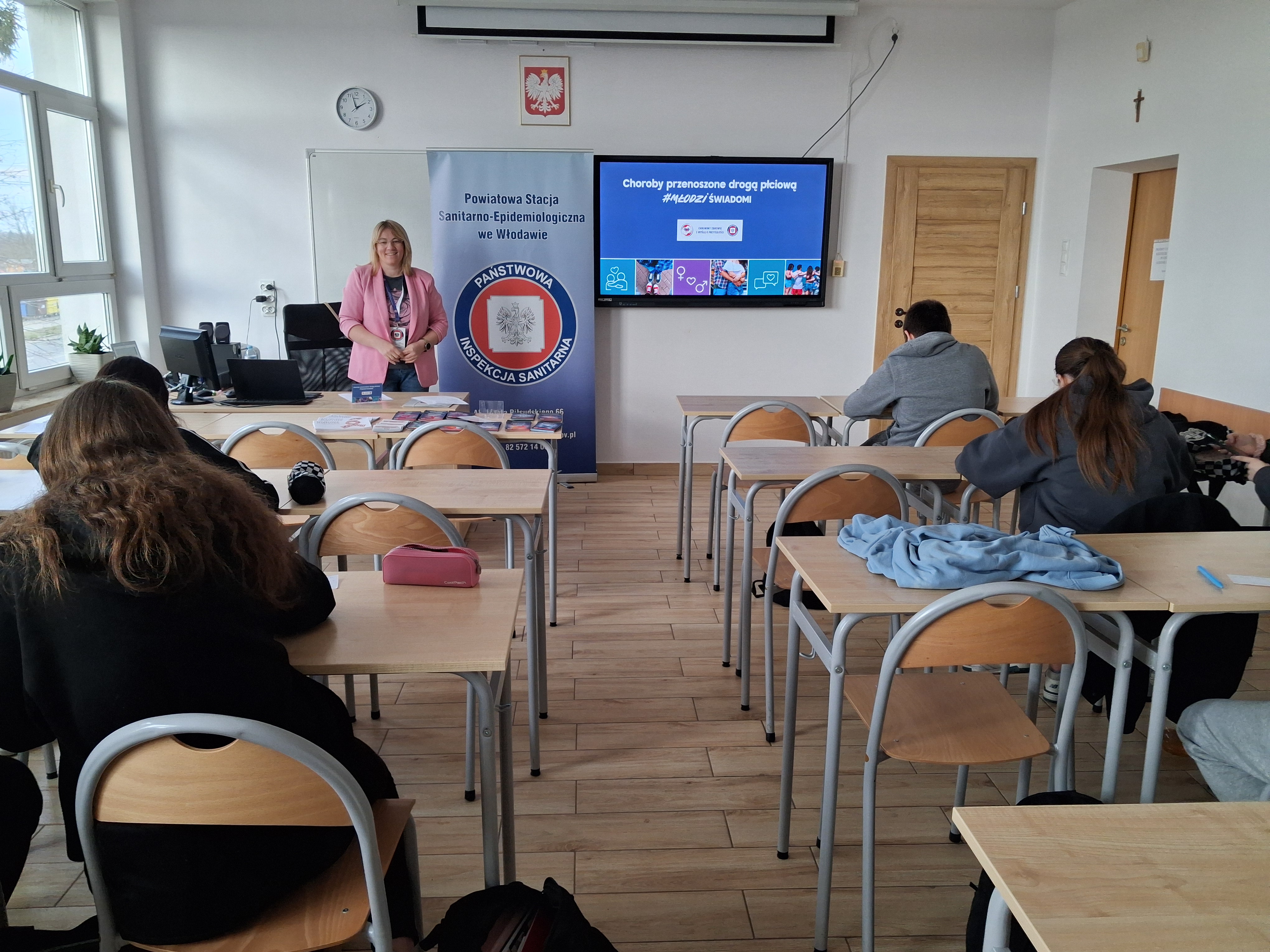 W poniedziałek 23 marca 2026r. odbyło się spotkanie uczniów klasy 4MT z pracownikiem Powiatowej Stacji Sanitarno-Epidemiologicznej we Włodawie Panią Ewą Kędzierską. Celem spotkania była realizacja nowego programu edukacyjnego dla młodzieży na temat chorób przenoszonych drogą płciową pt. "# Młodzi Świadomi ".