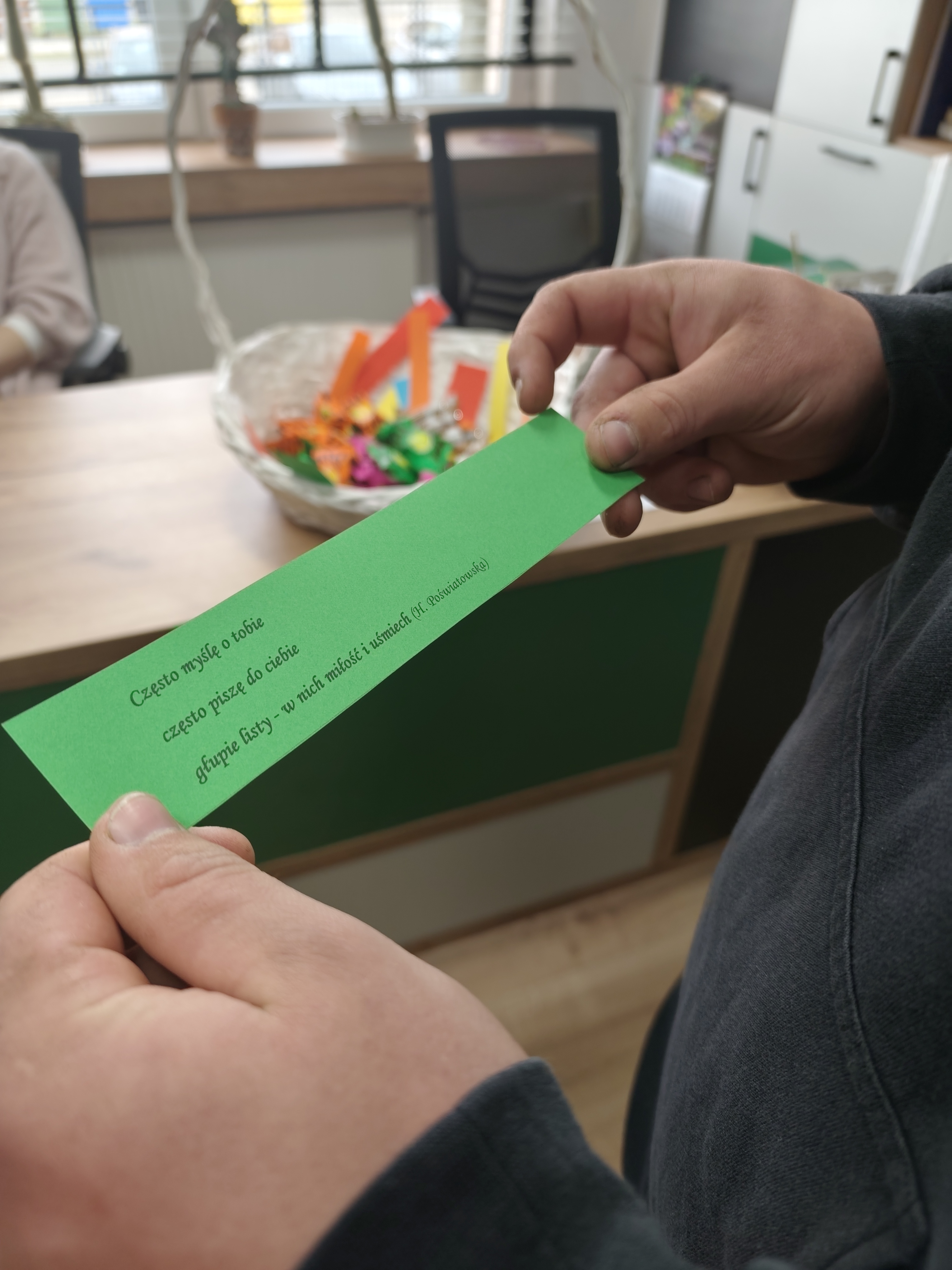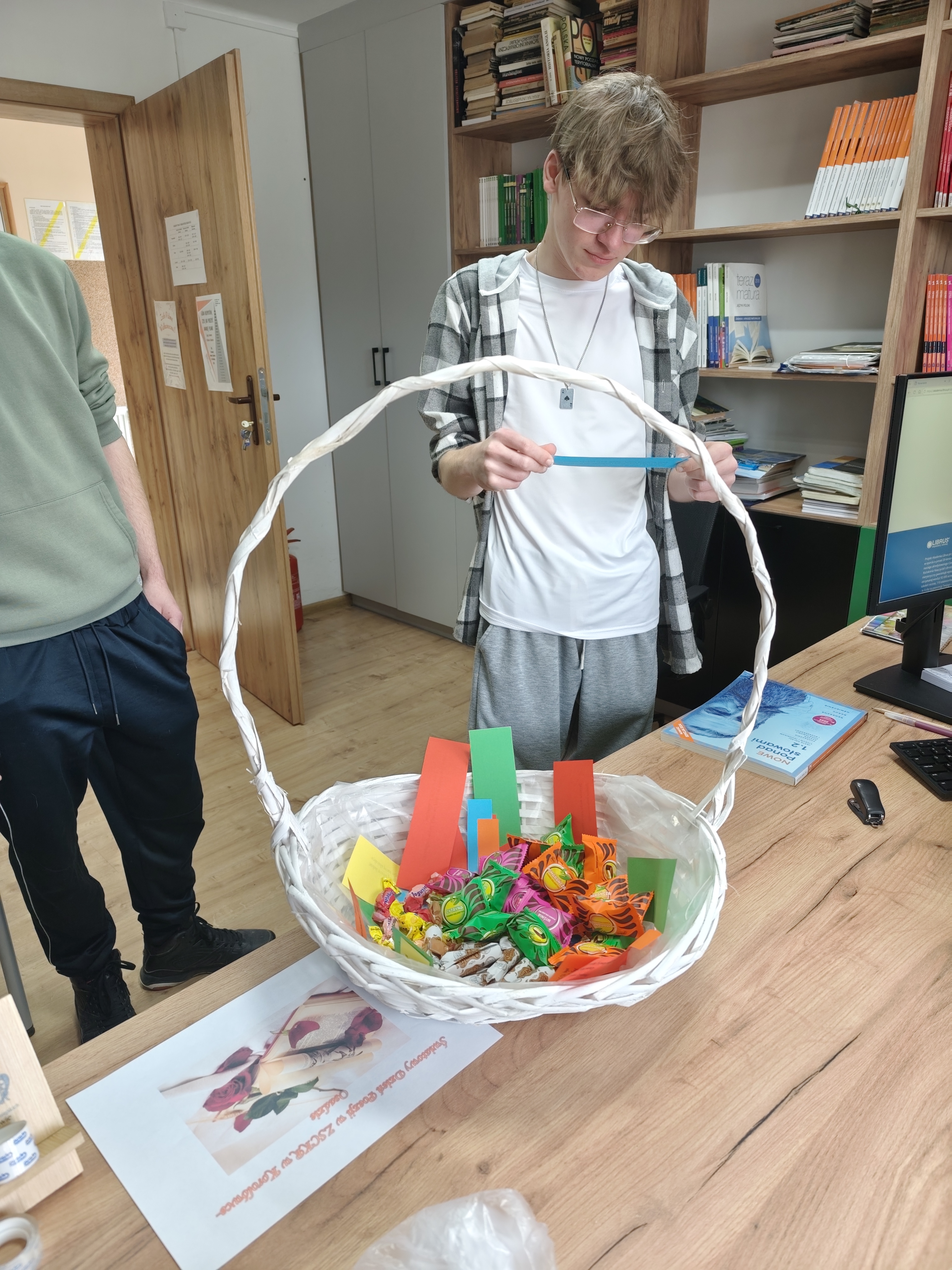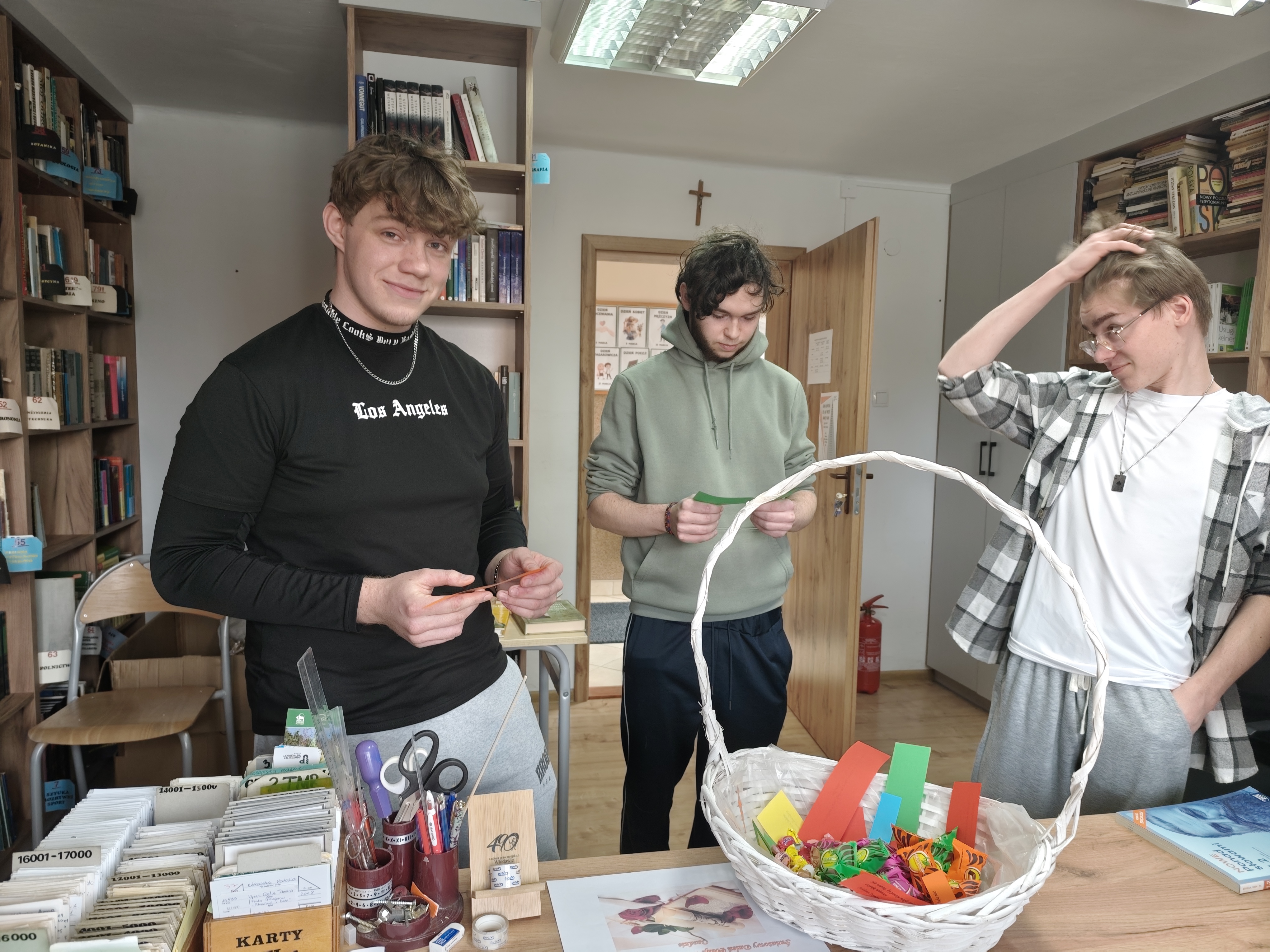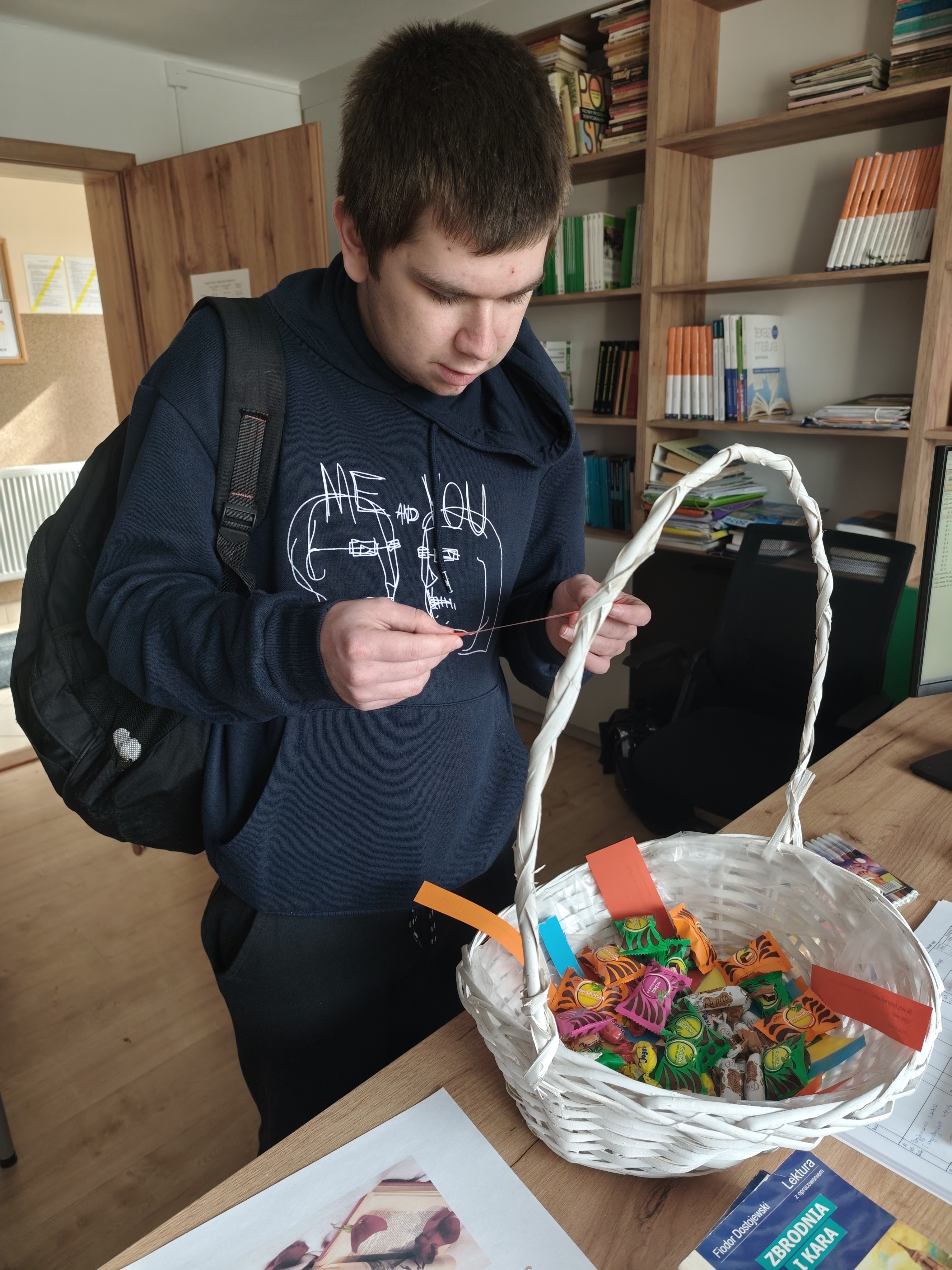 Dnia 24.03.2026 roku w bibliotece szkolnej odbyło się spotkanie z okazji Światowego Dnia Poezji. W wydarzeniu wzięli udział uczniowie różnych klas, którzy mieli okazję w ciekawy i angażujący sposób obcować z literaturą. Podczas spotkania uczniowie losowali kartki zawierające cytaty pochodzące z różnych utworów poetyckich i dzielili się swoimi refleksjami na temat wylosowanych fragmentów. Kolejnym elementem było stworzenie rankingu ulubionych poetów. Spotkanie przebiegło w miłej i twórczej atmosferze. Było doskonałą okazją do popularyzowania poezji oraz rozwijania zainteresowań czytelniczych wśród młodzieży.