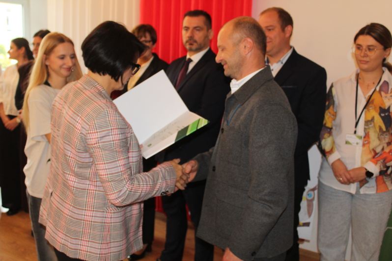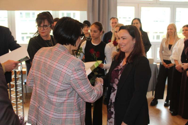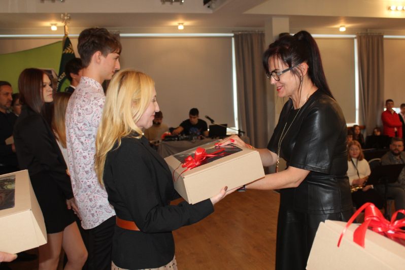 Podczas tegorocznej uroczystości nie zabrakło wzruszających słów i życzeń złożonych przez panią Dyrektor Iwonę Pera, która podkreśliła, przywołując słowa Jana Pawła II, że bycie nauczycielem to ważna misja, polegająca na rozsiewaniu ziarna, będącego symbolem nauki, wiedzy i umiejętności przekazywanych uczniom. W obecności młodzieży i zaproszonych gości, podziękowała także swoim pracownikom, wręczając Nagrodę z okazji Dnia Edukacji Narodowej. Niewątpliwie to wyróżnienie jest motywacją do dalszej pracy, by tak jak dotychczas, odnosić sukcesy zawodowe.