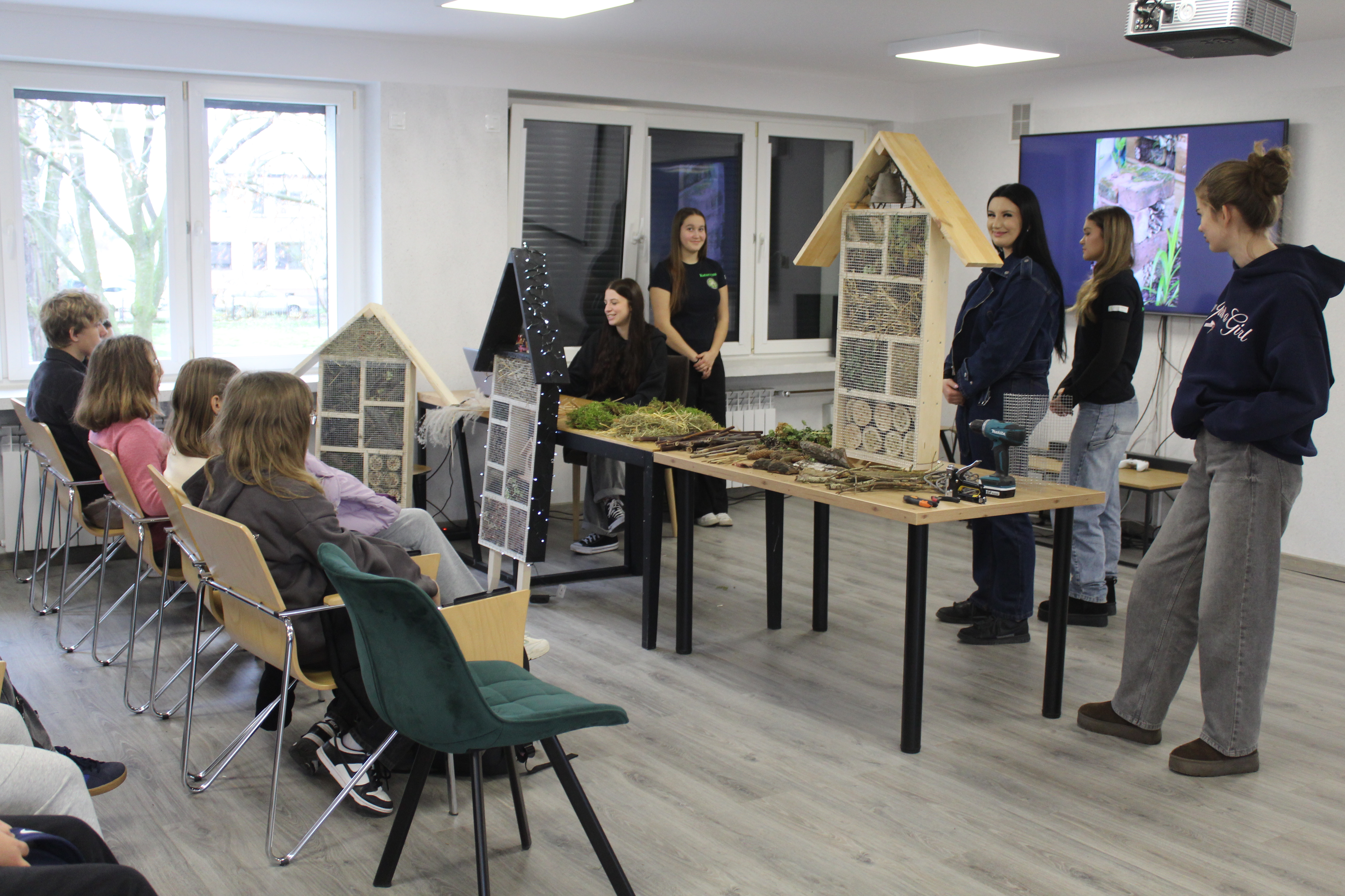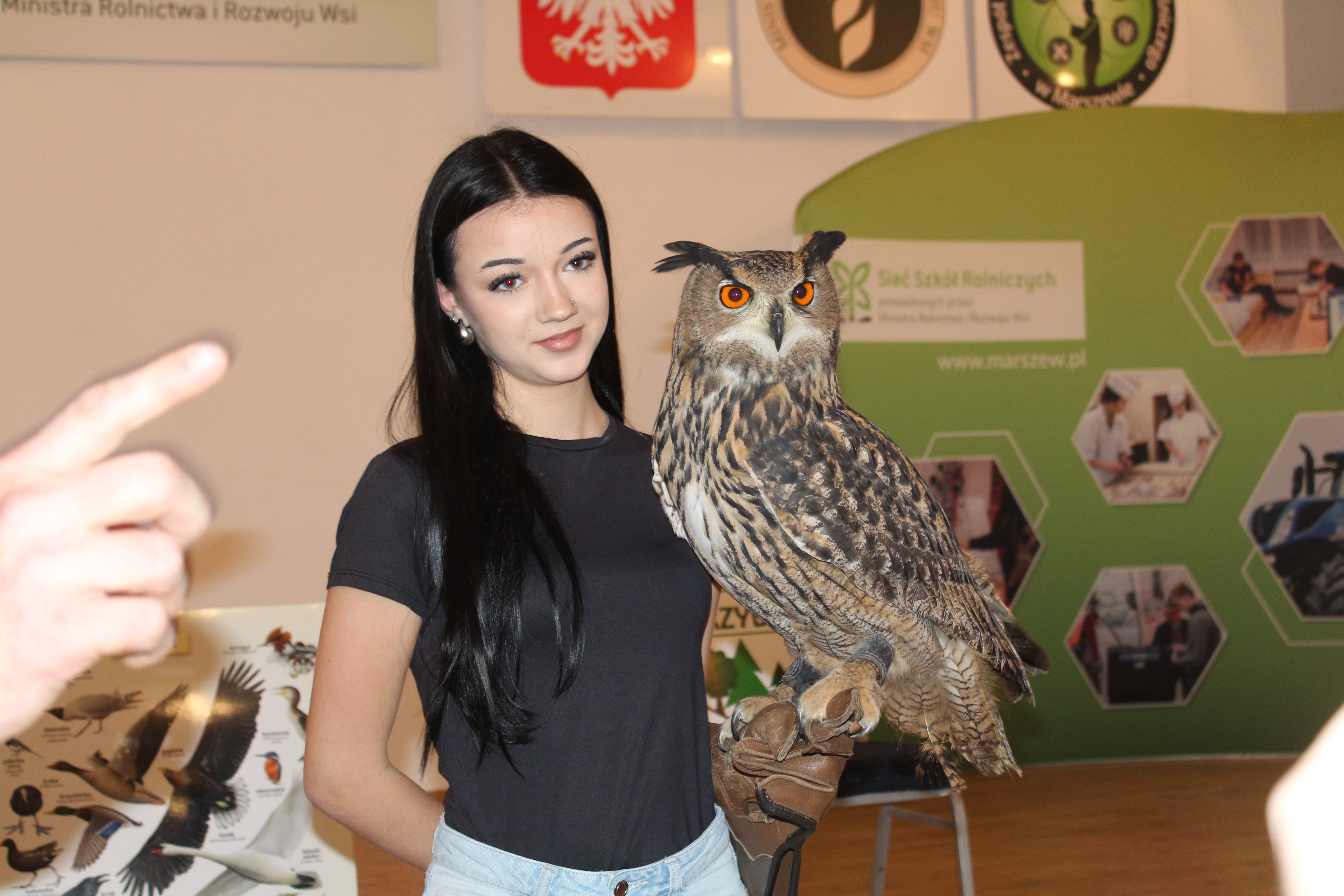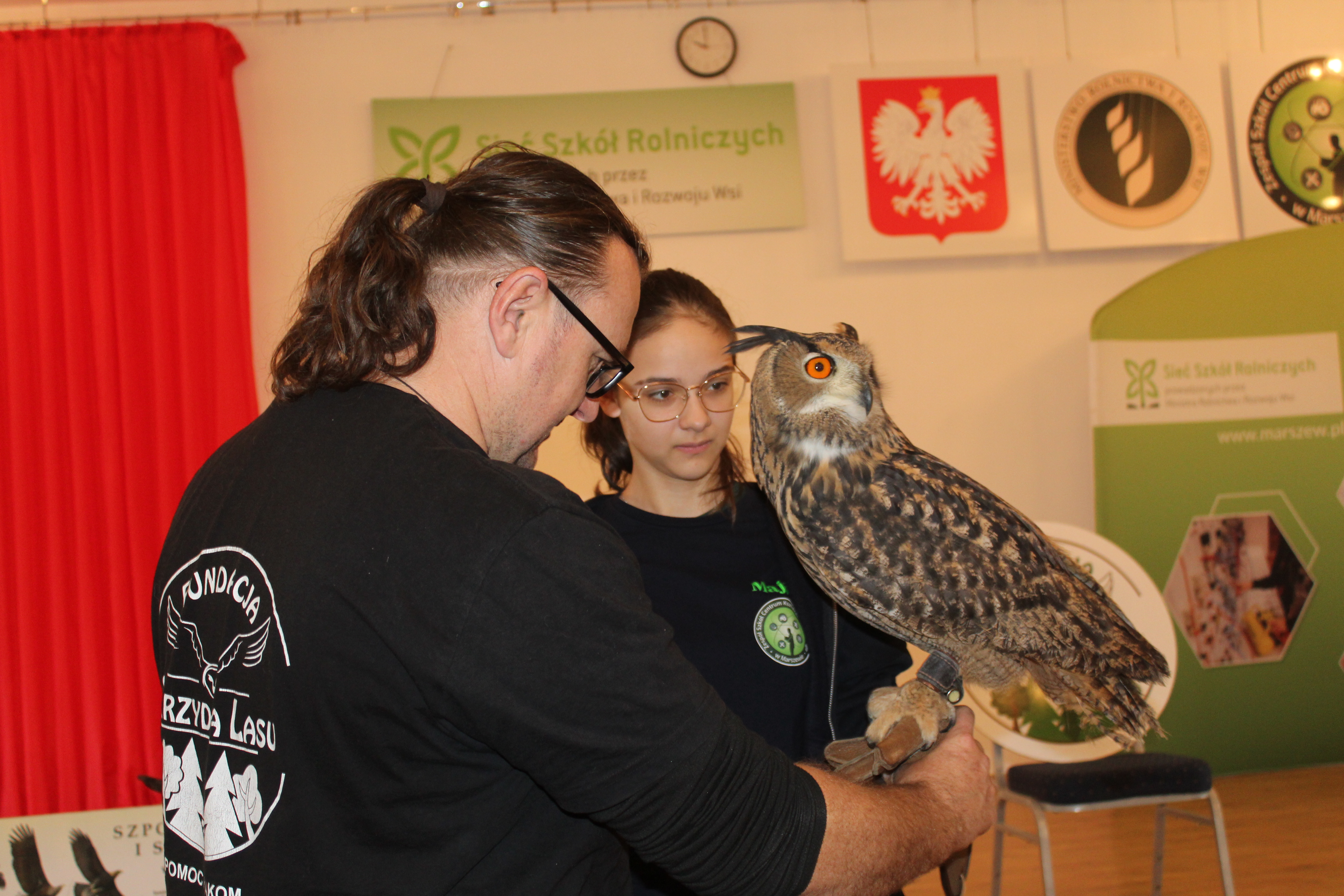 Pierwszym punktem programu był pokaz, podczas którego uczniowie mieli okazję obserwować sowy i sokoła wędrownego, połączony z wykładem. Obie części prowadził Pan Piotr Nadolski, miłośnik ptaków drapieżnych i wodnych, który na co dzień leczy zwierzęta za pomocą aviterapii w stworzonym przez siebie dla nich azylu. Pasjonat tłumaczył m. in. jak rozpoznawać poszczególne gatunki, na co zwracać uwagę podczas obserwacji, jakie są główne zagrożenia dla ptasich siedlisk oraz jaki wpływ na populację tych zwierząt ma człowiek, kończąc wskazaniem praktycznych działań jakie można podjąć, by wesprzeć ochronę ptaków. Ta inicjatywa spotkała się z bardzo pozytywnym odbiorem przez młodzież, w końcu niecodziennie ma się okazję trzymać np. na ręku pokaźnych rozmiarów sowę.