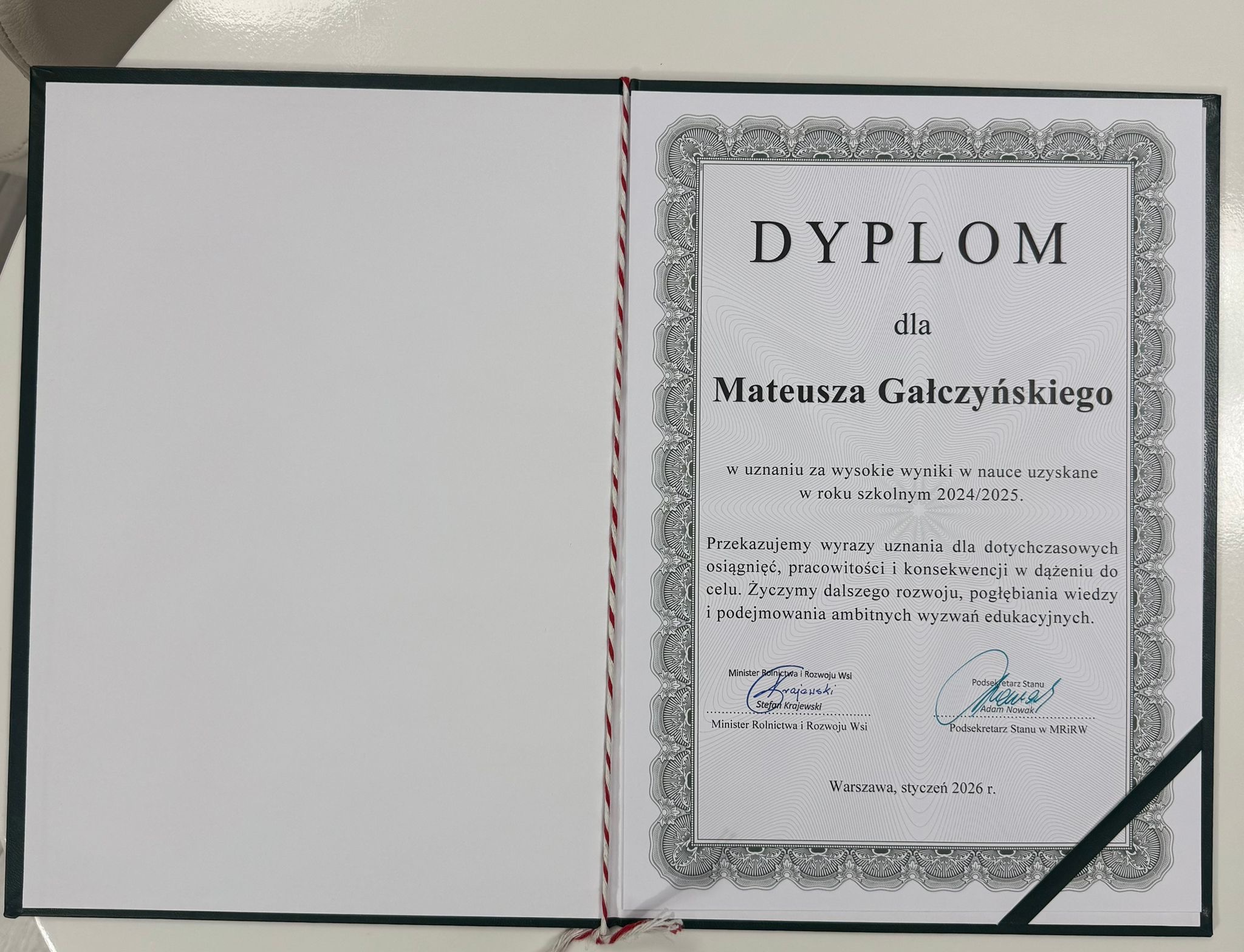 12 stycznia 2026 roku w Warszawie odebrali z rąk wiceministra Adama Nowaka nagrodę Ministra Rolnictwa i Rozwoju Wsi za najwyższe wyniki w nauce w roku szkolnym 2024/2025.