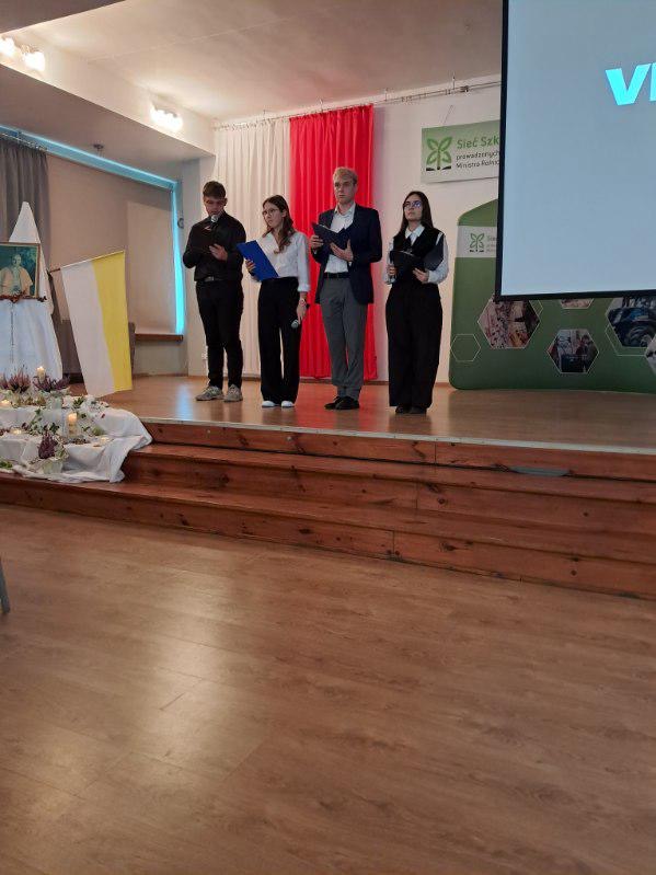 Dziękuję księdzu Karolowi, koleżance Paulinie i koledze Łukaszowi. Nie mogę pominąć zacnej publiczności; nauczycieli oraz młodzieży, która godnie uczciła pamięć św. Jana Pawła II i gromkimi brawami nagrodziła występujących. Na koniec pragnę wyrazić wdzięczność dyrektor szkoły za przywrócenie obchodów Dnia Papieskiego, dzięki czemu możemy oddawać należną cześć Jego pamięci!