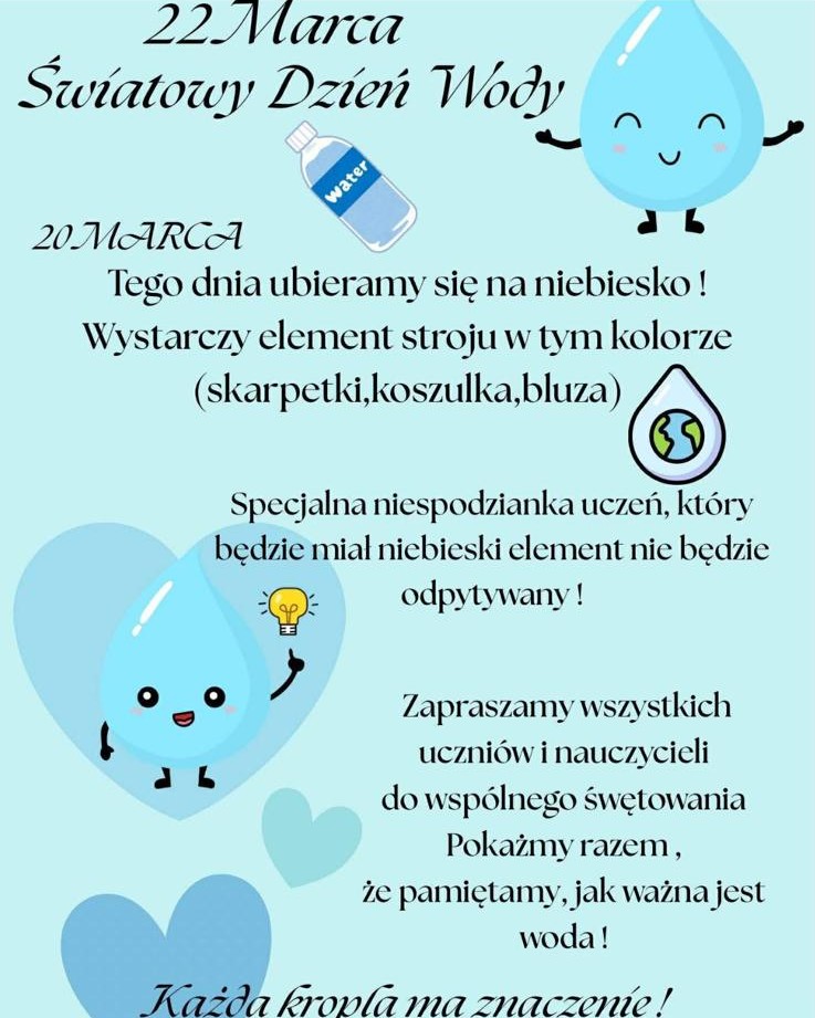 W naszej szkole uczniowie i nauczyciele pamiętali o Światowym Dniu Wody, dodając niebieskie akcenty do swoich strojów.