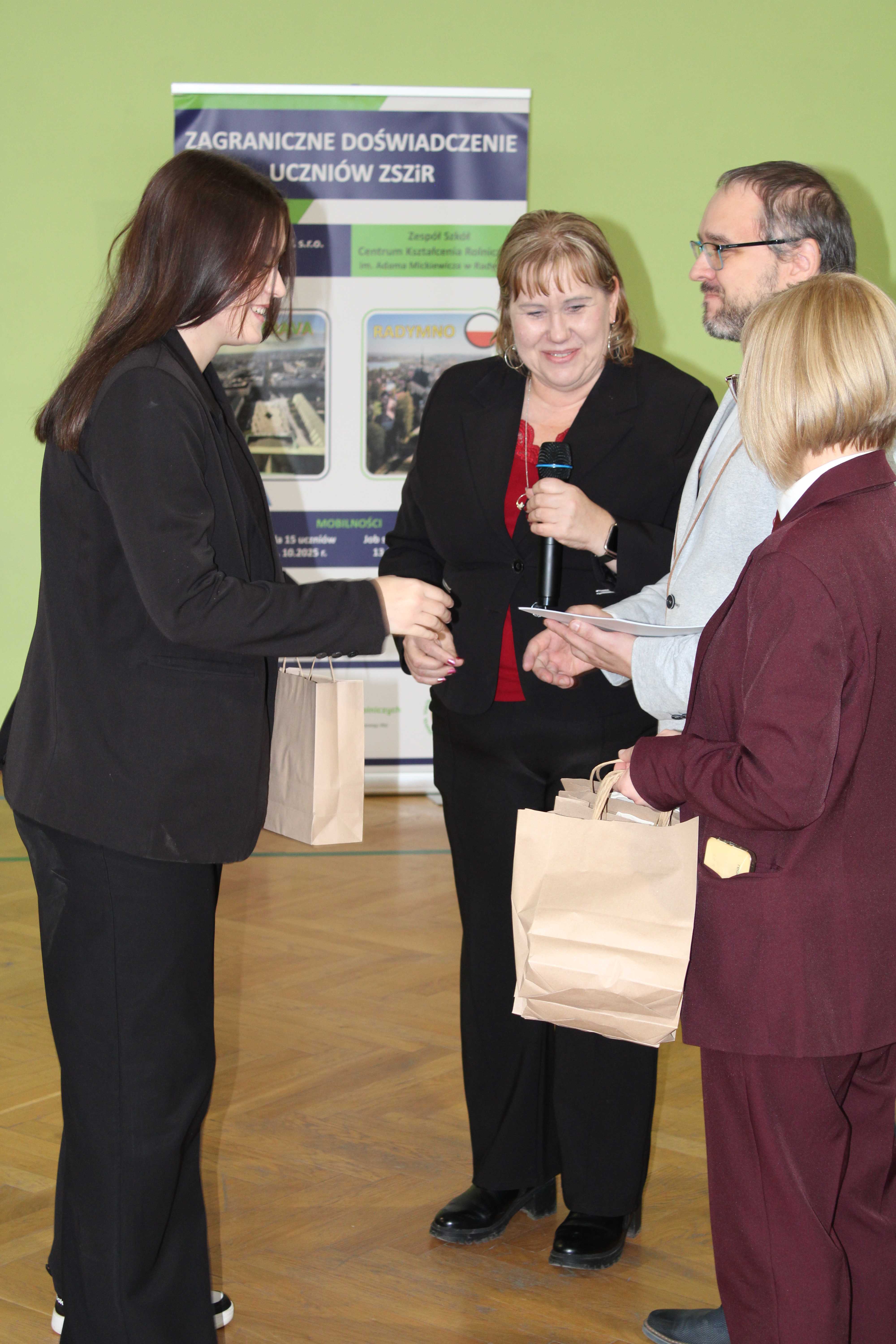 W dniu 26 listopada w naszej szkole obchodzony był Dzień Patrona Szkoły – Adama Mickiewicza. W tym dniu zorganizowano m.in. konkursy związane tematycznie z twórczością Adama Mickiewicza tj. konkurs plastyczny i konkurs recytatorski, w których udział wzięli uczniowie szkół podstawowych powiatu jarosławskiego i powiatu przemyskiego a także uczniowie szkół rolniczych prowadzonych przez Ministra Rolnictwa i Rozwoju Wsi. Uroczysta gala wręczenia nagród była okazją do zaprezentowania, wśród uczniów i ich opiekunów z w/w szkół, a także całej społeczności szkolnej naszej szkoły, projektu pn. Zagraniczne doświadczenie zawodowe uczniów ZSZiR”, a także przedstawienia jego rezultatów. Po prezentacji, wśród osób obecnych, przeprowadzony został, krótki quiz z omówionych zagadnień projektowych, a zwycięzcom quizu wręczono nagrody.