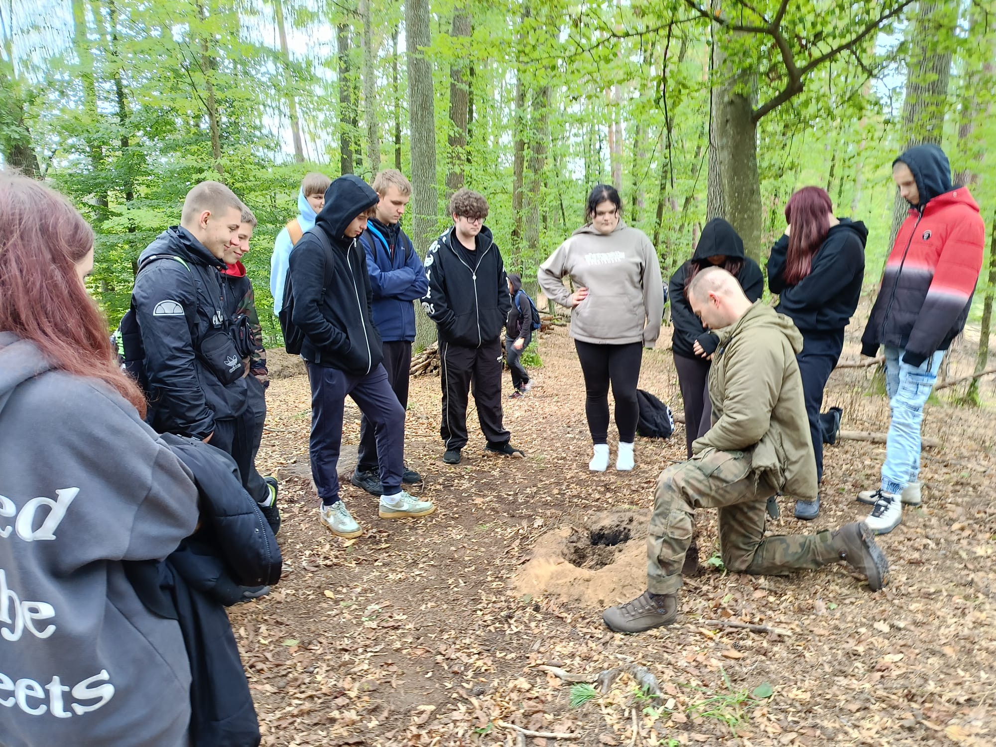 Uczniowie poznali różne sposoby budowy schronienia z wykorzystaniem dostępnych materiałów przyniesionych ze sobą lub znalezionych w lesie, a także ukształtowania terenu, okopy, zagłębienia. Dowiedzieli się jakie mamy sposoby pozyskiwania i filtrowania wody w warunkach trudnych, aby była zdatna do picia. Na koniec każda z grup próbowała rozpalić ognisko za pomocą krzesiwa. Opieķę sprawowały panie Anna Zubrzycka i Dorota Goraj-Przybylska, zajecia przeprowadzili żołnierze z Batalionu Wojsk Obrony Terytorialnej w Jarosławiu.