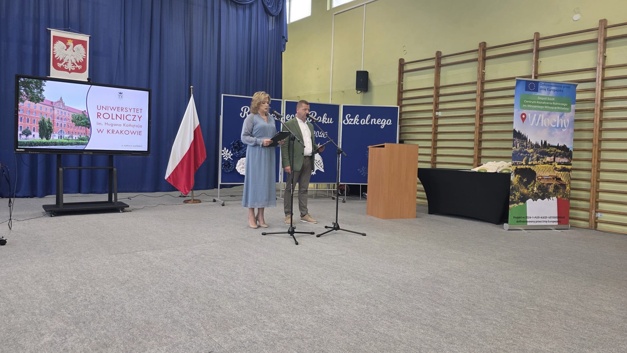 Podczas uroczystości nie zabrakło podziękowań – Pani Dyrektor wręczyła upominki uczniom, którzy aktywnie promowali szkołę w czasie wakacji. Na zakończenie wręczono certyfikaty uczestnikom praktyk zagranicznych w ramach programu Erasmus+.