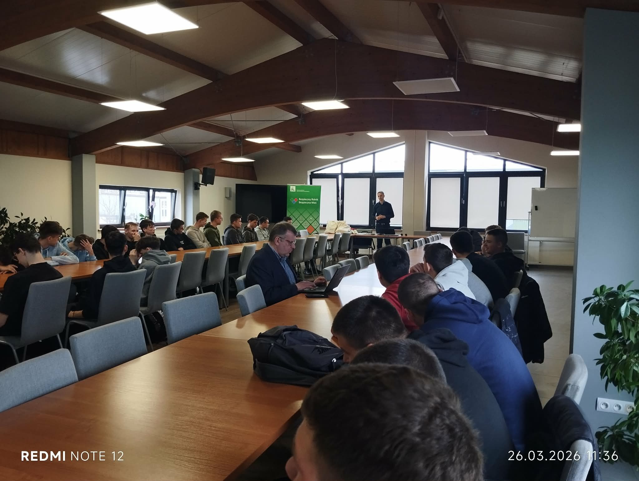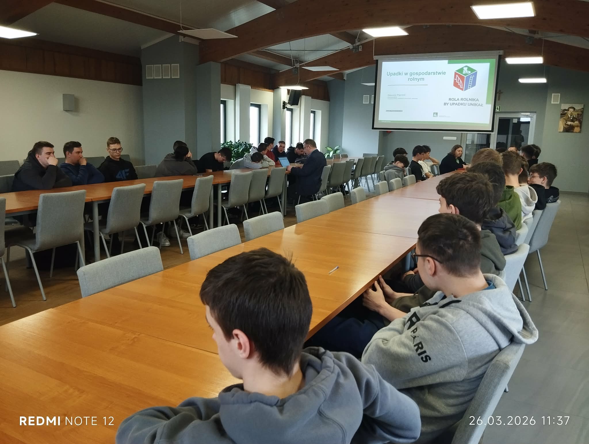 Uczniowie klas 3 technikum kształcącego w zawodzie technik rolnik oraz klasy 3 technikum kształcącego w zawodzie technik mechanizacji rolnictwa i agrotroniki, w dniu 26 marca 2026 r. uczestniczyli w szkoleniu dotyczącym bezpieczeństwa pracy w rolnictwie.