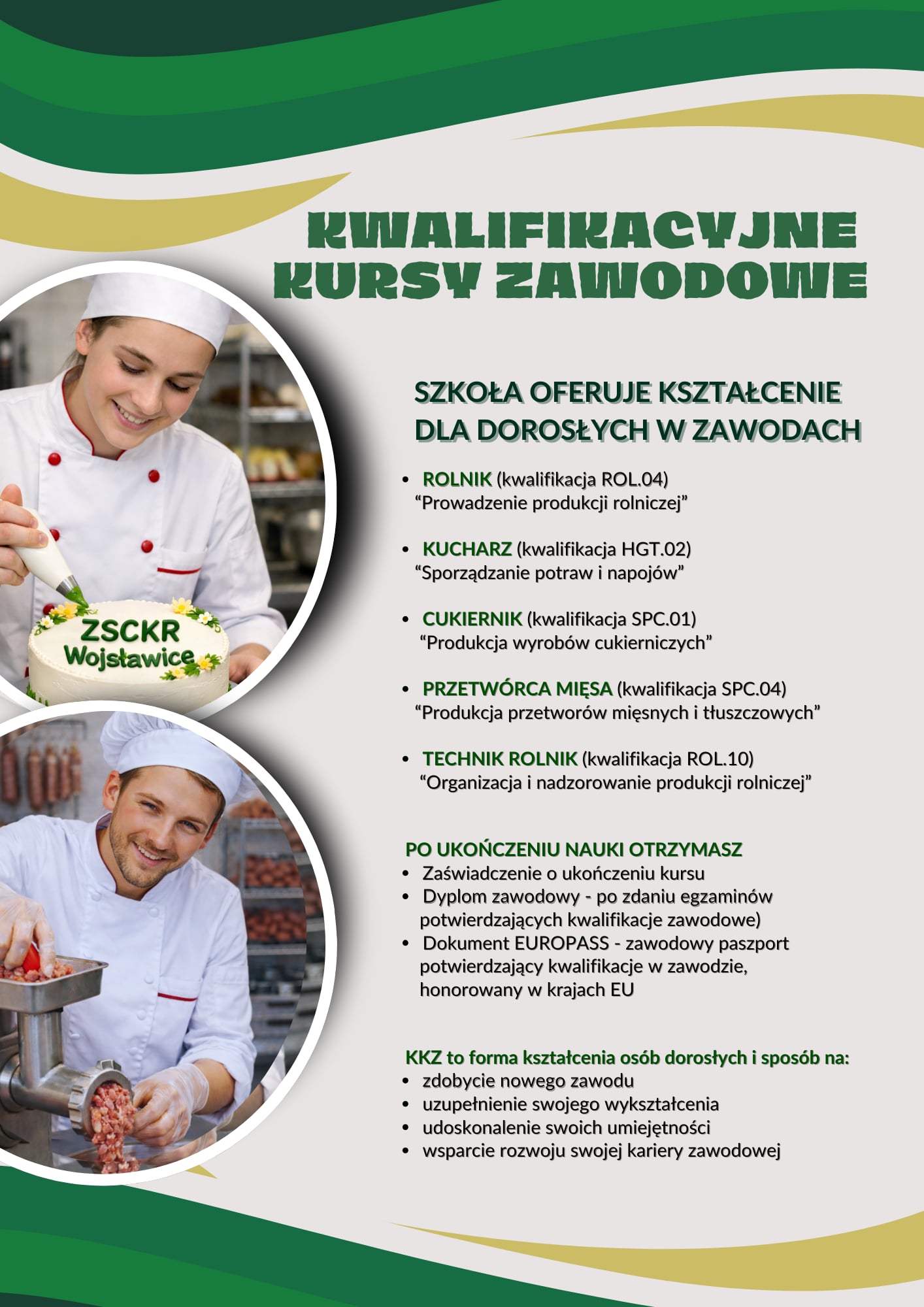 Po ukończeniu KKZ (Kwalifikacyjny Kurs Zawodowy) kursant otrzymuje Zaświadczenie ukończenia kwalifikacyjnego kursu zawodowego wydane zgodnie z Rozporządzeniem Ministra Edukacji Narodowej.