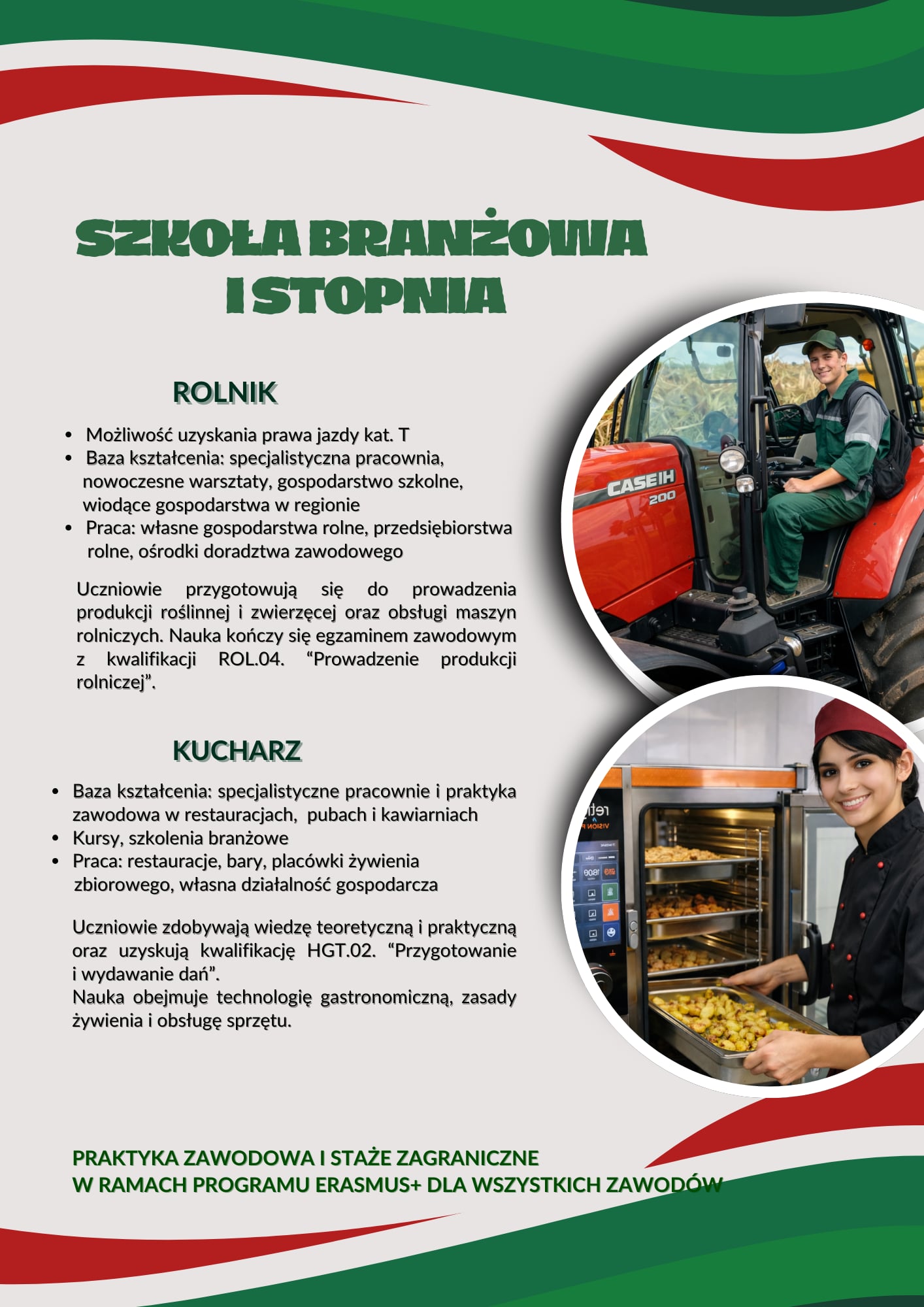 - Baza kształcenia: specjalistyczna pracownia, nowoczesne warsztaty, gospodarstwo szkolne, wiodące gospodarstwa w regionie