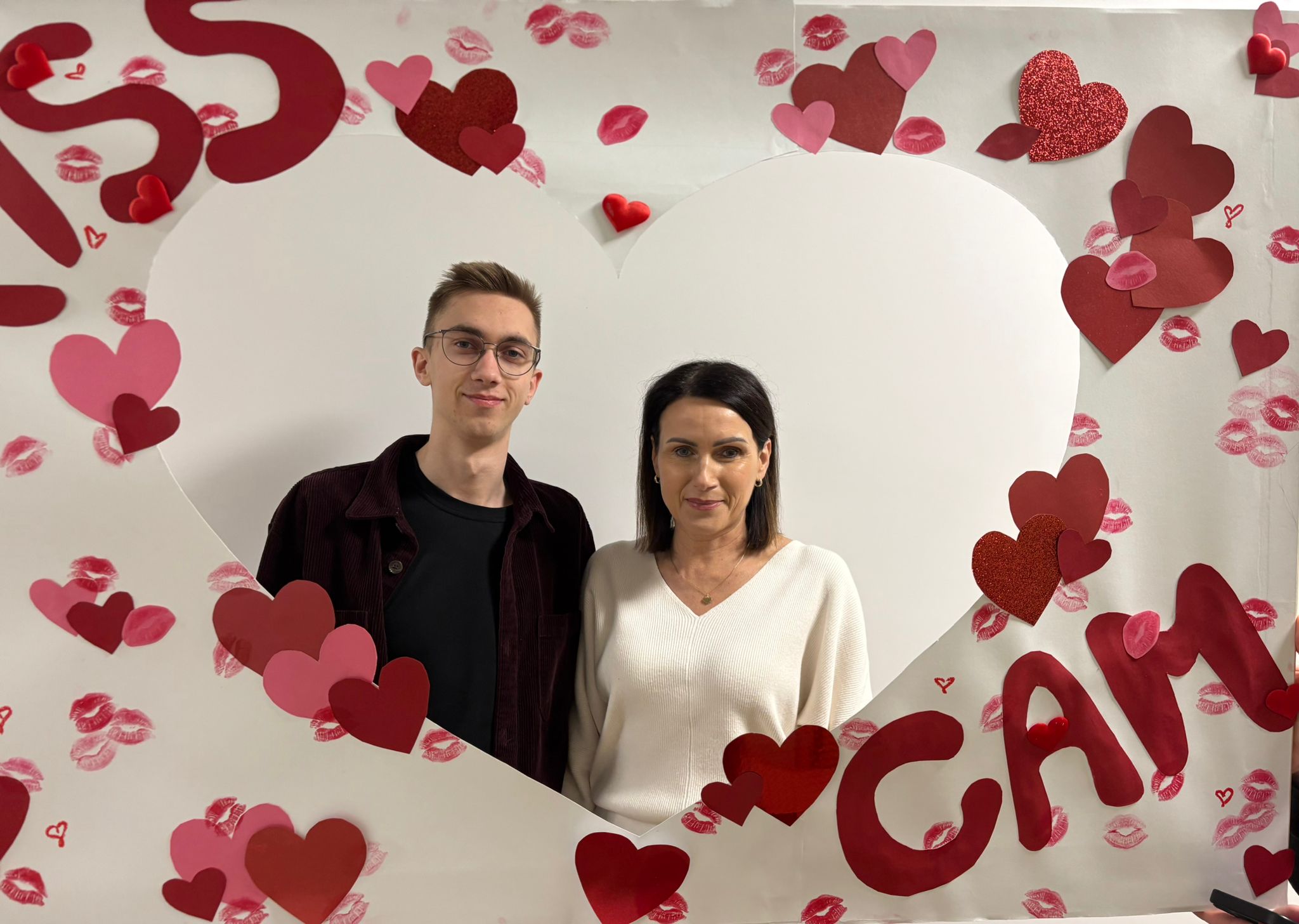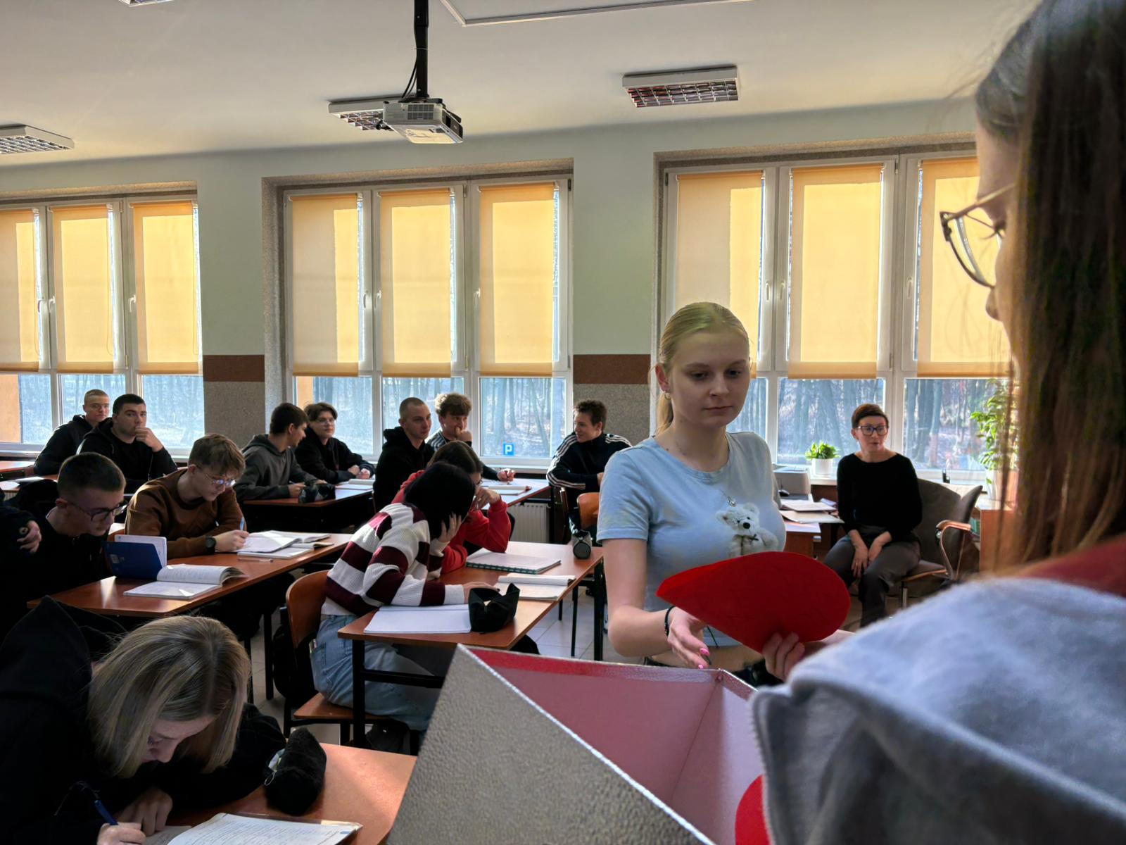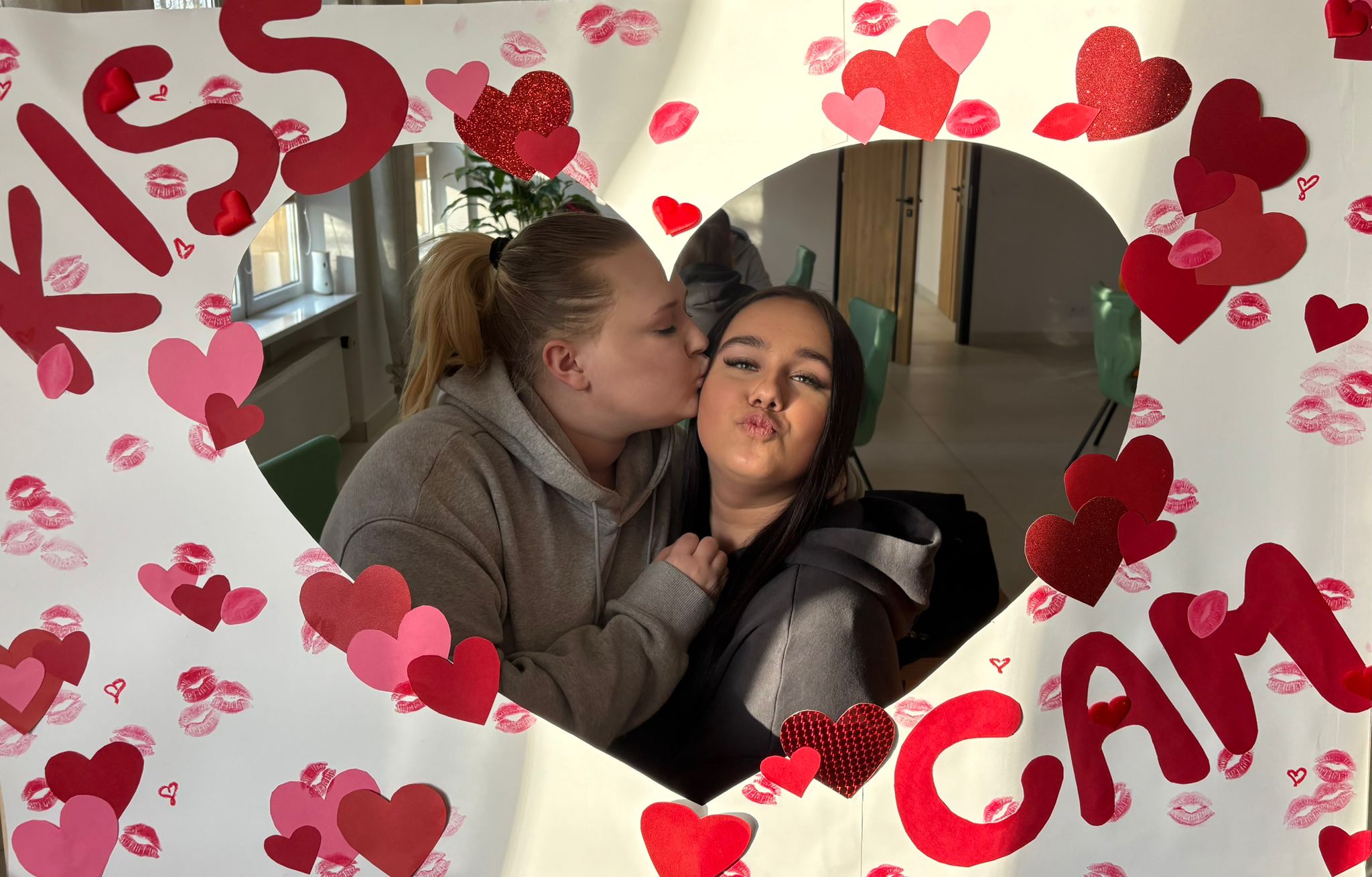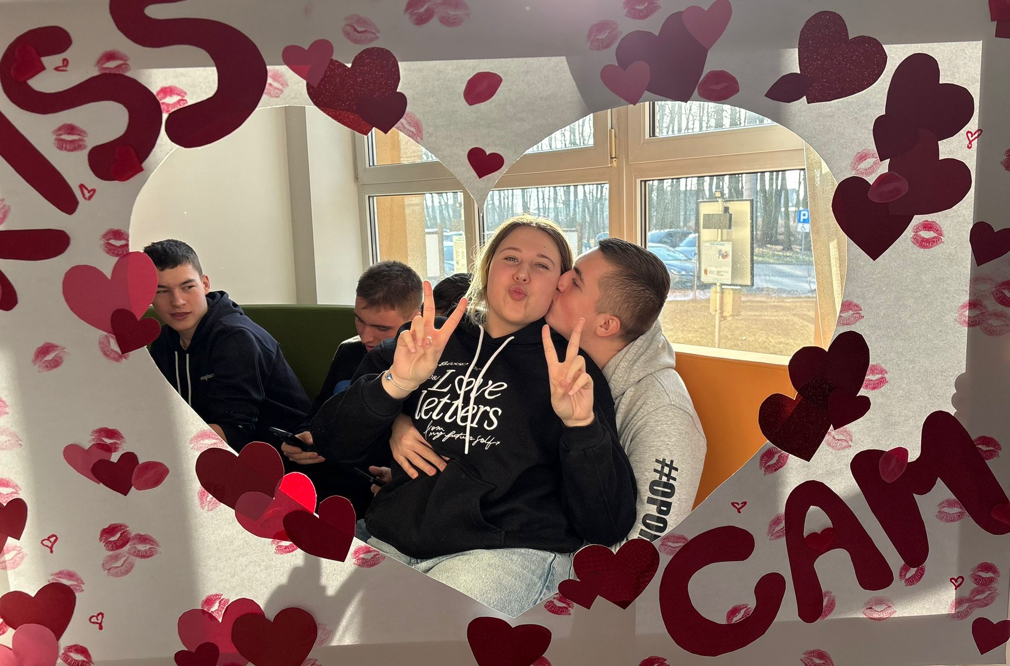 Poczta walentynkowa dostarczyła wiele miłych słów i uśmiechów 😊💖, zabawa „Kiss Cam” przyniosła sporo radości 🎥😘, a nastrojowa muzyka 🎶 umilała wspólnie spędzony czas na przerwach.