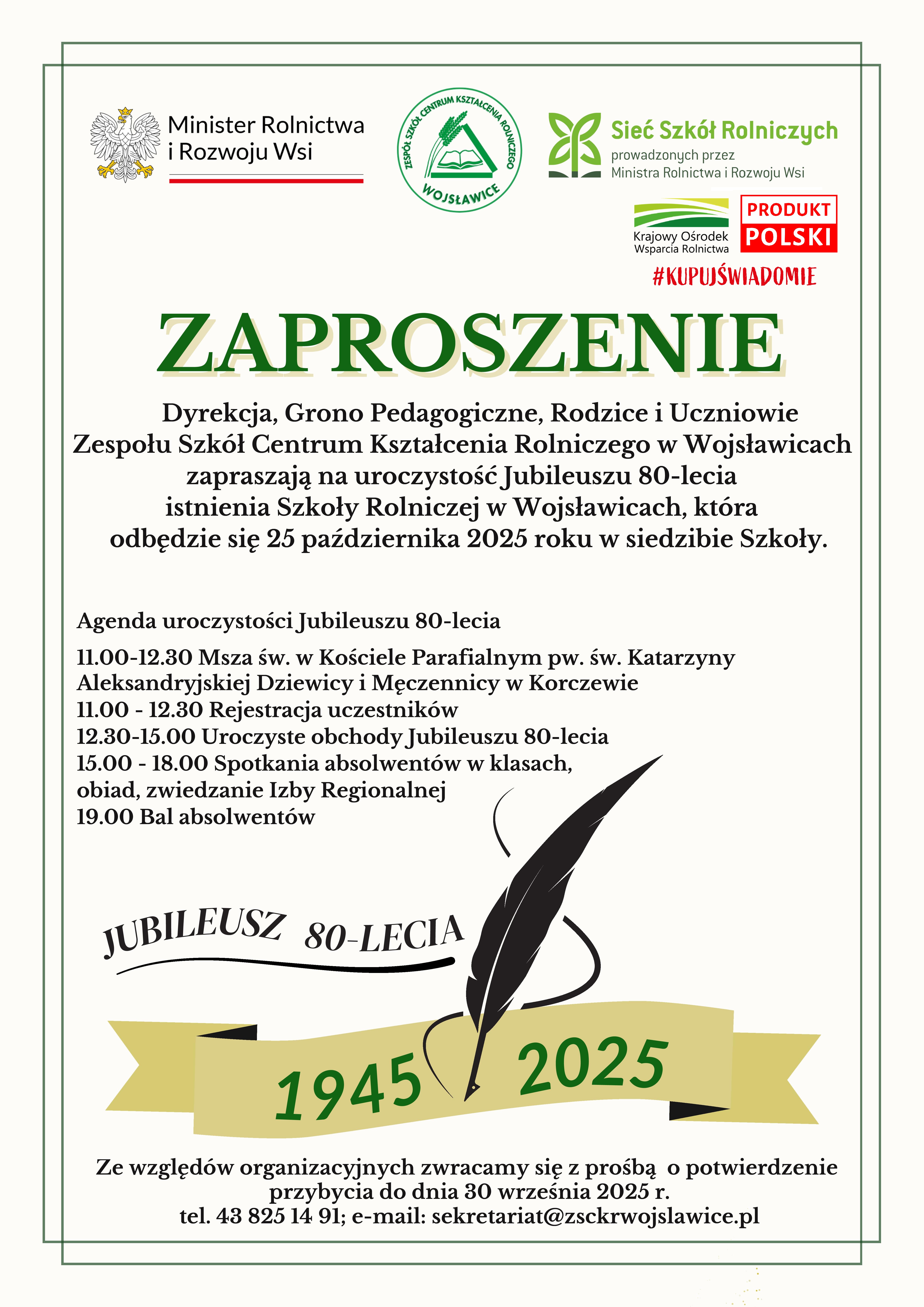 Ze względów organizacyjnych zwracamy się z prośbą o potwierdzenie przybycia do dnia 30 września 2025 r. tel. 43 825 14 91; e-mail: sekretariat@zsckrwojslawice.pl