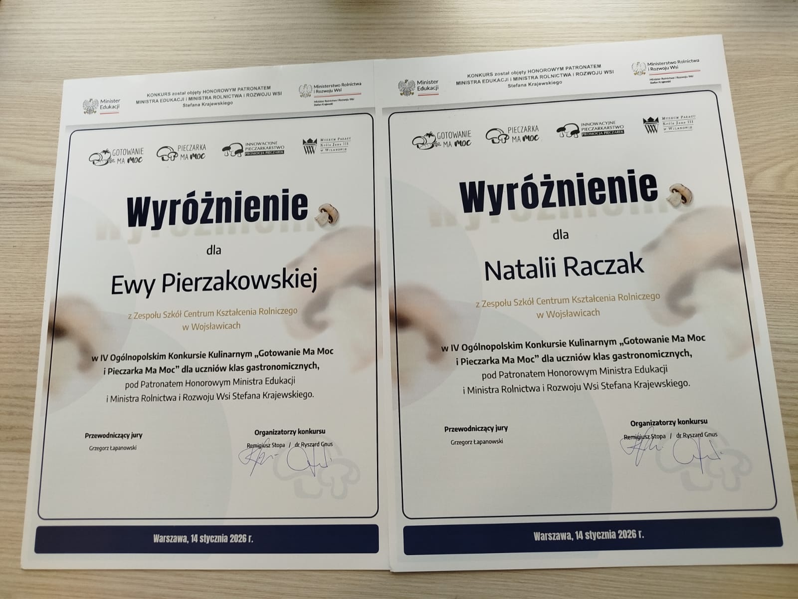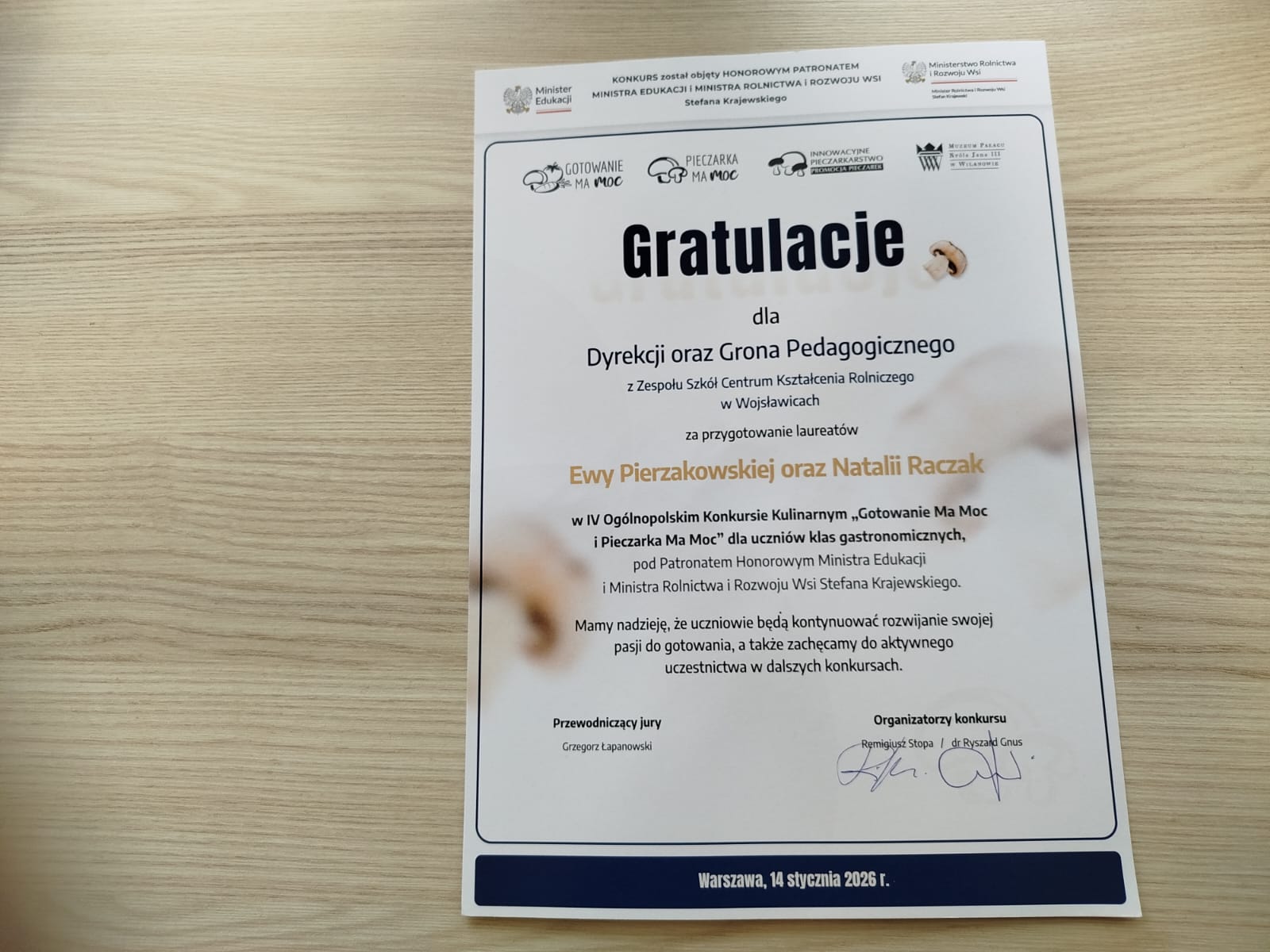 W dniu 14.01.2026r odbył się IV Finał Ogólnopolski konkursu kulinarnego „ Gotowanie Ma Moc i Pieczarka Ma Moc” w Wilanowie , którego celem było promowanie zdrowego stylu życia, kształtowanie prawidłowych nawyków żywieniowych oraz popularyzacja pieczarki jako wartościowego składnika codziennej diety.