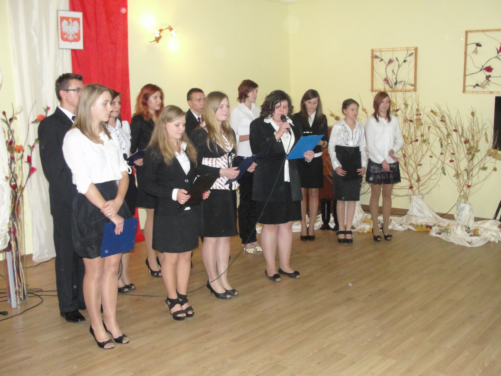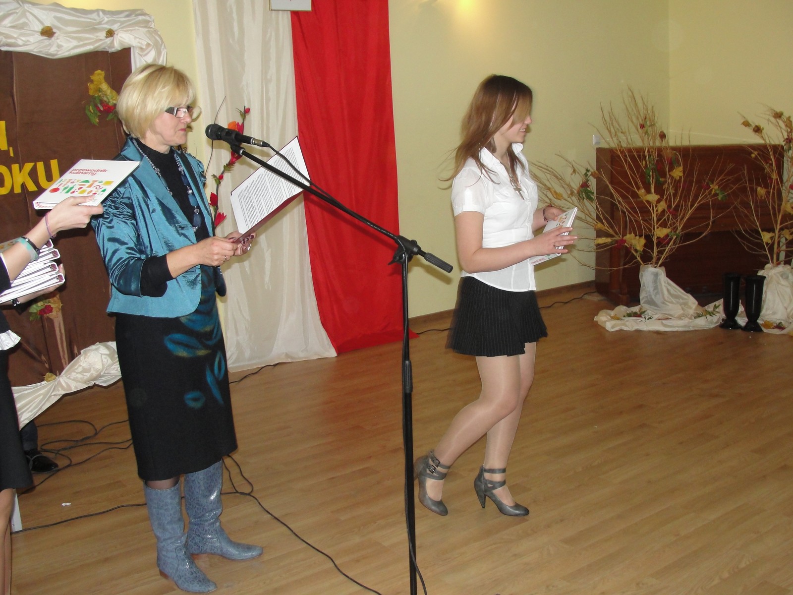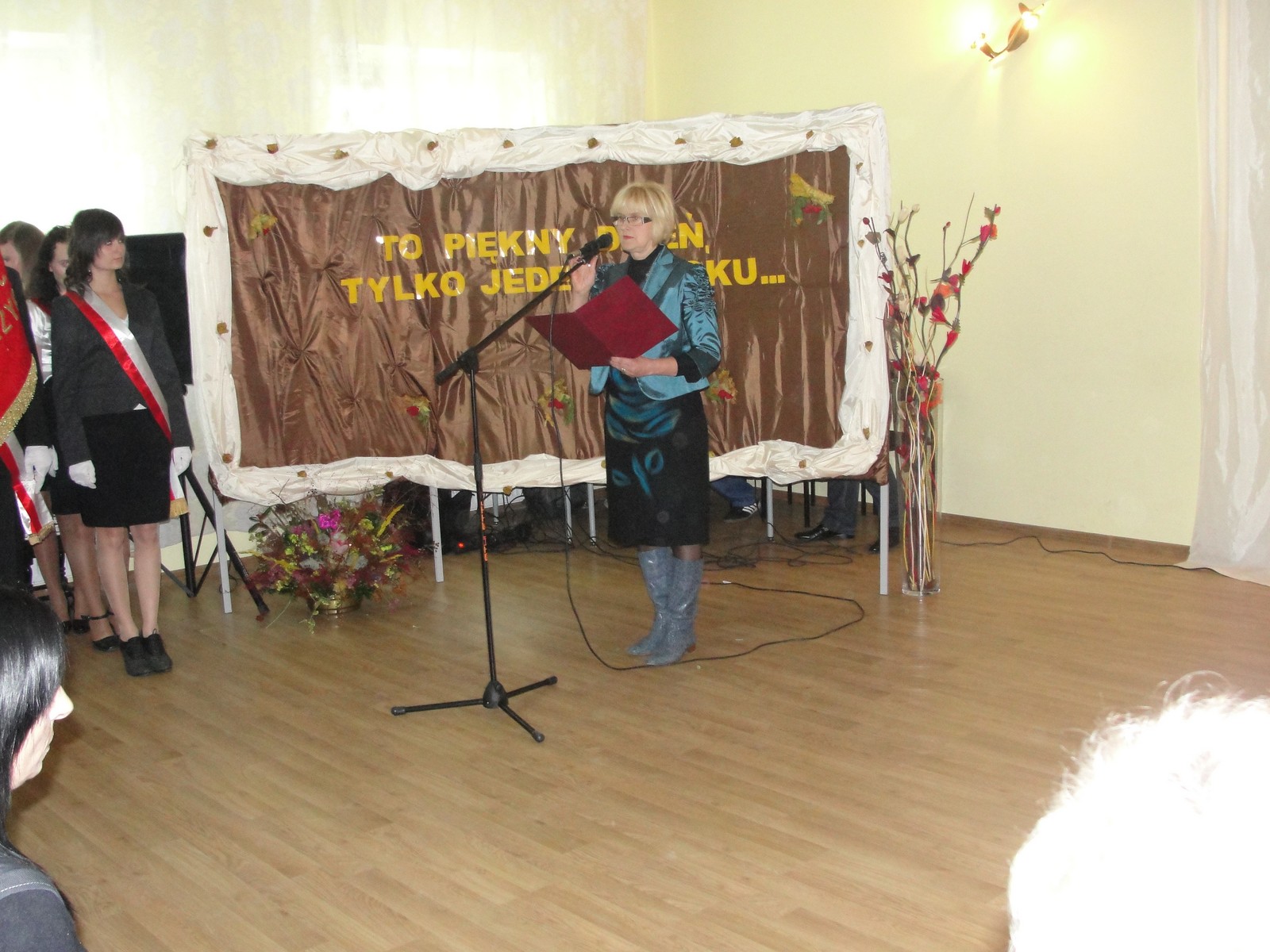 Następnie uczniowie przedstawili montaż słowno-muzyczny, w którym nie brakowało szkolnego humoru, ale też lirycznych podziękowań i życzeń. Nie zabrakło również przybliżenia sylwetki Jadwigi Dziubińskiej, która jest Patronem Szkoły.