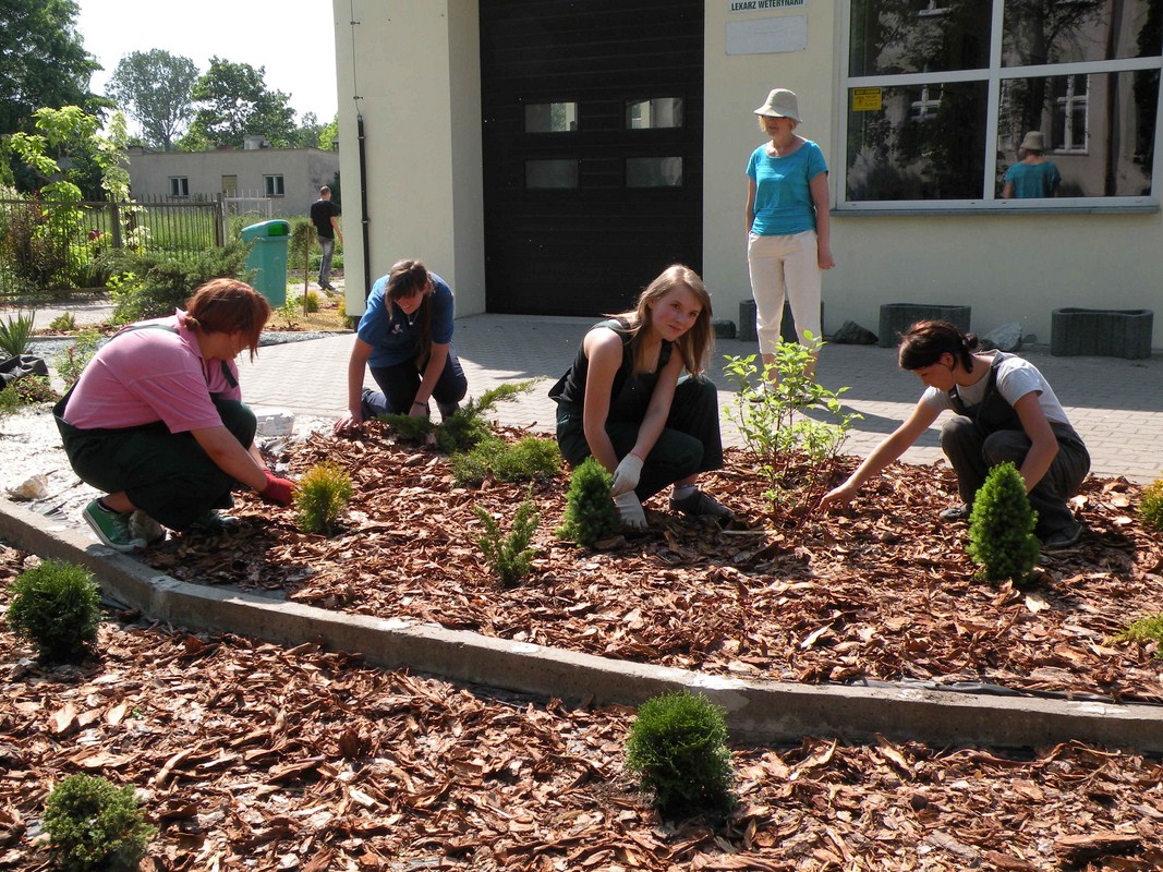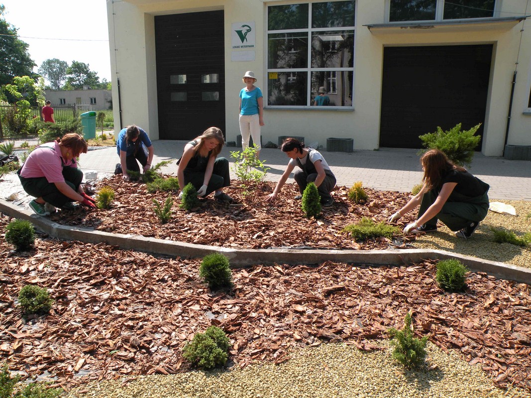 Uczniom klasy III Technikum kształcącego w zawodzie technik architektury krajobrazu pomagali koledzy i koleżanki z Technikum kształcącego w zawodzie technik rolnik oraz technik weterynarii.