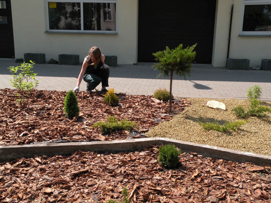 Po wstępnym przekopaniu i wyrównaniu terenu uczniowie rozłożyli geowłókninę zapobiegającą rozrastaniu się chwastów. Następnie wykonali w niej nacięcia krzyżowe, w których posadzili zgodnie z poznanymi zasadami rośliny. Całość zaś wysypali ozdobnym kruszywem oraz korą, która stanowi element dekoracyjny i utrzymuje wilgoć w glebie.