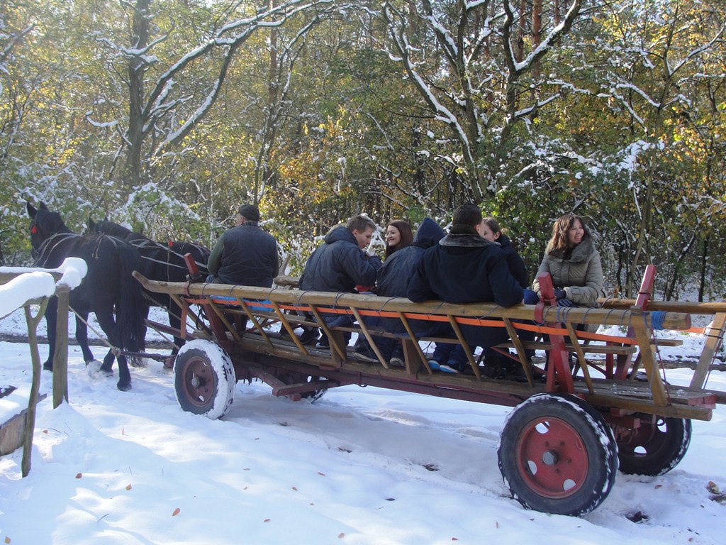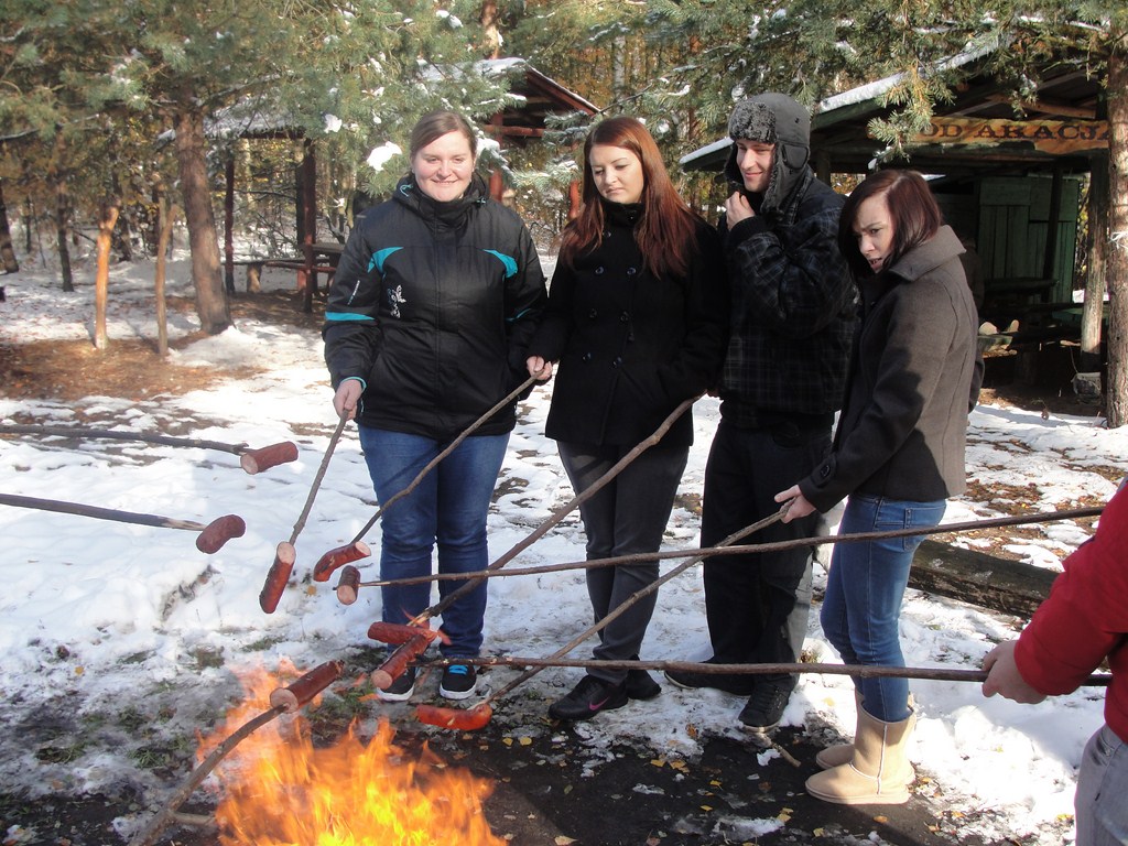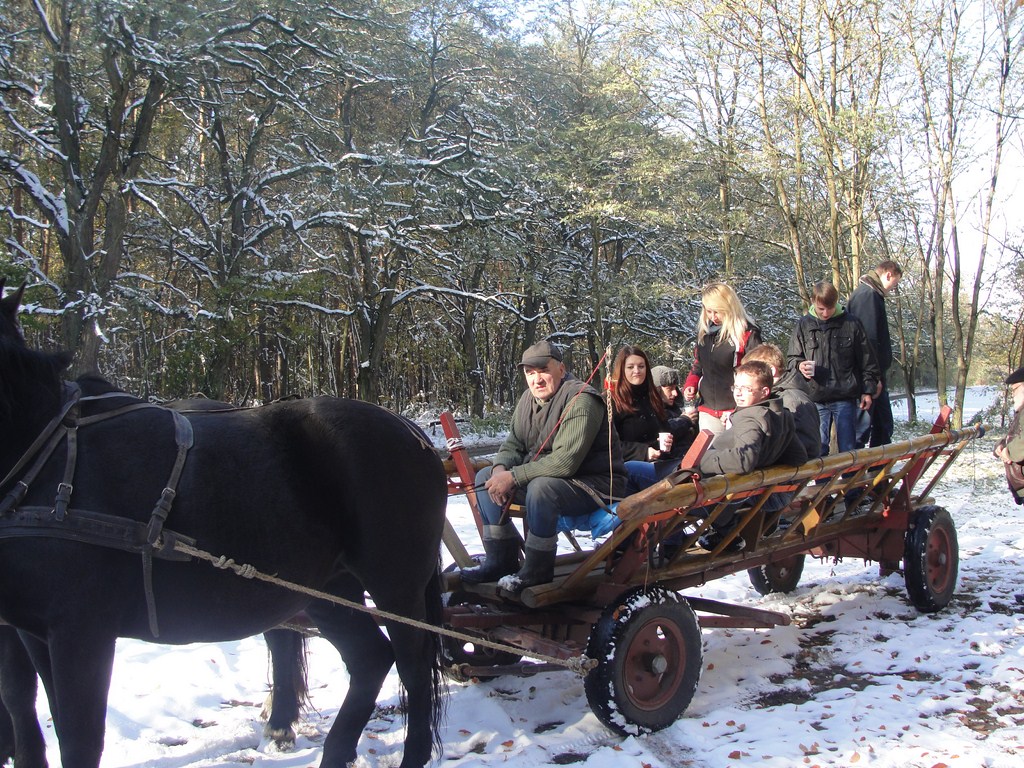 Kolejną atrakcją była przejażdżka po okolicy prawdziwym wozem drabiniastym zaprzężonym w kare konie. Po leśnym i okolicznym rajdzie, bogatym w liczne atrakcje historyczne i przyrodnicze, uczniowie posilili się pysznymi kiełbaskami, które sami piekli w ognisku.