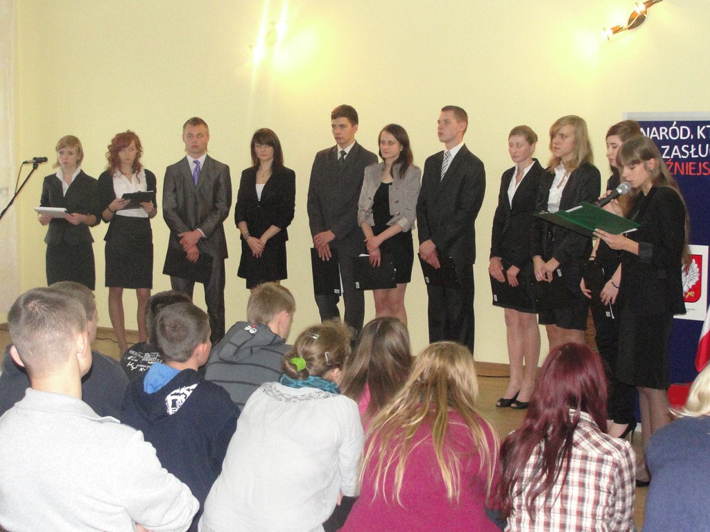 Młodzież szkolna miała okazję obejrzeć krótki film na temat historii Polski, wysłuchać pięknych wierszy, piosenek patriotycznych oraz narracji odnoszącej się do dziejów Naszej ojczyzny przed rokiem 1918. Hasłem przewodnim poniedziałkowej akademii były słowa największego architekta polskiej niepodległości – Józefa Piłsudskiego: „Naród, który nie szanuje swej przeszłości, nie zasługuje na szacunek teraźniejszości i nie ma prawa do przyszłości”. Przygotowany przez uczniów pod kierunkiem nauczycieli pani Małgorzaty Nowik, pana Aleksandra Frankiewicza i pana Łukasza Jankowskiego program artystyczny miał na celu wzbudzić wśród uczestników refleksje odnośnie stanu świadomości patriotycznej polskiego społeczeństwa w XXI wieku. Przywołane zostały przy tej okazji przemyślenia najwybitniejszych Polaków takich jak Jan Paweł II, ksiądz Popiełuszko czy też kardynał Stefan Wyszyński, którzy wielokrotnie zwracali uwagę na fakt, iż raz zdobyta niepodległość nie jest Nam dana na zawsze, że trzeba o nią dbać i ją pielęgnować.