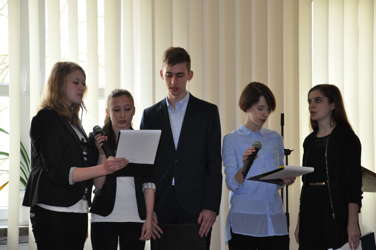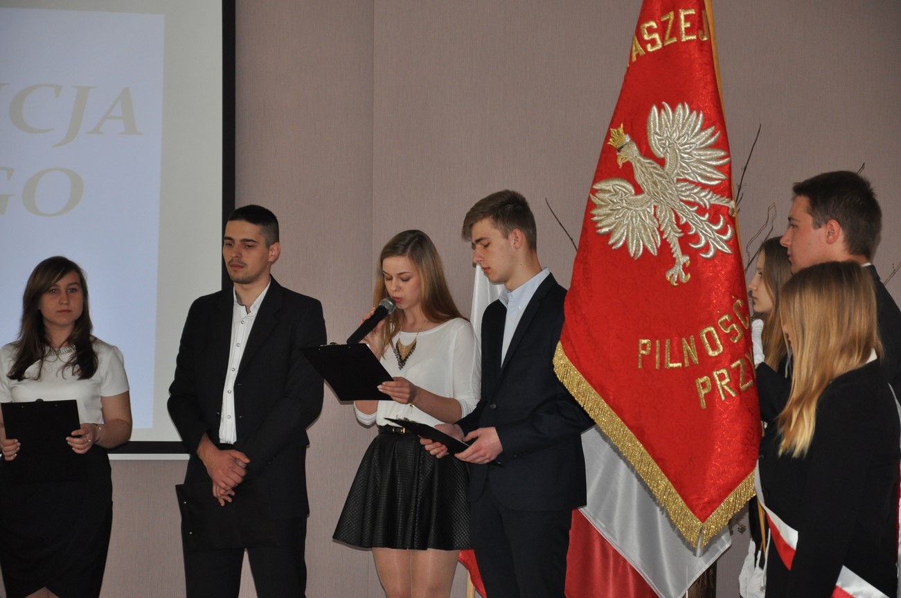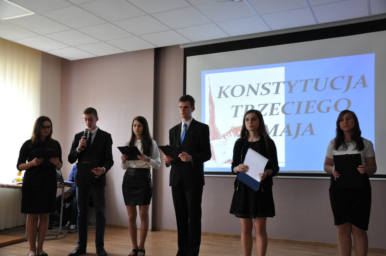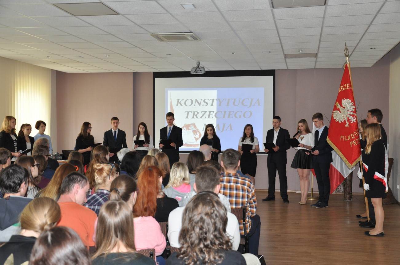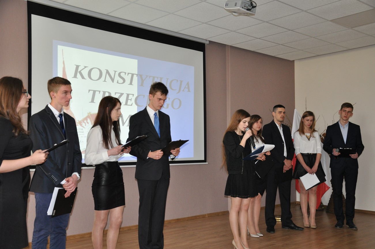 Akademia z tejże właśnie okazji rozpoczęła się o godzinie 1100 wprowadzeniem sztandaru szkoły i odśpiewaniem hymnu państwowego. Po części oficjalnej uczniowie pod kierunkiem pani Kingi Dzik i pana Łukasza Jankowskiego zaprezentowali krótki program artystyczny, w którym piękne patriotyczne wiersze i piosenki przeplatane historyczną narracją w sposób niezwykle dosadny oraz emocjonalny ukazały wszystkim zebranym w sali konferencyjnej jak ważnym i doniosłym wydarzeniem w dziejach narodu polskiego, ale i całej Europy było uchwalenie pierwszej na starym kontynencie ustawy zasadniczej jaką była tzw. Konstytucja 3 Maja.
