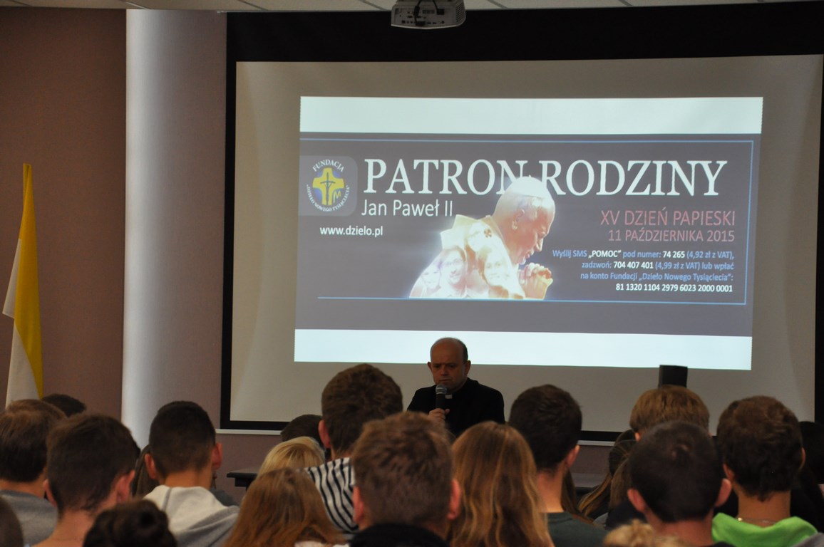 W dniu liturgicznego wspomnienia, 22 października, pod hasłem: „Jan Paweł II – Patron Rodziny”, w Zespole Szkół Centrum Kształcenia Rolniczego w Zduńskiej Dąbrowie przypomniano postać zatroskanego o rodzinę papieża. Forma szkolnych obchodów Dnia Papieskiego miała charakter swoistej triady. W pierwszej części (prezentacji multimedialnej), nawiązując do ogólnopolskich obchodów Dnia Papieskiego, przekazano najważniejsze wypowiedzi papieża dotyczące rodziny. W drugiej części (żywe świadectwo), zaproszony ks. Hubert Wiśniewski, proboszcz parafii Matki Bożej Bolesnej w Nieborowie, opowiadał o swoich bliskich spotkaniach z Ojcem św., m.in. podczas pobytu na studiach doktoranckich w Rzymie. Zebranym uczniom i nauczycielom zwrócił uwagę na przenikającą, osobliwą świętość papieża i umiejętność dostrzegania drugiego człowieka, pomimo ograniczeń związanych z chorobą w ostatnich latach życia.
