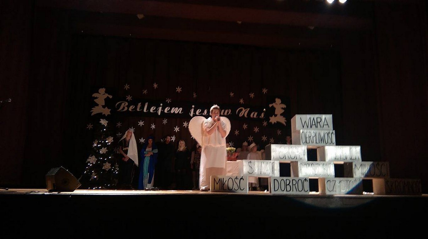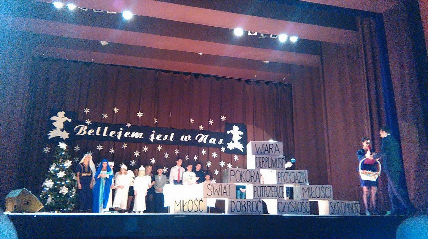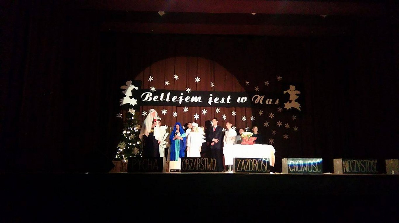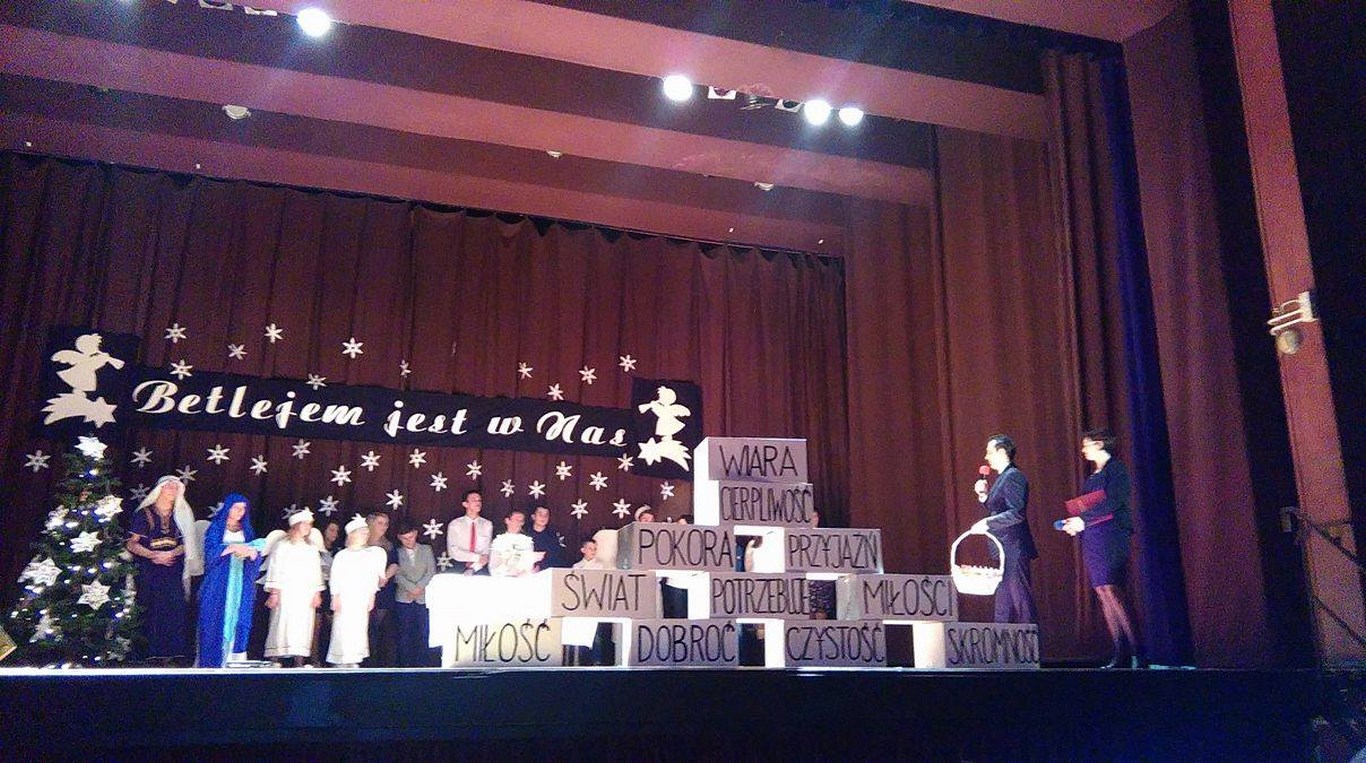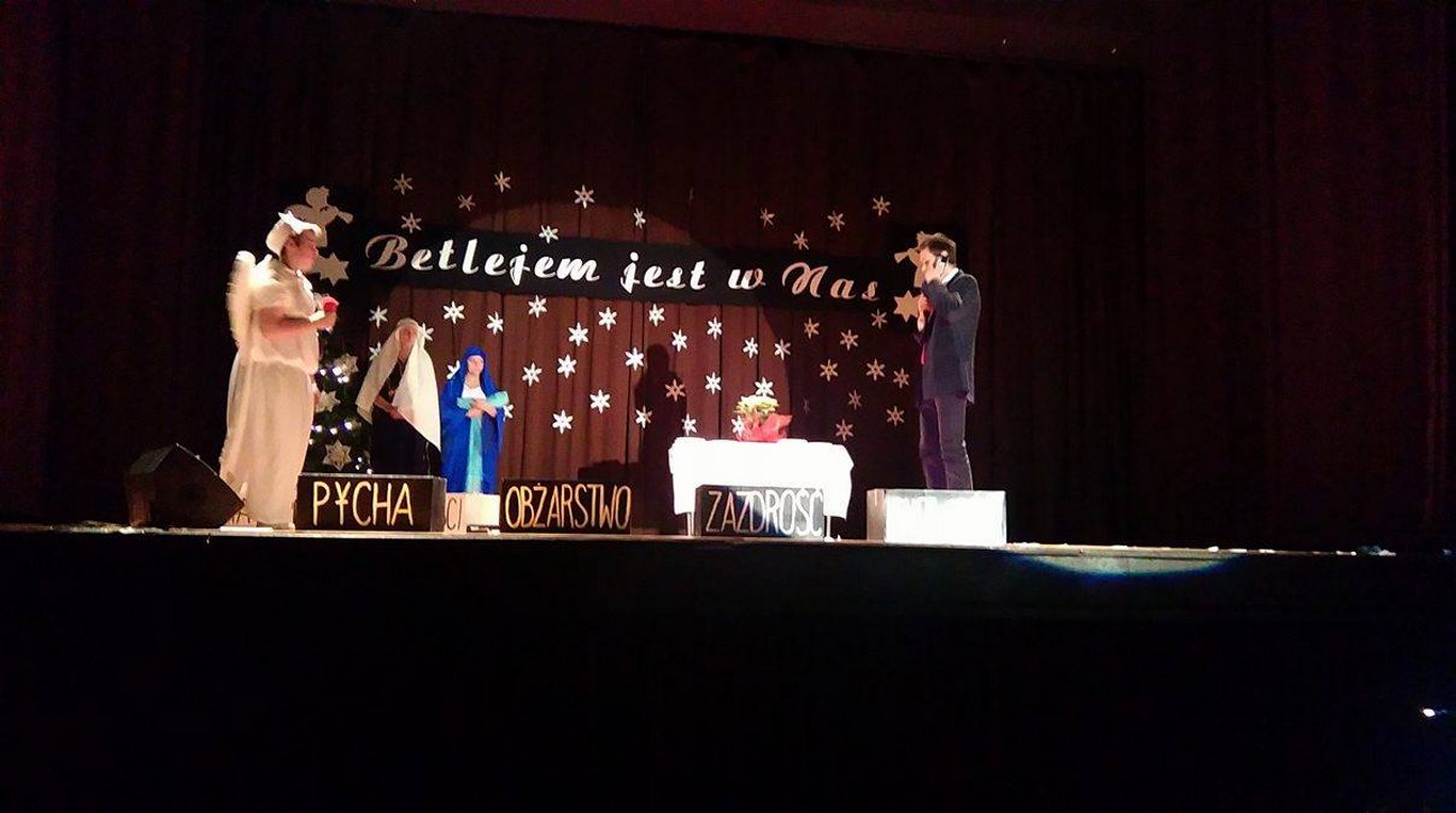 „Betlejem jest w Nas” – pod takim tytułem wychowankowie Powiatowego Zespołu Placówek Opiekuńczo-Wychowawczych w Gostyninie przygotowali przedstawienie bożonarodzeniowe, które odbyło się 15 grudnia w Domu Kultury. Przybyłych widzów bardzo gorąco powitała Pani Dyrektor placówki – Monika Kuźnicka. Widowisko rozpoczęło się od zaprezentowania kilku scenek, w których widzowie mogli dostrzec współczesne, dość często, niestety, spotykane podejście do obchodów Bożego Narodzenia – zaaferowanie przygotowaniami, brak zainteresowania świętami, obojętność, skupienie wyłącznie na własnych potrzebach. Gdy bohaterowie relacjonowali swoje świąteczne zapracowanie, na scenie pojawiał się klocki, ukazujące grzechy: pychę, obżarstwo, chciwość, zazdrość, gniew, lenistwo, nieczystość, które popychają ludzi w niewłaściwym kierunku. By odnaleźć właściwy sens świątecznej atmosfery, naszym bohaterom, a tym samym i widzom, przypomniano wydarzenie sprzed dwóch tysięcy lat – narodziny Jezusa. Na zakończenie w czasie utworu Wieża Babel wykonanego przez wychowanków zbudowano wieżę cnót, wartości, które każdego dnia powinny być drogowskazami na naszej życiowej drodze. Ten niezwykły, świąteczny czas powinien być wypełniony miłością, skromnością, dobrocią, pokorą, radością, cierpliwością, wiarą, ale czy na pewno tak jest?