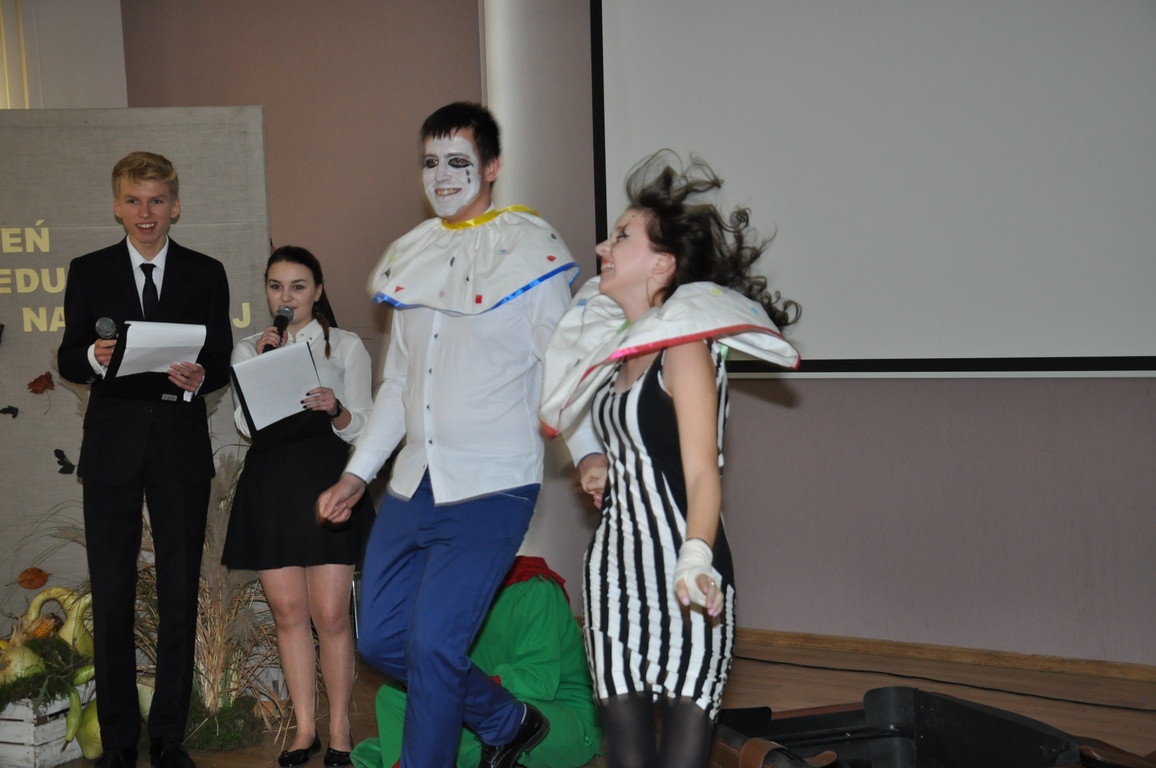 Po wyprowadzeniu sztandaru szkoły młodzież pod kierownictwem pani Anny Marciniak-Makochan zaprezentowała zgromadzonym krótki, zabawny program artystyczny odzwierciedlający codzienność pracy nauczyciela i jego kontaktów z uczniami, które nierzadko przybierają charakter komediowy.