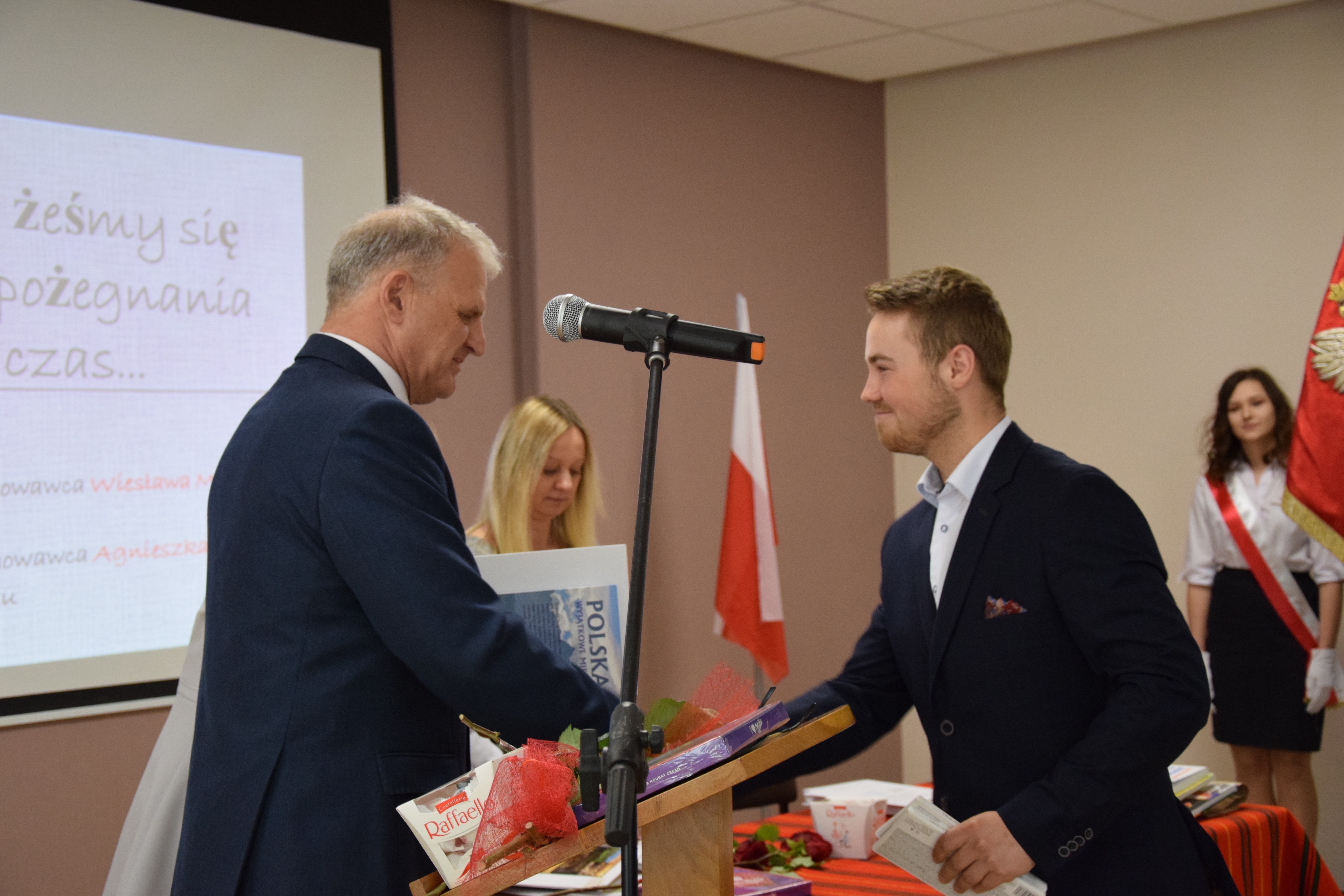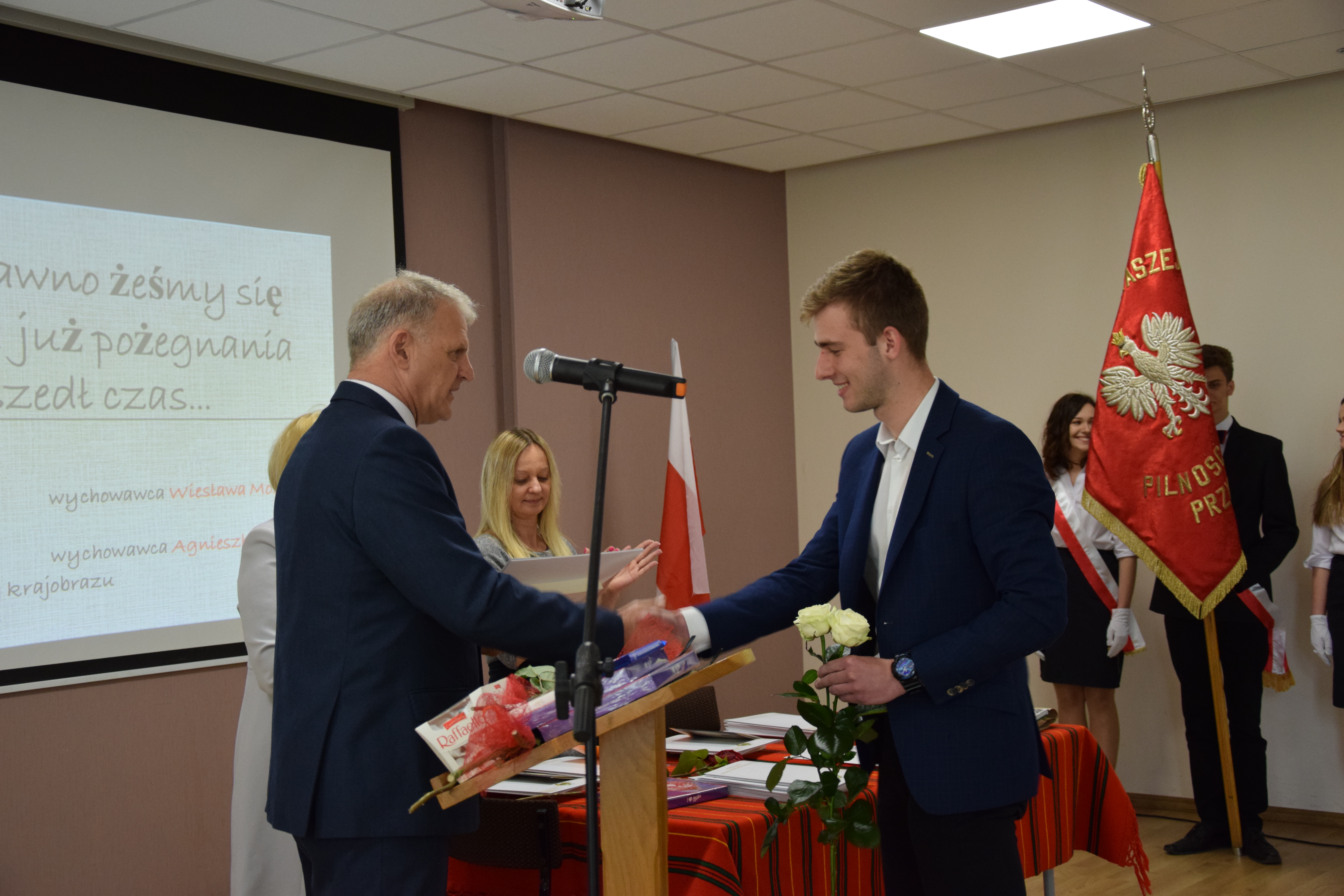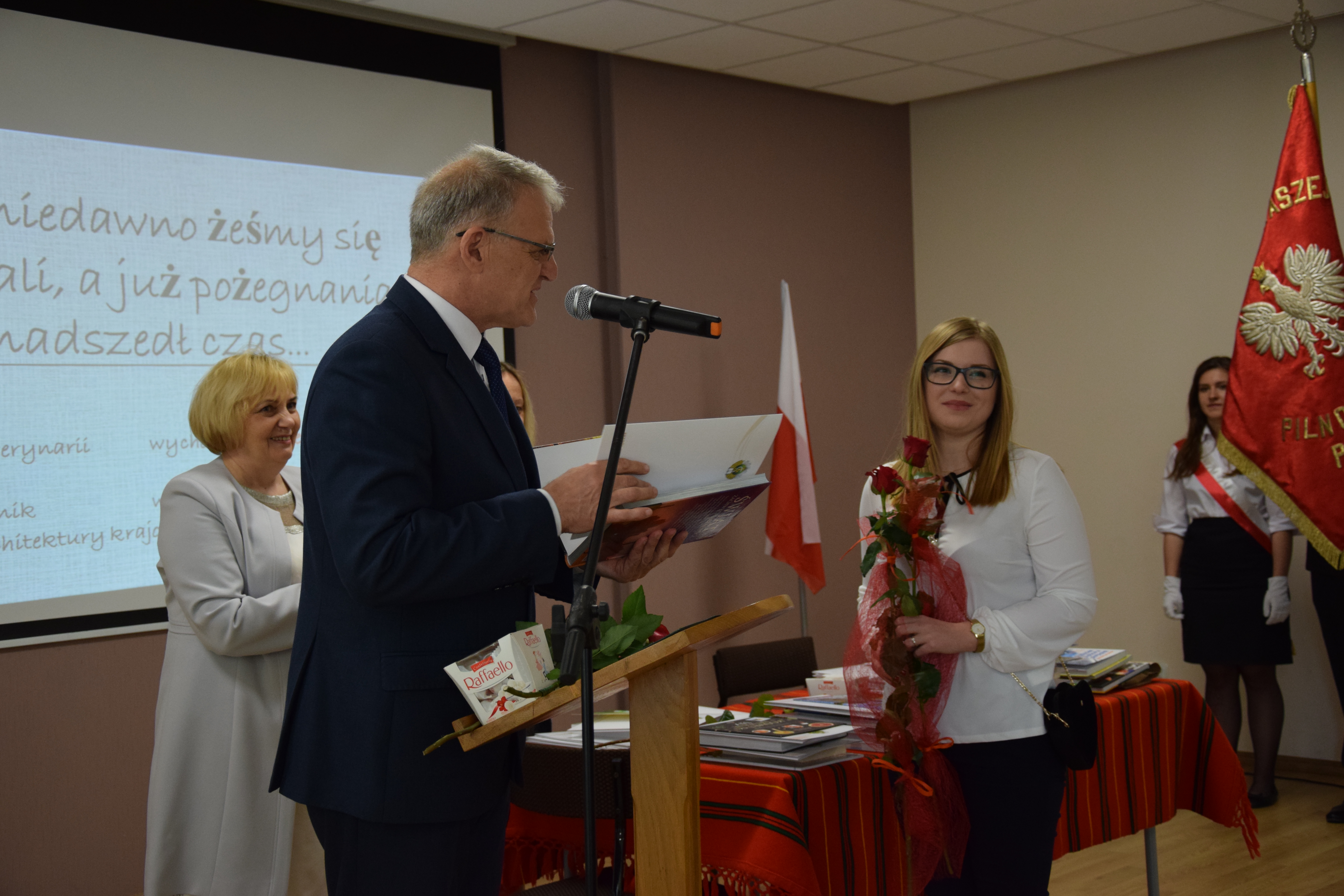 Uroczystość rozpoczęła się od przemówieniem Dyrektora Szkoły – Pana Stanisława Kosmowskiego, po którym nastąpiło wręczenie czwartoklasistom świadectw i nagród za bardzo dobre i dobre wyniki w nauce, wzorowe zachowanie oraz szczególne zaangażowanie w życie szkoły. Świadectwa z wyróżnieniem otrzymało trzech uczniów z klasy IV Technikum kształcącego w zawodzie technik weterynarii oraz jedna uczennica z klasy IV Technikum kształcącego w zawodzie technik architektury krajobrazu. Na ręce ich rodziców zostały złożone listy gratulacyjne.