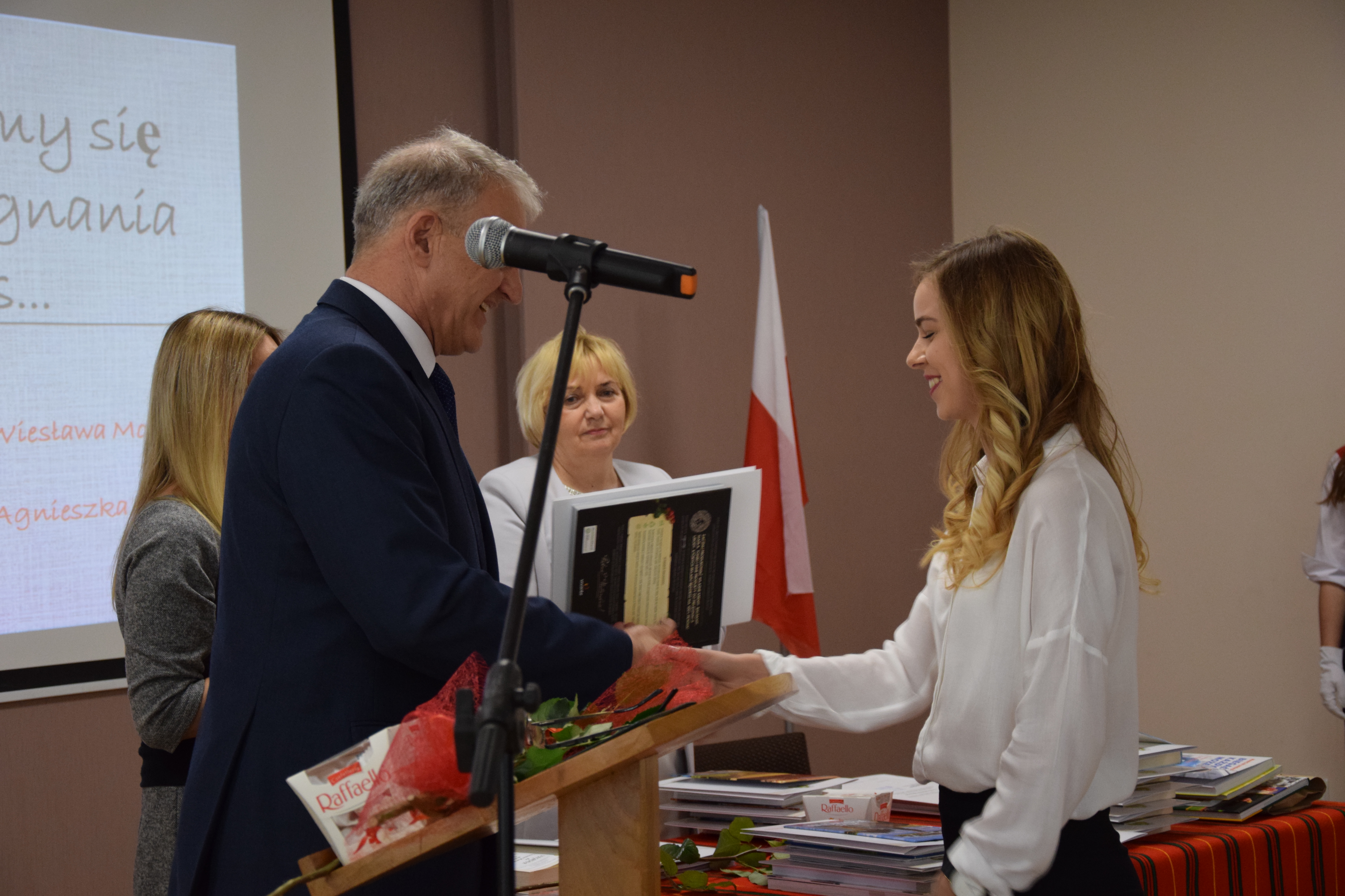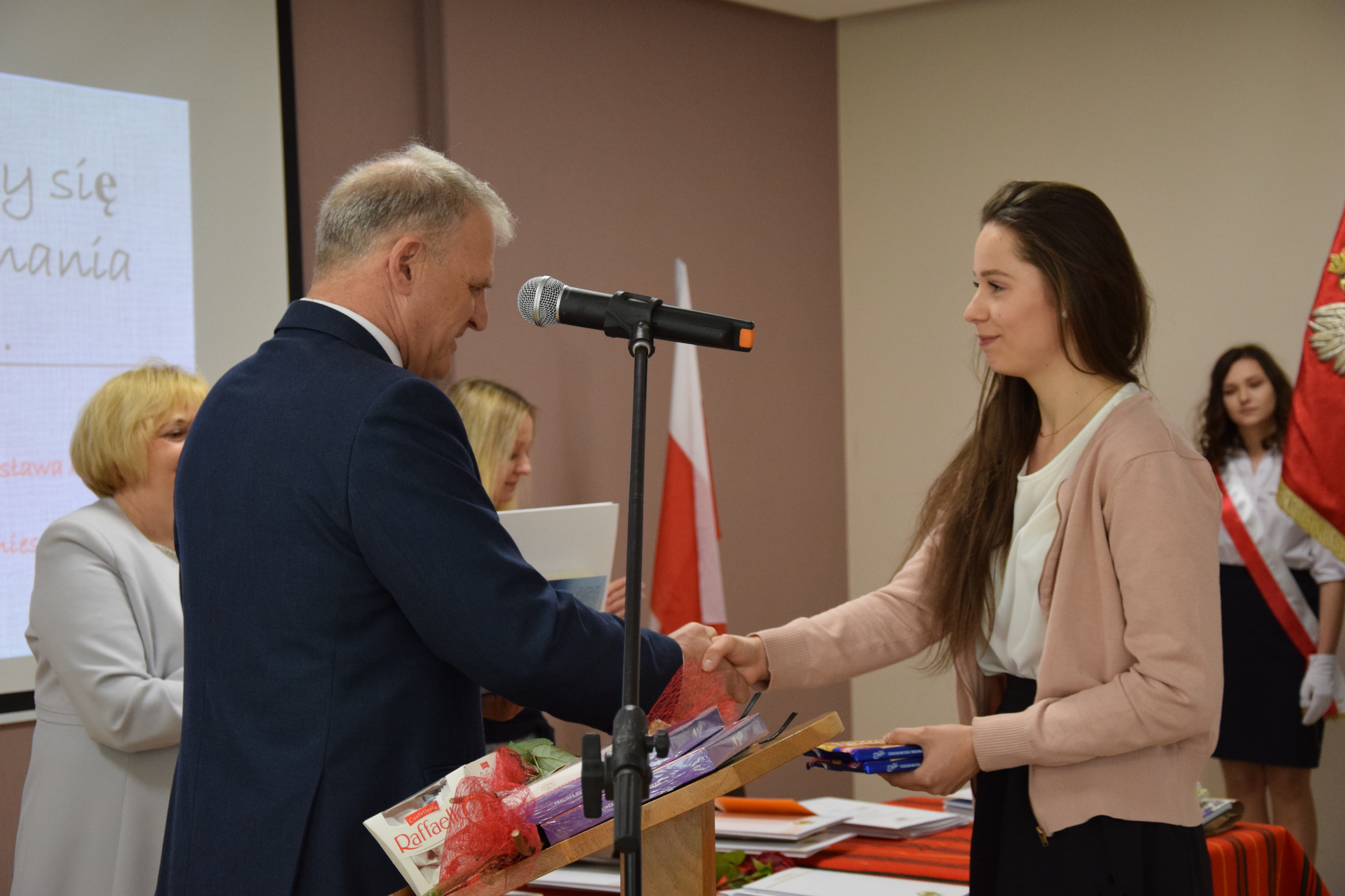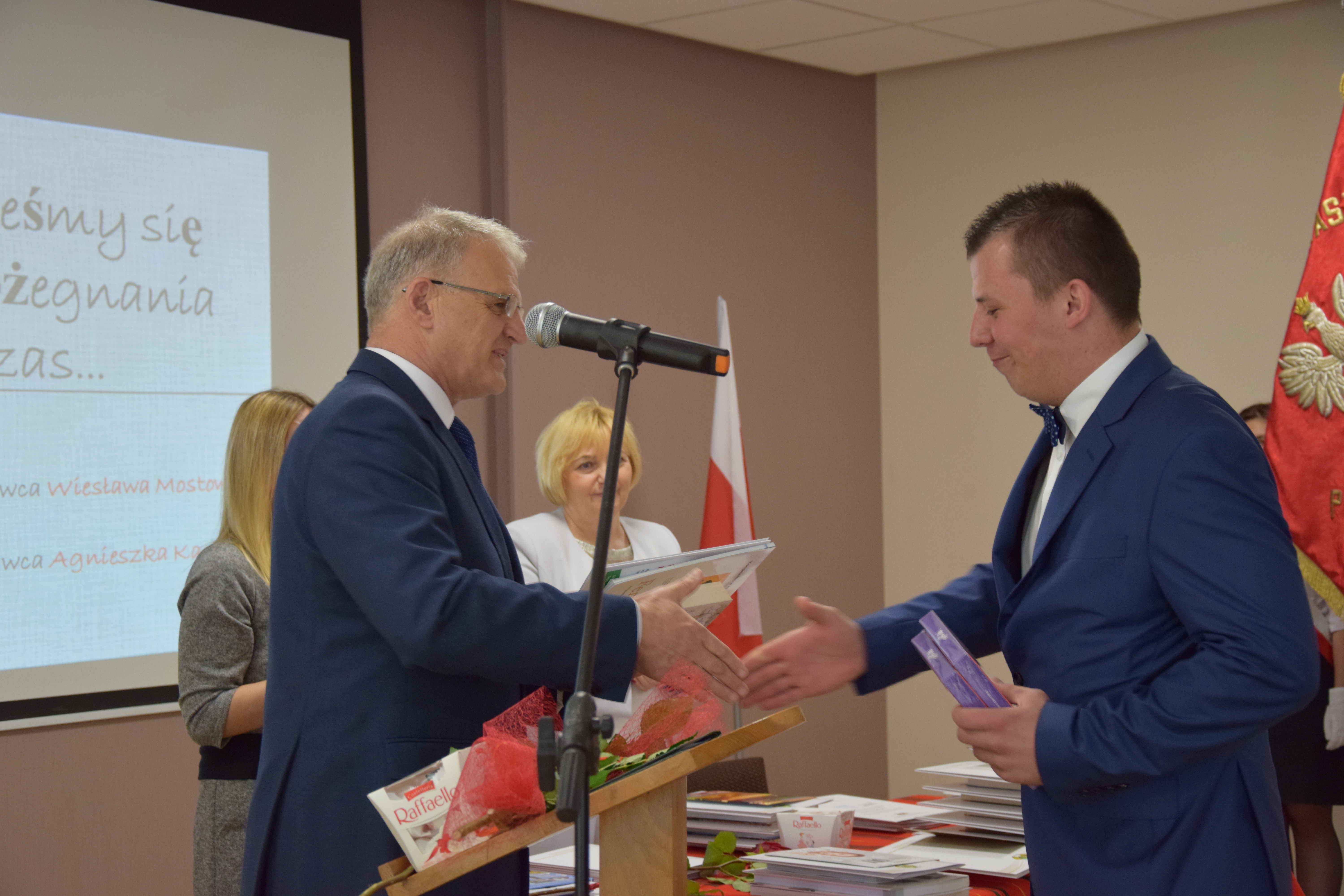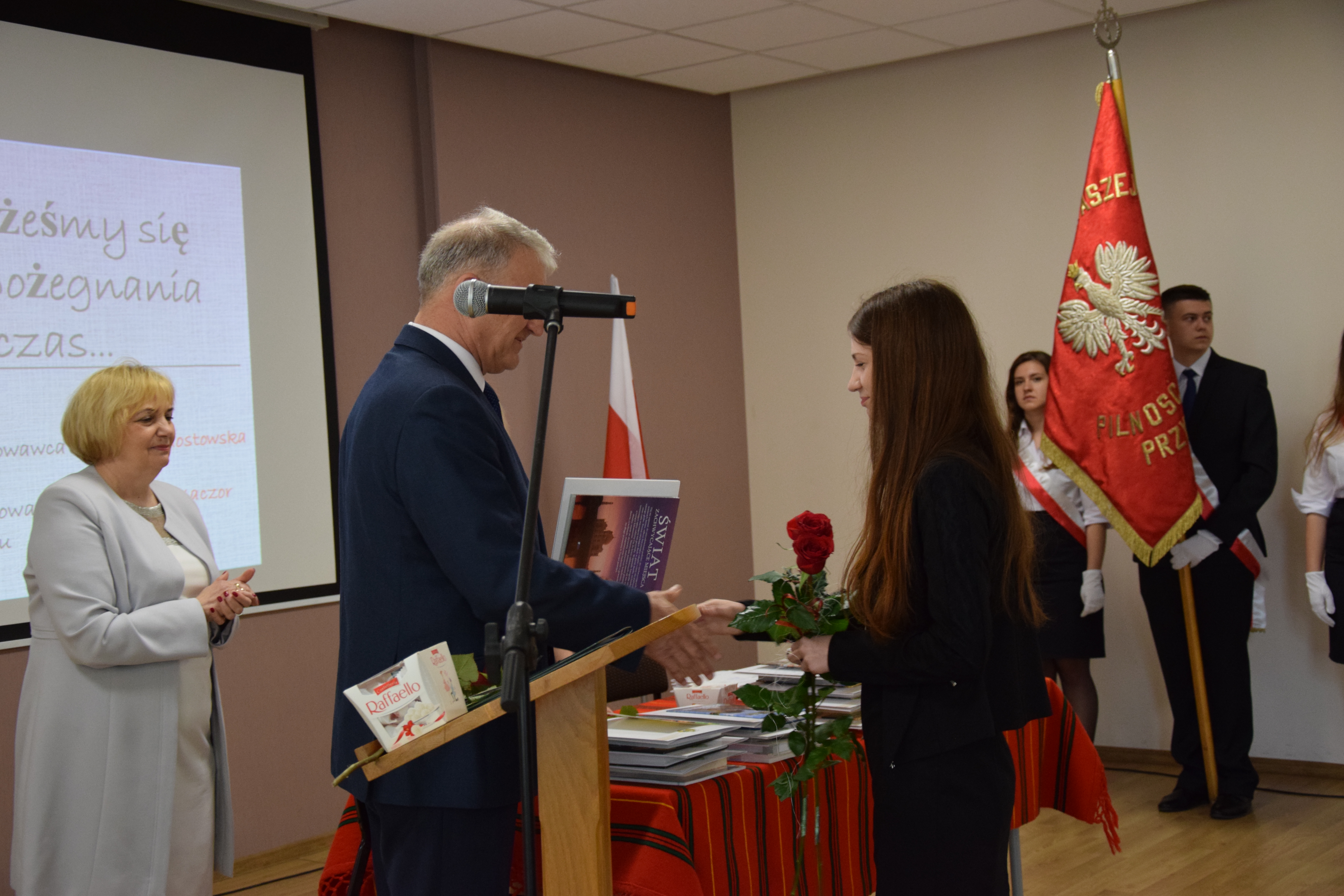 Uroczystość rozpoczęła się od przemówieniem Dyrektora Szkoły – Pana Stanisława Kosmowskiego, po którym nastąpiło wręczenie czwartoklasistom świadectw i nagród za bardzo dobre i dobre wyniki w nauce, wzorowe zachowanie oraz szczególne zaangażowanie w życie szkoły. Świadectwa z wyróżnieniem otrzymało trzech uczniów z klasy IV Technikum kształcącego w zawodzie technik weterynarii oraz jedna uczennica z klasy IV Technikum kształcącego w zawodzie technik architektury krajobrazu. Na ręce ich rodziców zostały złożone listy gratulacyjne.