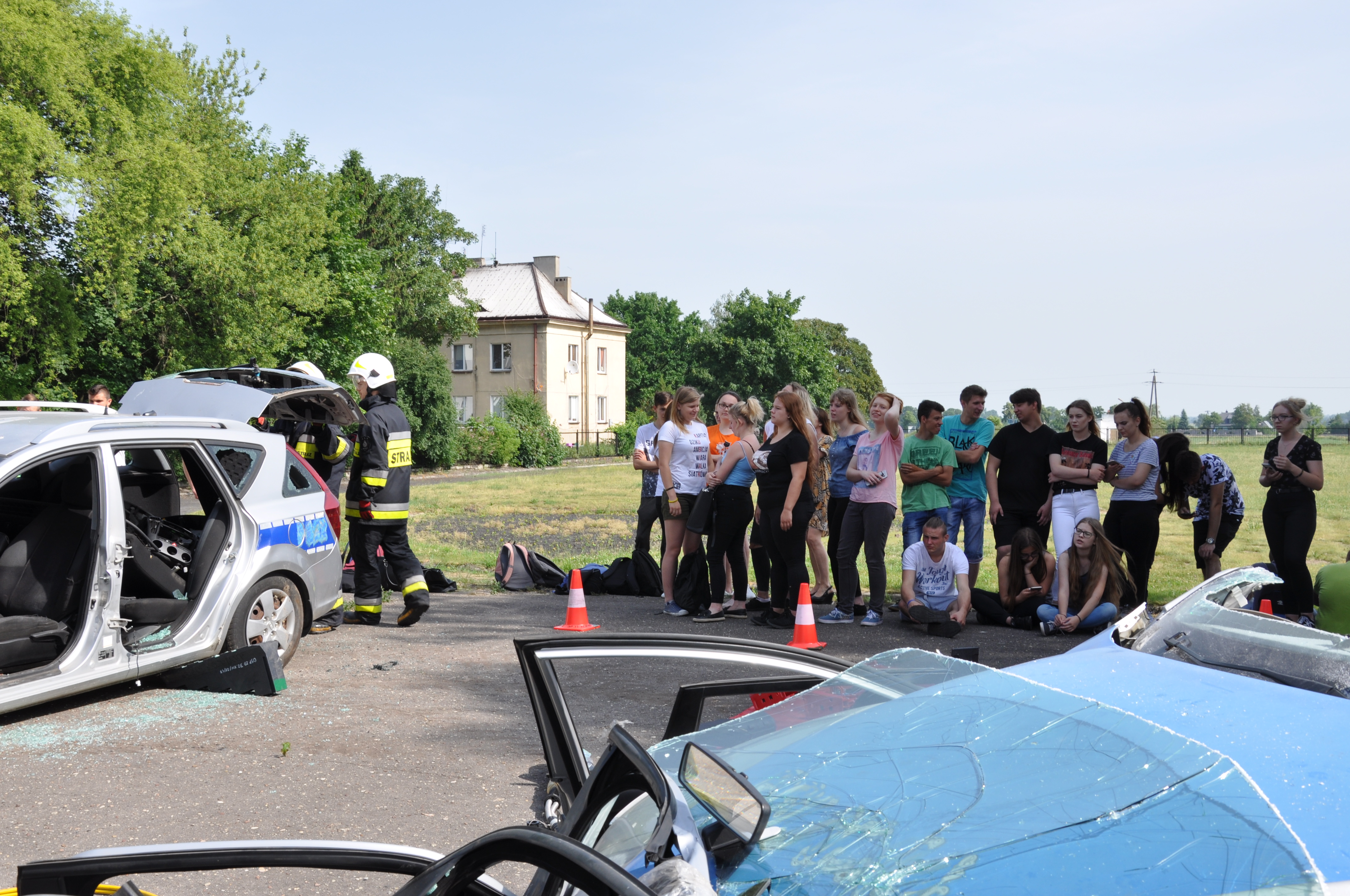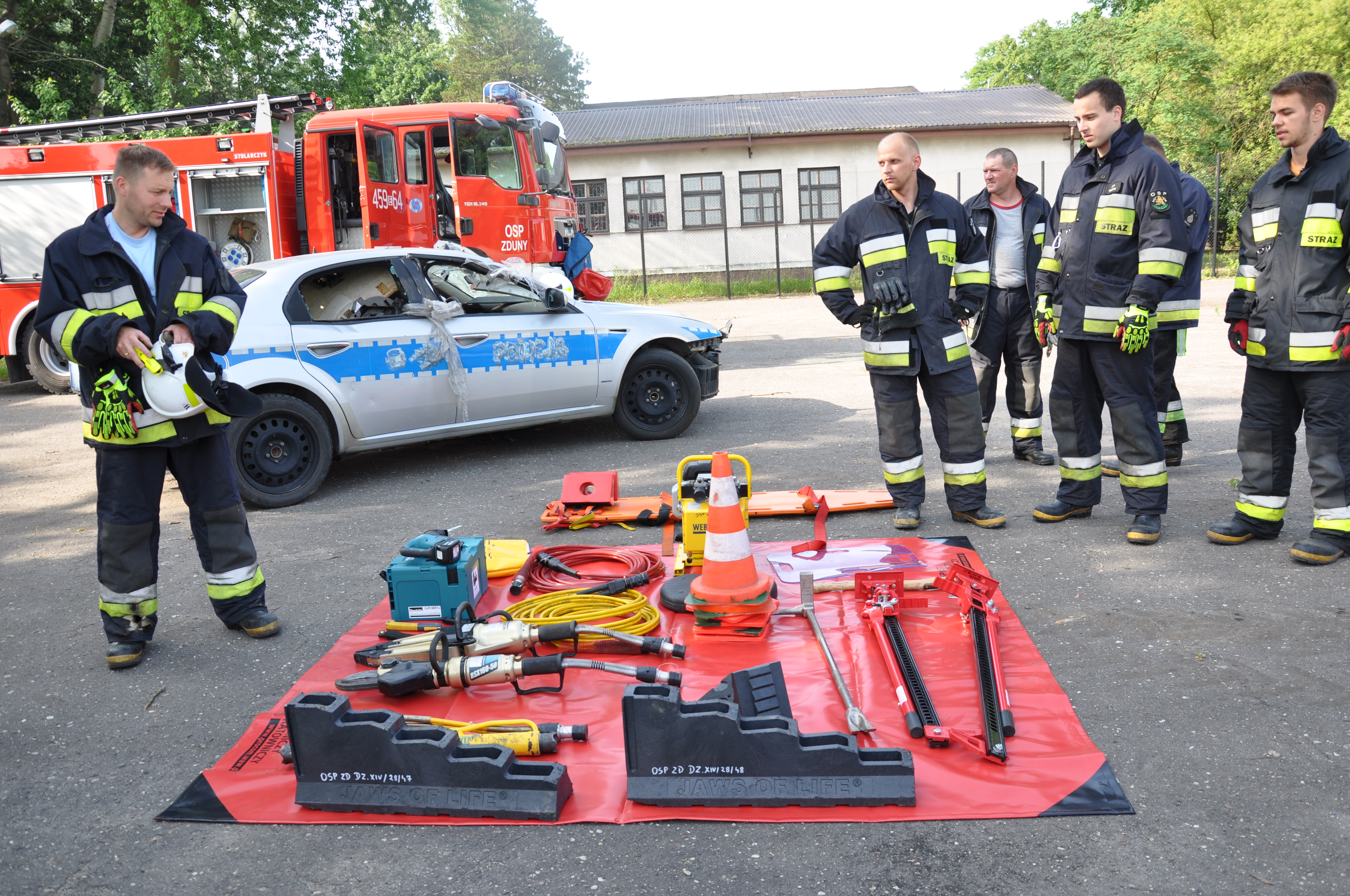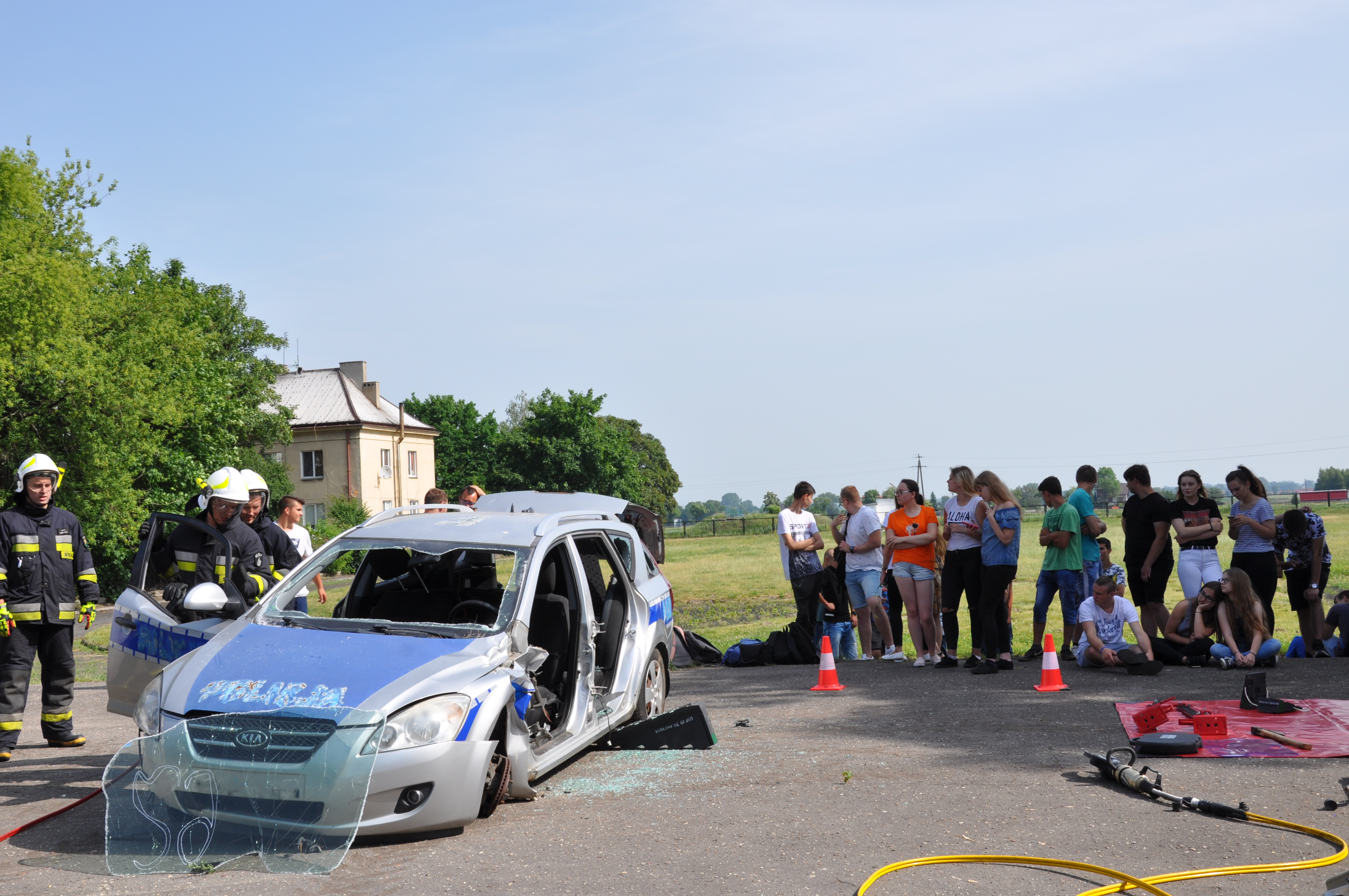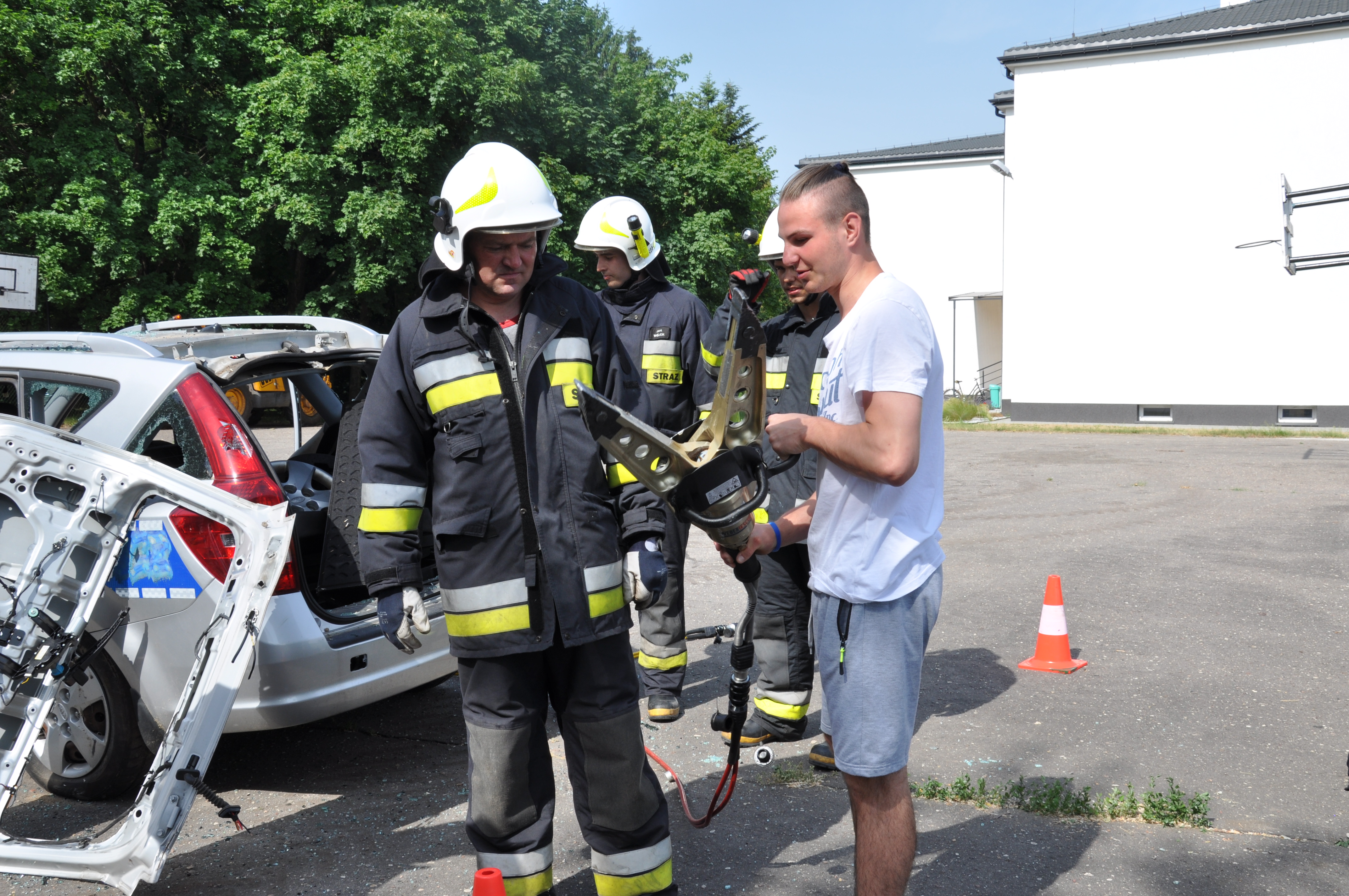 13 czerwca uczniowie ZSCKR w Zduńskiej Dąbrowie wzięli udział w niecodziennym pokazie zaprezentowanym przez zastęp strażaków z OSP Zduny. Druhowie przedstawili wyposażenie ratownicze wozu bojowego, między innymi zestaw hydraulicznych narzędzi ratownictwa technicznego, oraz zademonstrowali techniki cięcia samochodu osobowego, w celu ewakuowania osoby poszkodowanej podczas wypadku komunikacyjnego. Podczas pokazu zaprezentowali również technikę wyciągania osoby poszkodowanej, u której nie było widocznych funkcji życiowych ( brak oddechu), co może zastosować każdy z nas, by ratować życie ludzkie.