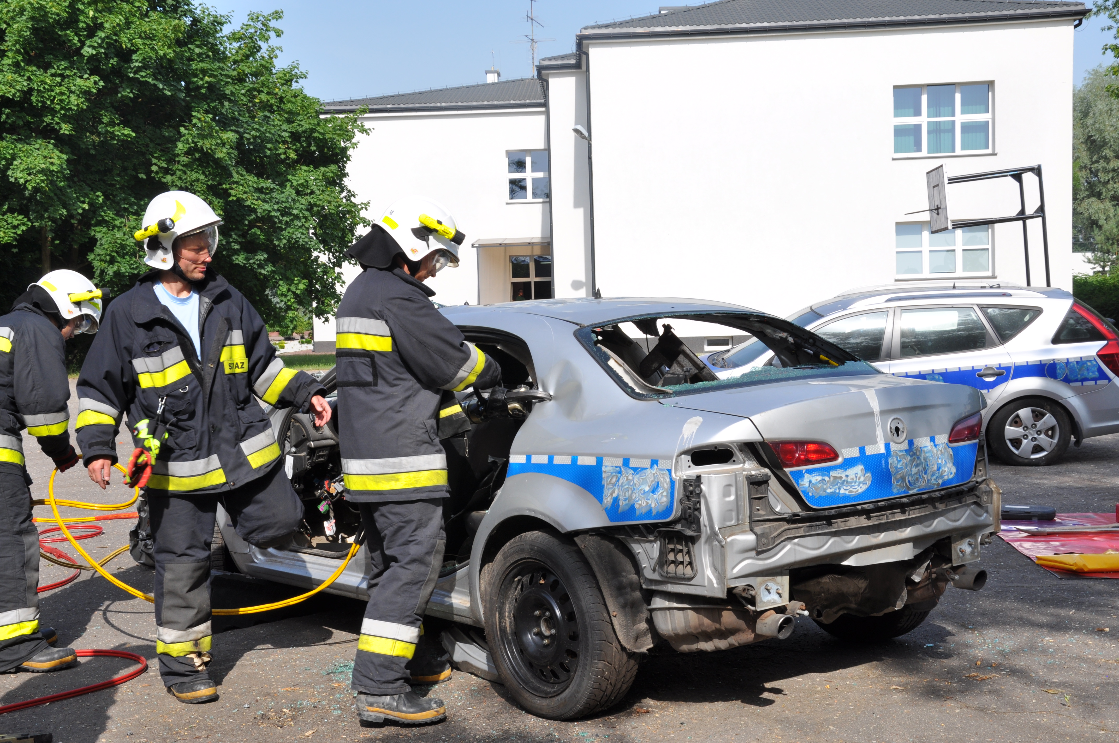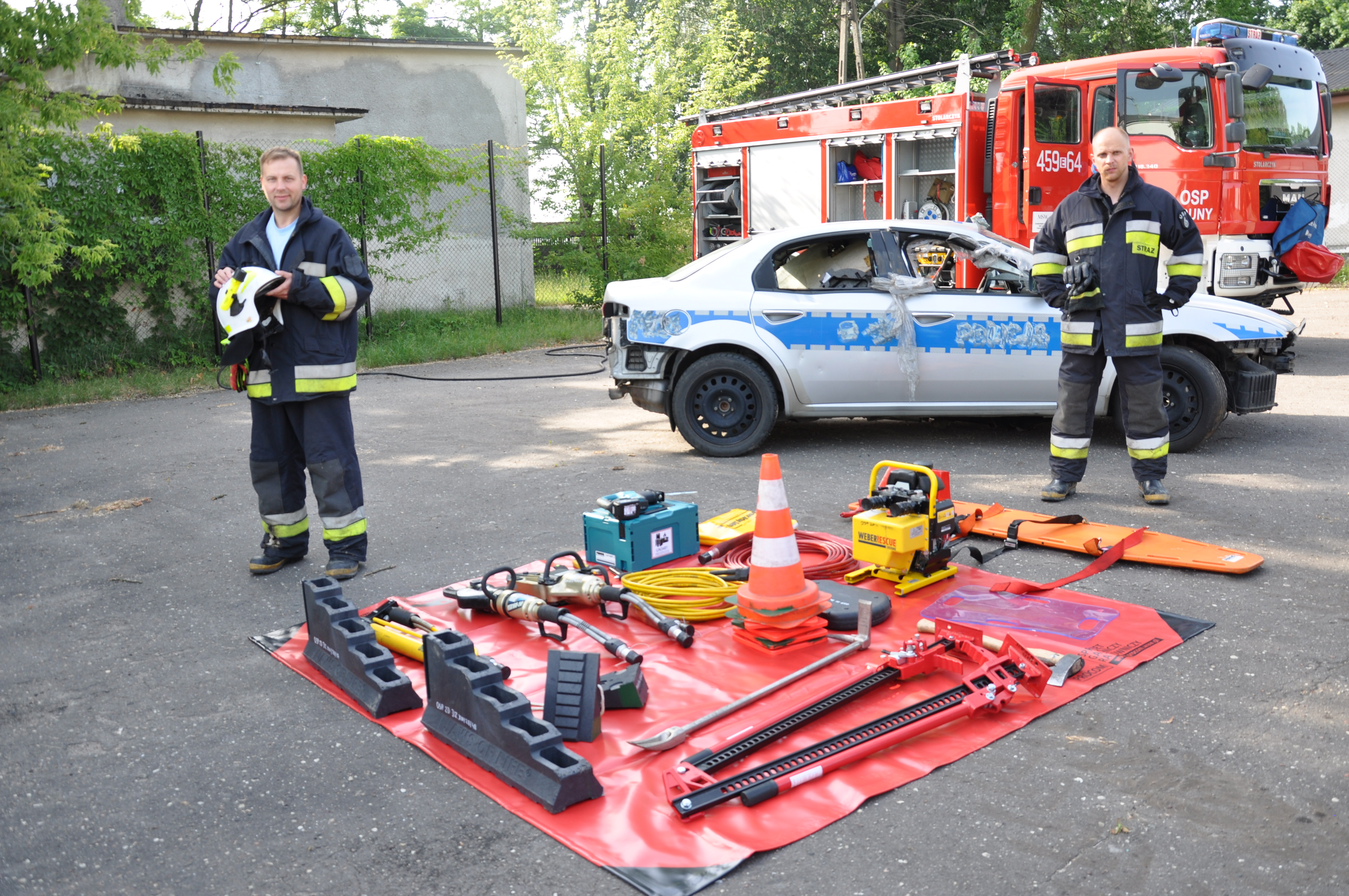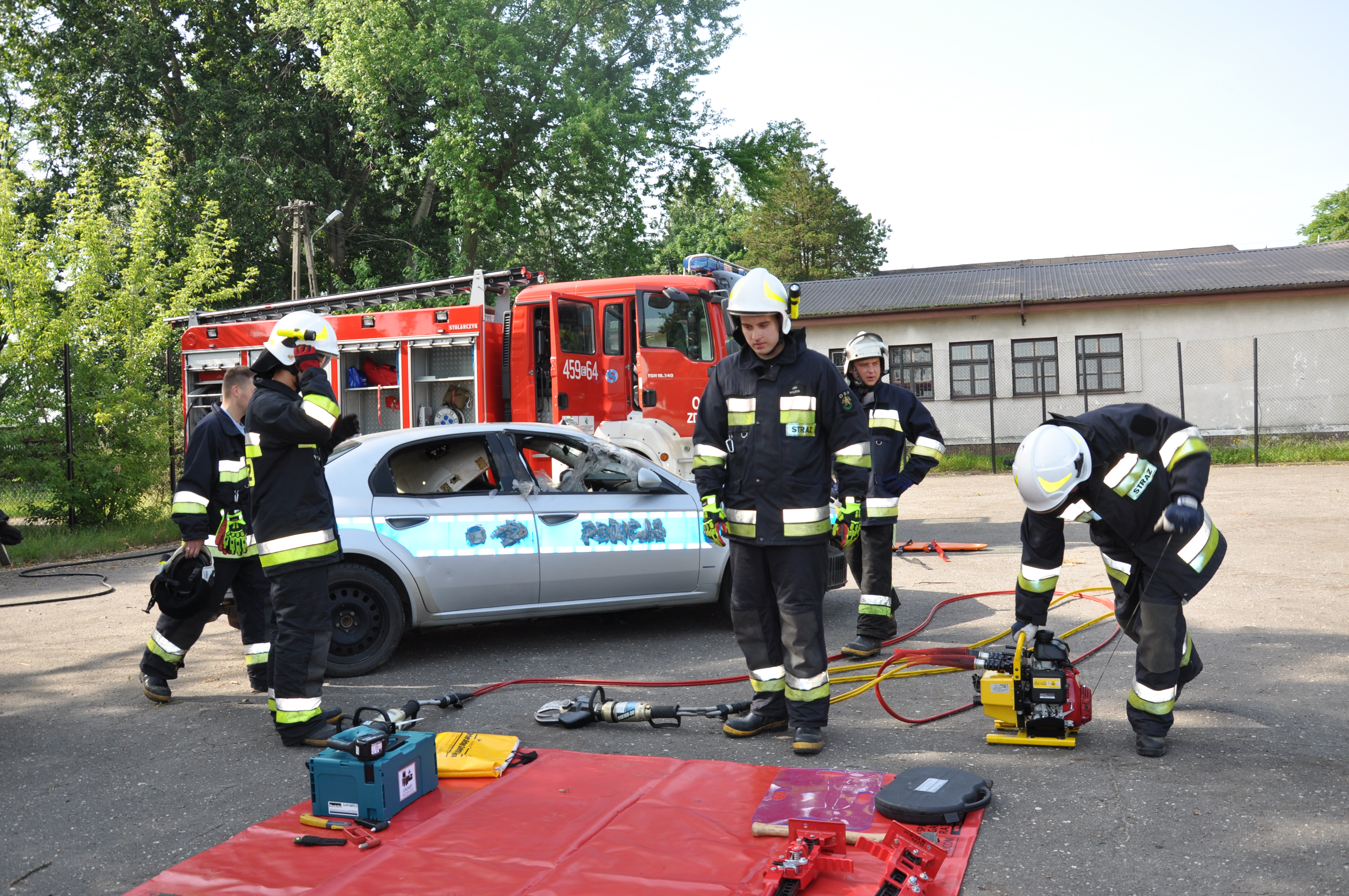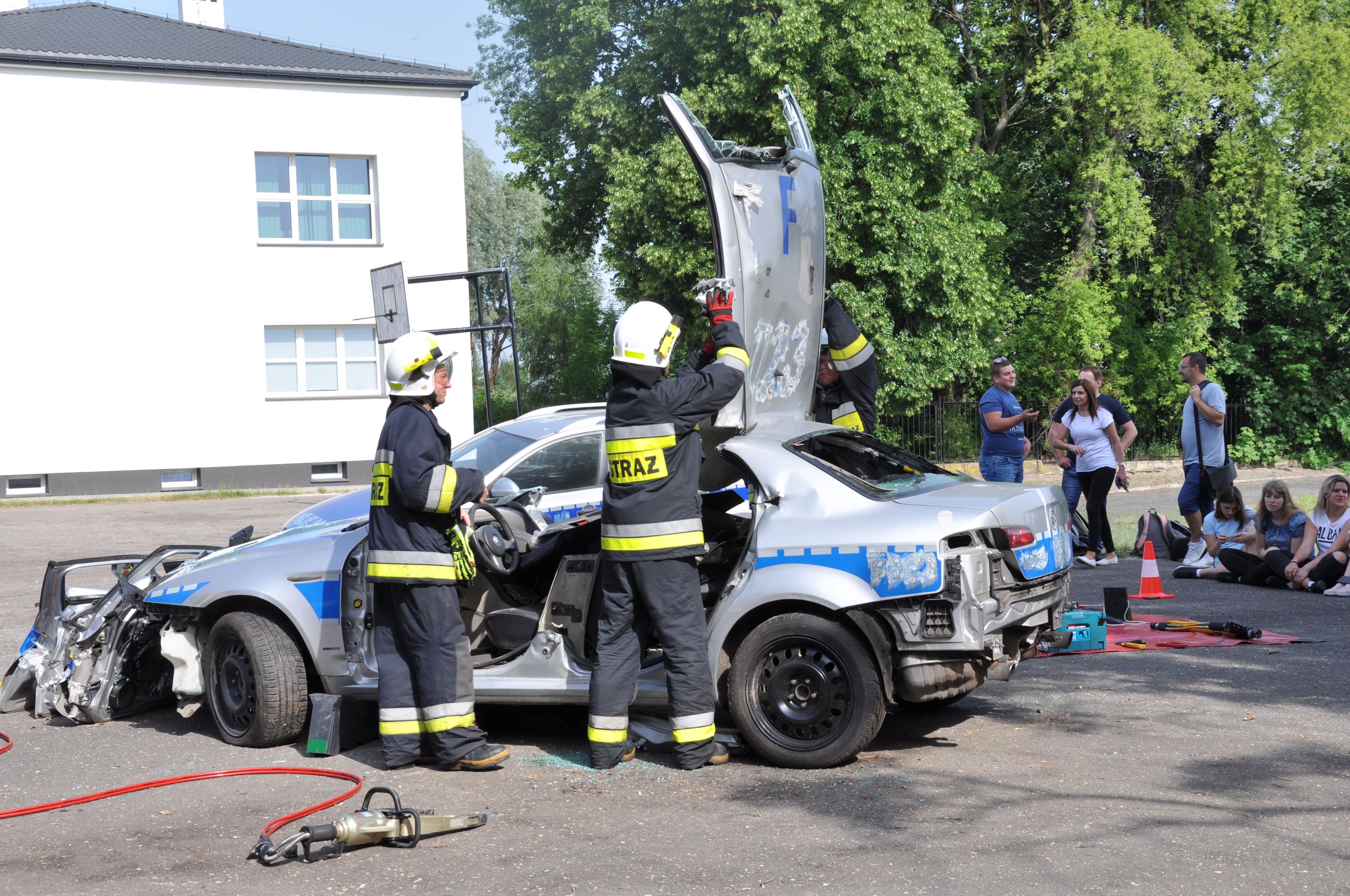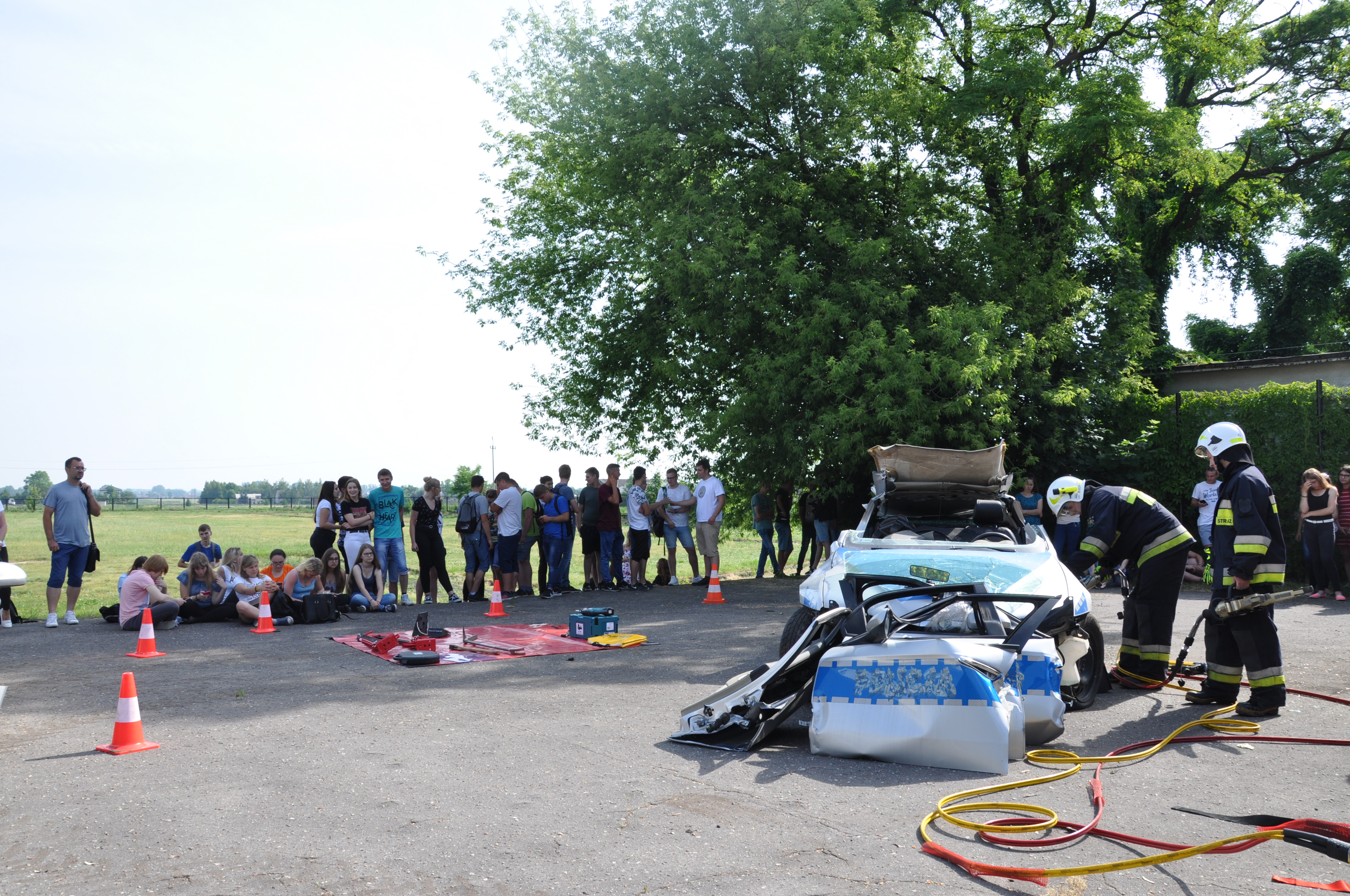 13 czerwca uczniowie ZSCKR w Zduńskiej Dąbrowie wzięli udział w niecodziennym pokazie zaprezentowanym przez zastęp strażaków z OSP Zduny. Druhowie przedstawili wyposażenie ratownicze wozu bojowego, między innymi zestaw hydraulicznych narzędzi ratownictwa technicznego, oraz zademonstrowali techniki cięcia samochodu osobowego, w celu ewakuowania osoby poszkodowanej podczas wypadku komunikacyjnego. Podczas pokazu zaprezentowali również technikę wyciągania osoby poszkodowanej, u której nie było widocznych funkcji życiowych ( brak oddechu), co może zastosować każdy z nas, by ratować życie ludzkie.