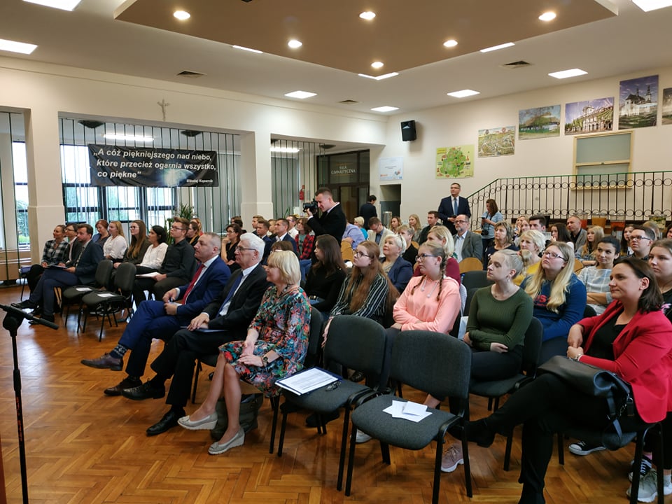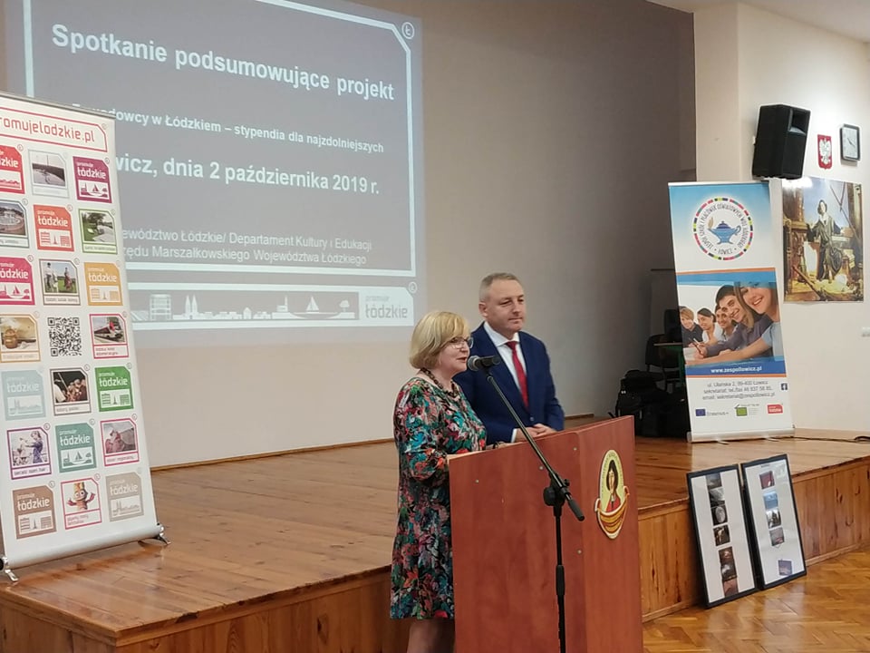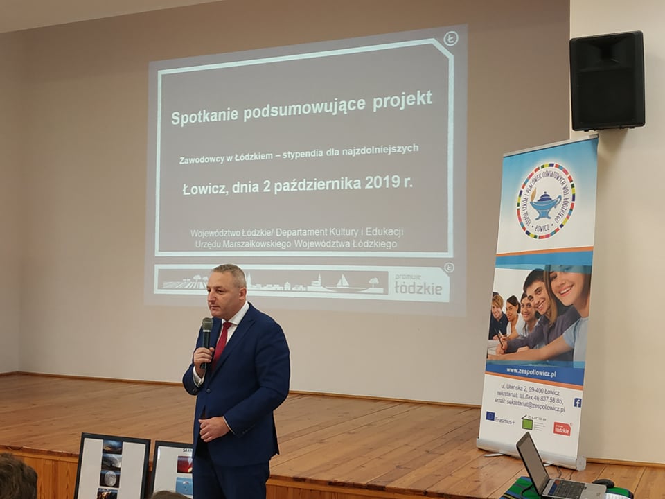 W dniu 2 października 2019 roku w Zespole Szkół i Placówek Oświatowych Województwa Łódzkiego w Łowiczu odbyło się spotkanie podsumowujące projekt „Zawodowcy w Łódzkiem – stypendia dla najzdolniejszych”. Wydarzenie to zostało zorganizowane przez Departament Kultury i Edukacji Urzędu Marszałkowskiego Województwa Łódzkiego w ramach cyklu 5 spotkań podsumowujących w/w projekt. Nasza szkoła była reprezentowana przez Annę Grzelak z klasy III TW, Marcela Kaczora z IV TAK oraz opiekunów stypendystów – p. Karola Panka i p. Joannę Balcerską. Ania miała okazję zaprezentować się przed publicznością i podsumować swój udział w projekcie. Prezentacja uczennicy wzbudziła zachwyt wśród pracowników biura projektu i przybyłych gości.