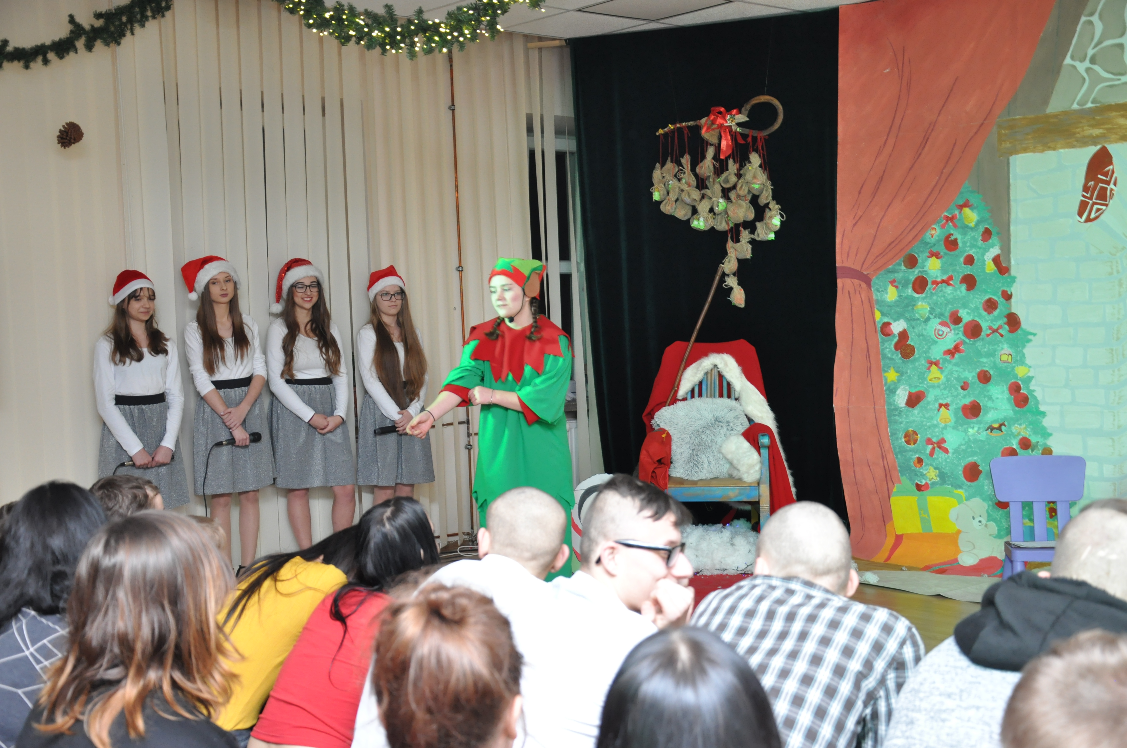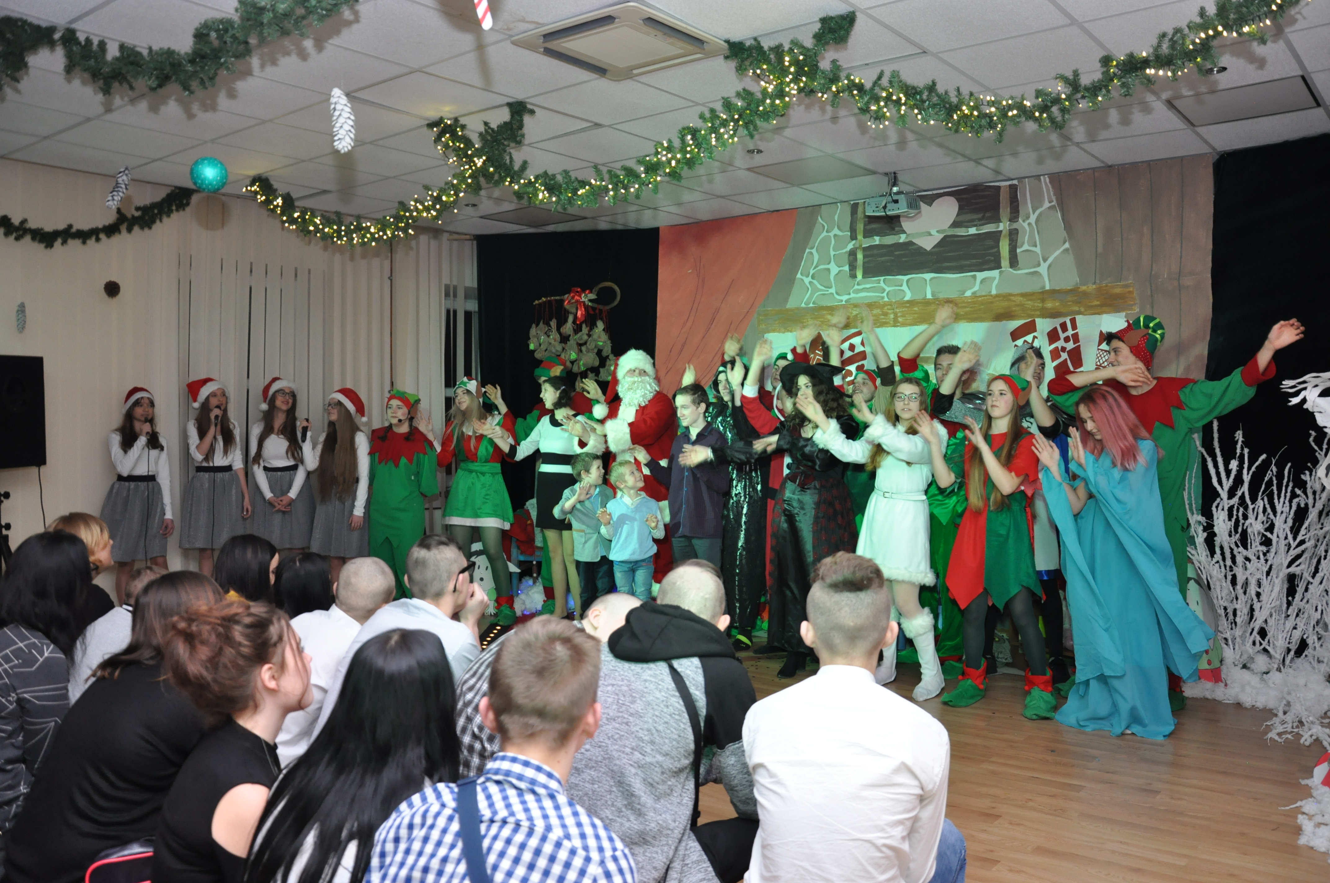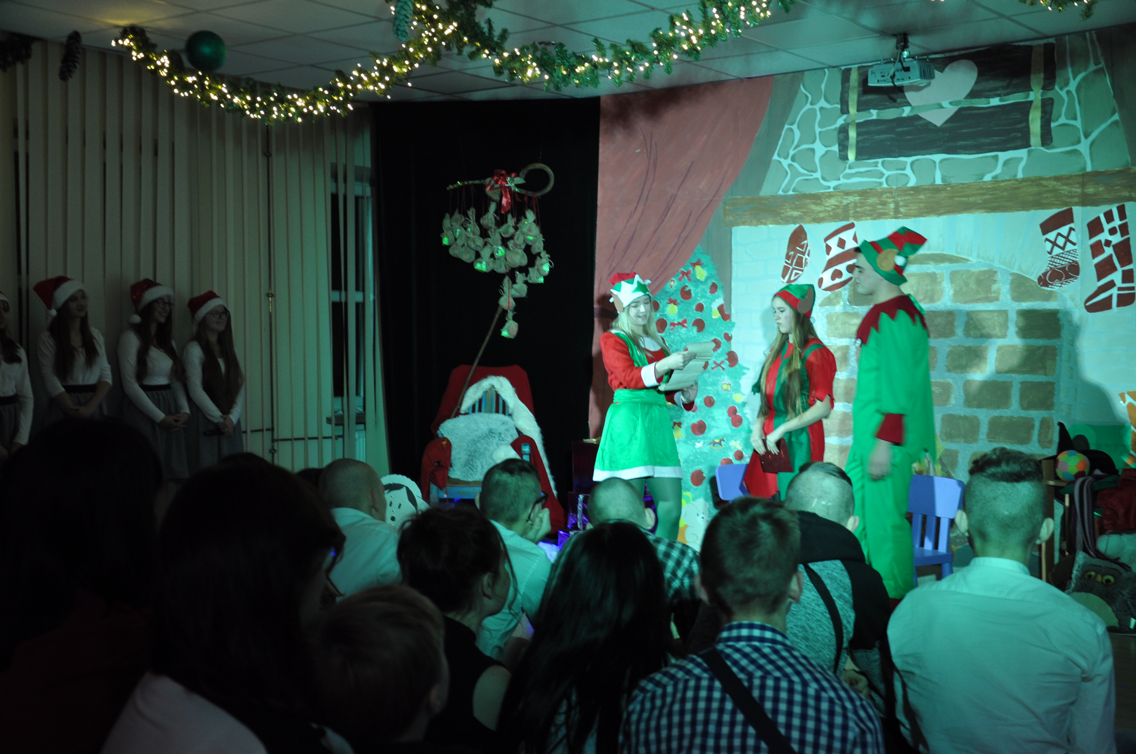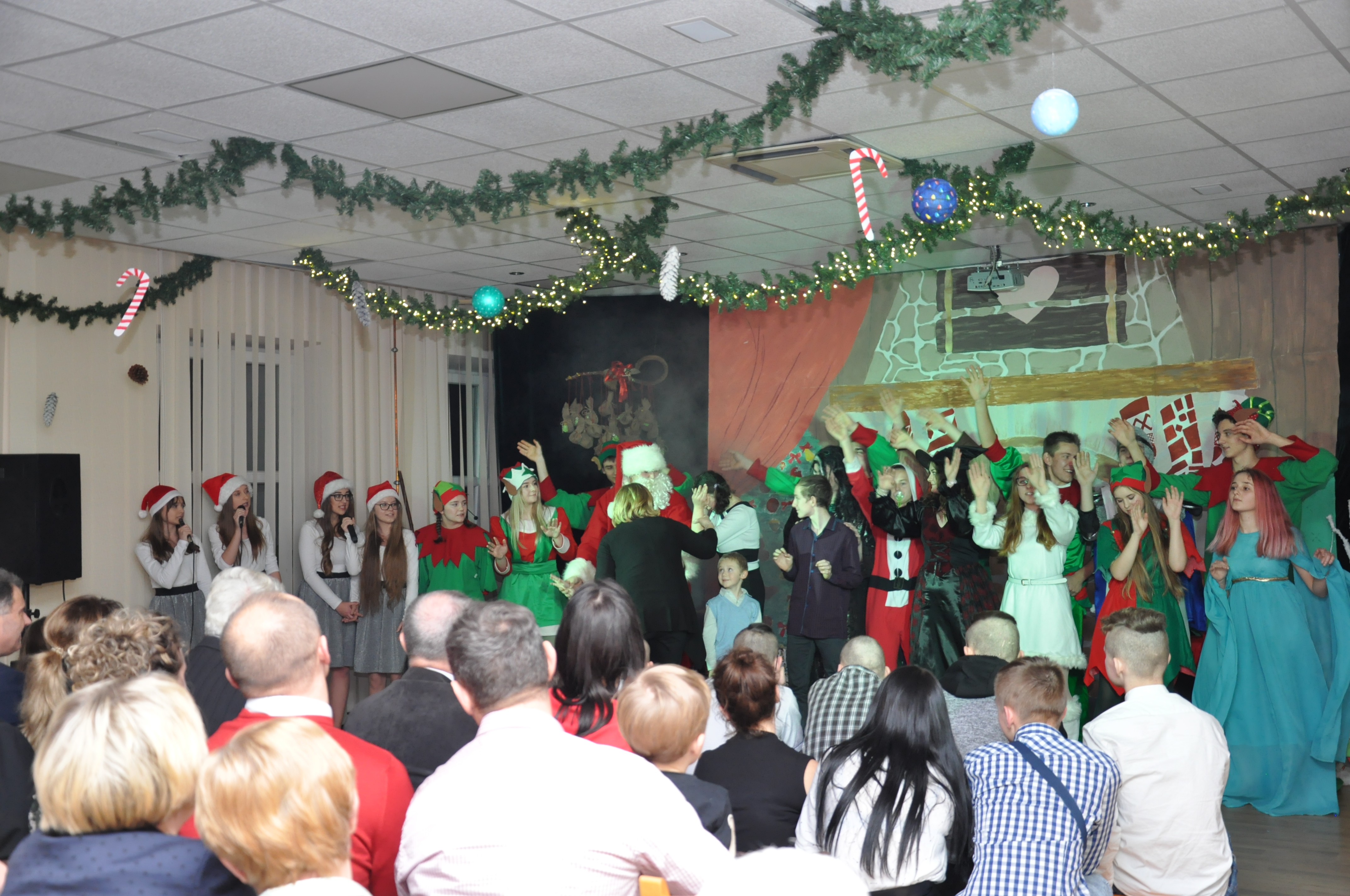 Po wzruszającej przemowie na barwnie udekorowaną scenę sali konferencyjnej szkoły w Zduńskiej Dąbrowie wkroczyli uczniowie, którzy zaprezentowali publiczności jasełkową inscenizację pod wdzięcznym tytułem: „Świąteczny galimatias w krainie Świętego Mikołaja”. Postacie elfów, czarownic, rycerzy i oczywiście Świętego Mikołaja ukazane w sytuacjach zabawnych gagów wprawiły, zwłaszcza najmłodsze audytorium, w nastój rozbawienia wywołujący na twarzach naszych milusińskich grymas uśmiechu oraz radości płynącej prosto z serca. Świąteczną atmosferę podczas występu skutecznie podsycały również przepiękne, polskie piosenki w wykonaniu uczennic naszej szkoły.