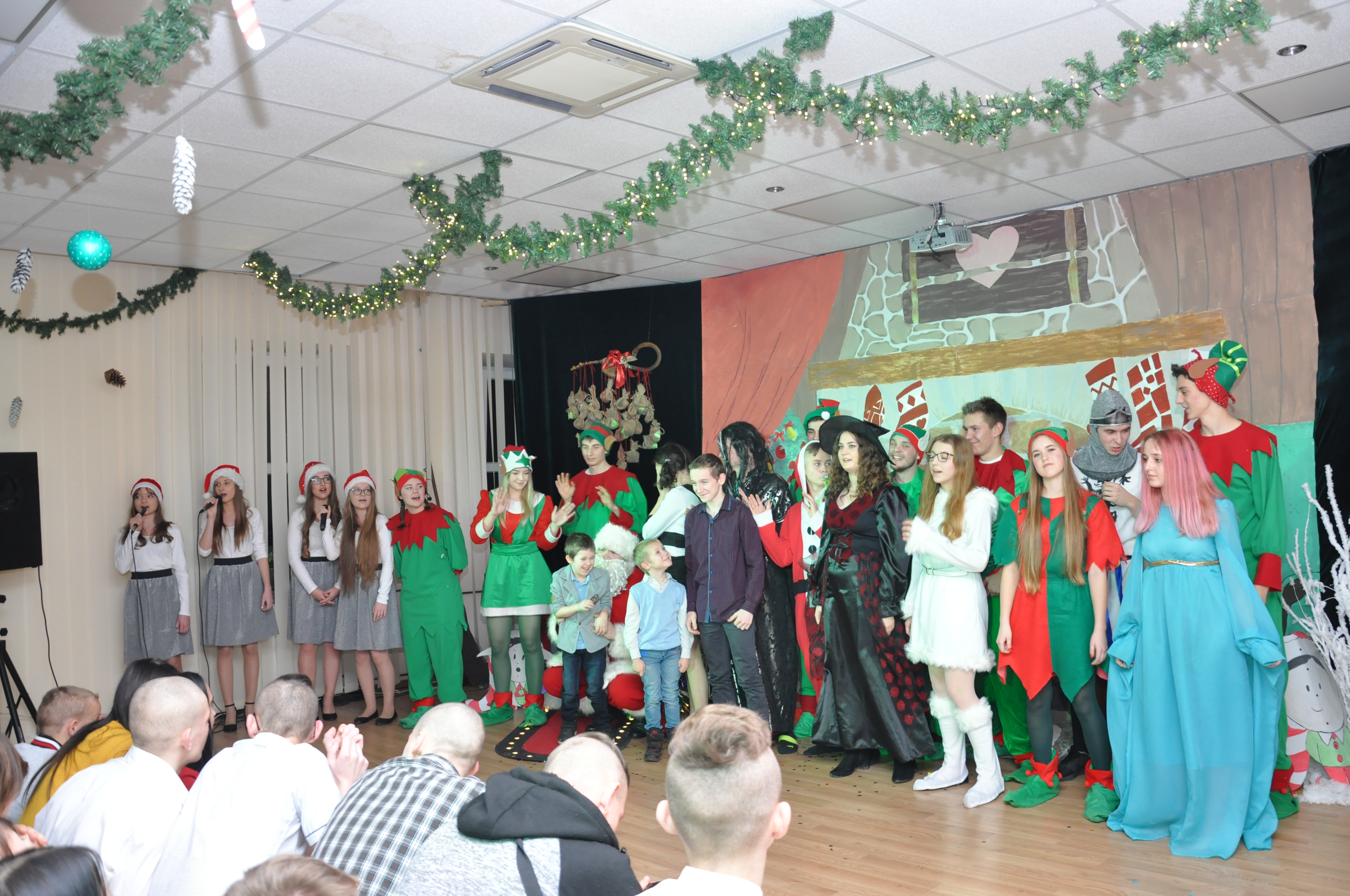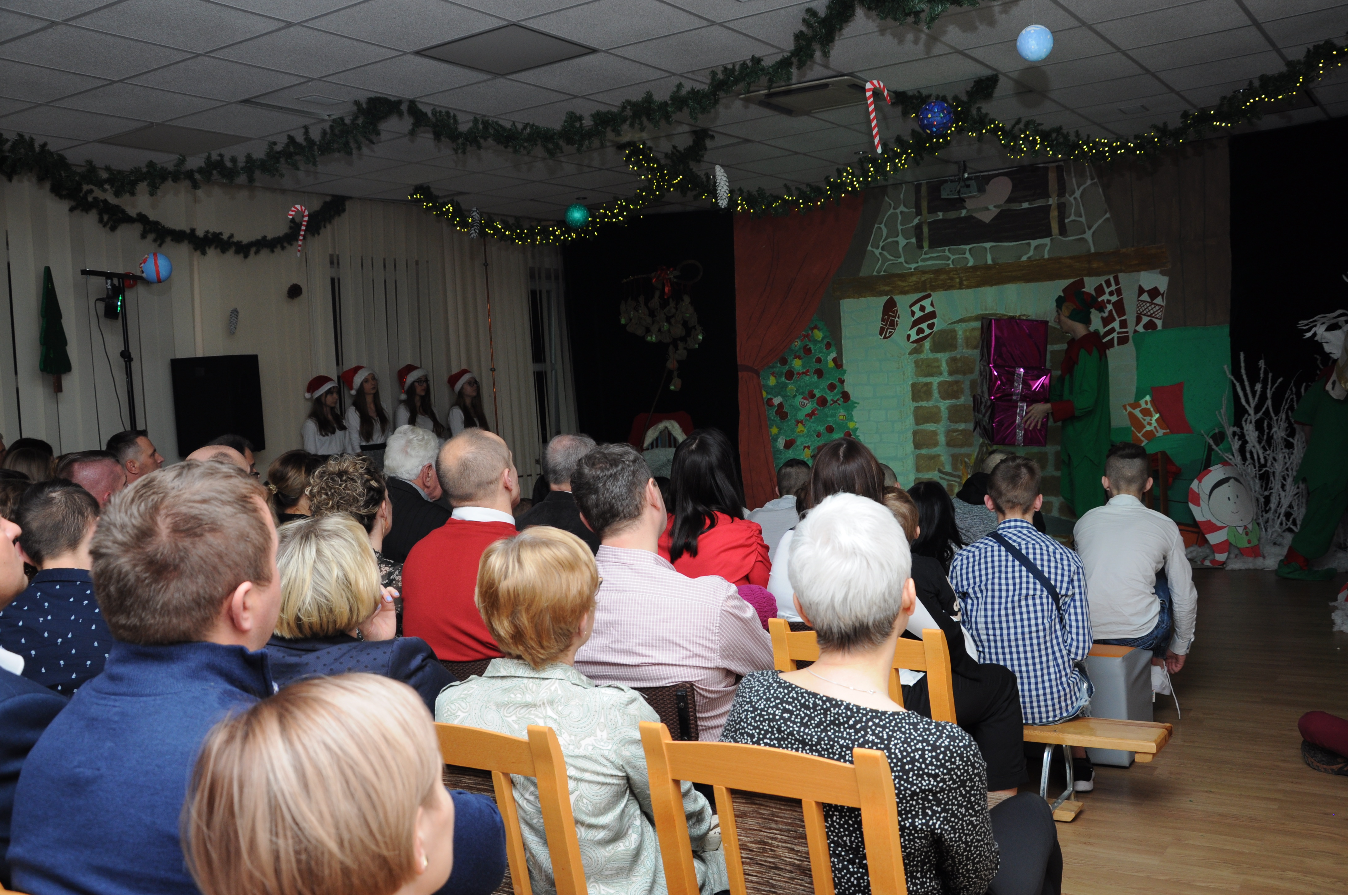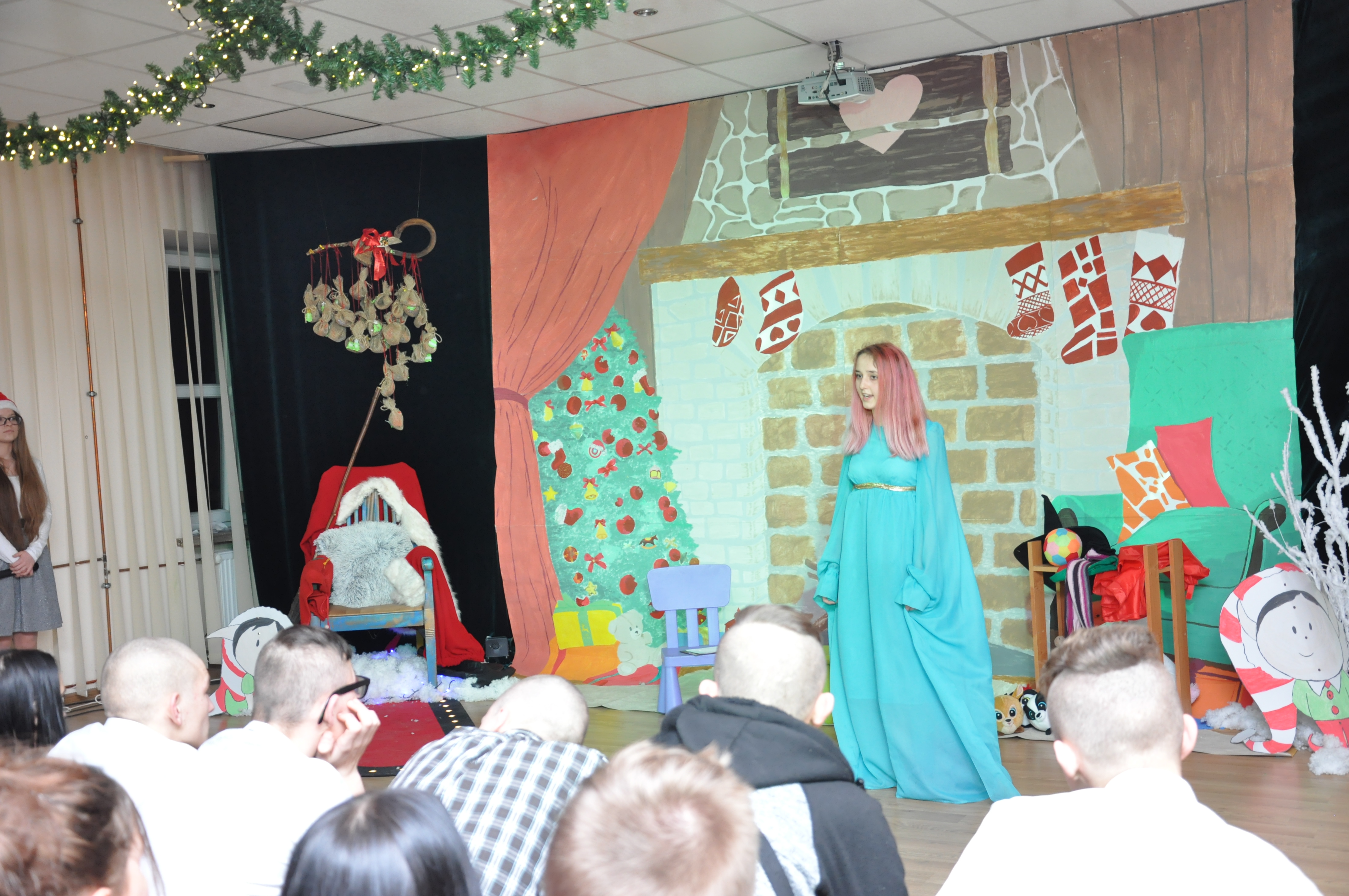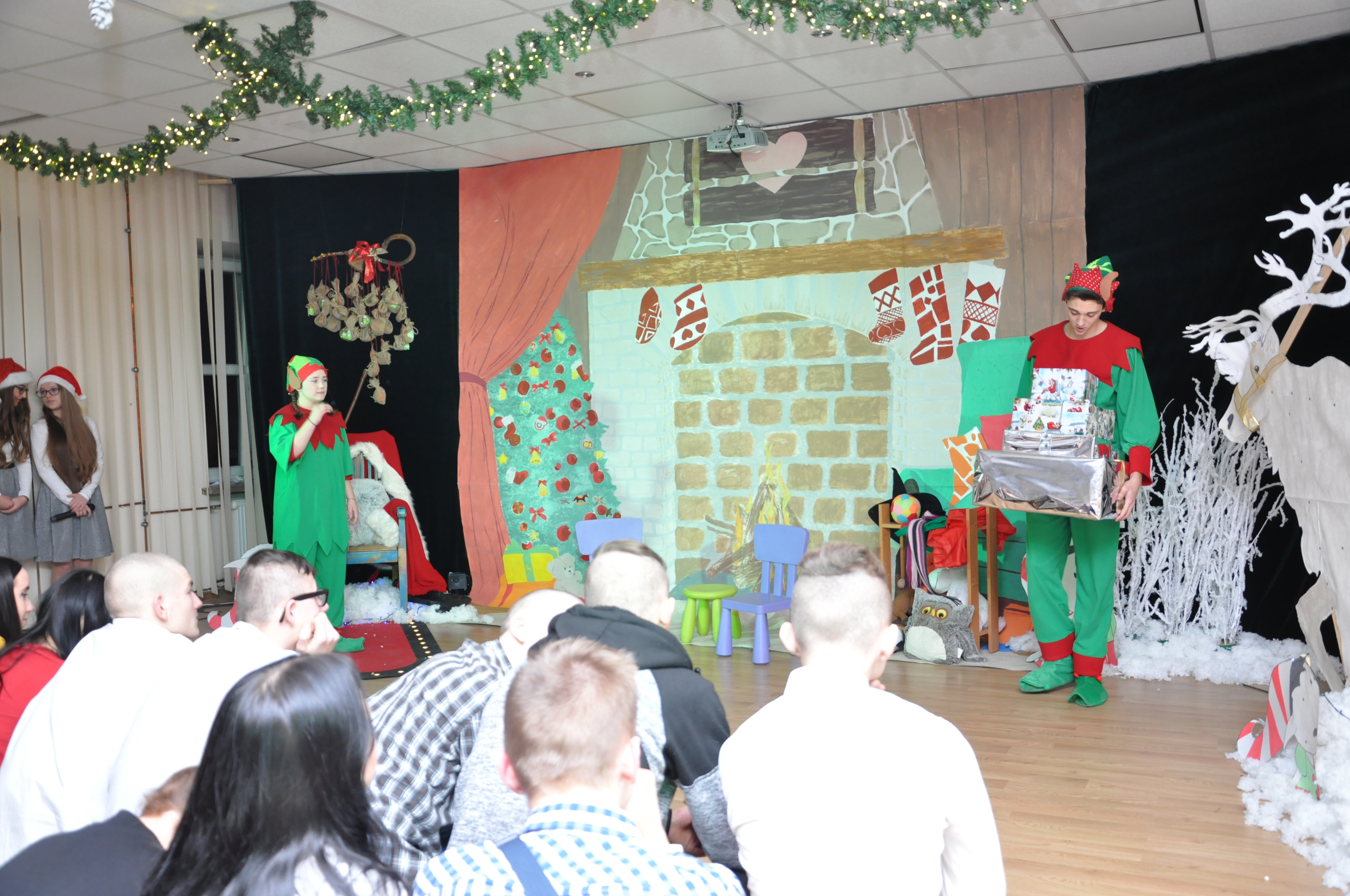 Po wzruszającej przemowie na barwnie udekorowaną scenę sali konferencyjnej szkoły w Zduńskiej Dąbrowie wkroczyli uczniowie, którzy zaprezentowali publiczności jasełkową inscenizację pod wdzięcznym tytułem: „Świąteczny galimatias w krainie Świętego Mikołaja”. Postacie elfów, czarownic, rycerzy i oczywiście Świętego Mikołaja ukazane w sytuacjach zabawnych gagów wprawiły, zwłaszcza najmłodsze audytorium, w nastój rozbawienia wywołujący na twarzach naszych milusińskich grymas uśmiechu oraz radości płynącej prosto z serca. Świąteczną atmosferę podczas występu skutecznie podsycały również przepiękne, polskie piosenki w wykonaniu uczennic naszej szkoły.