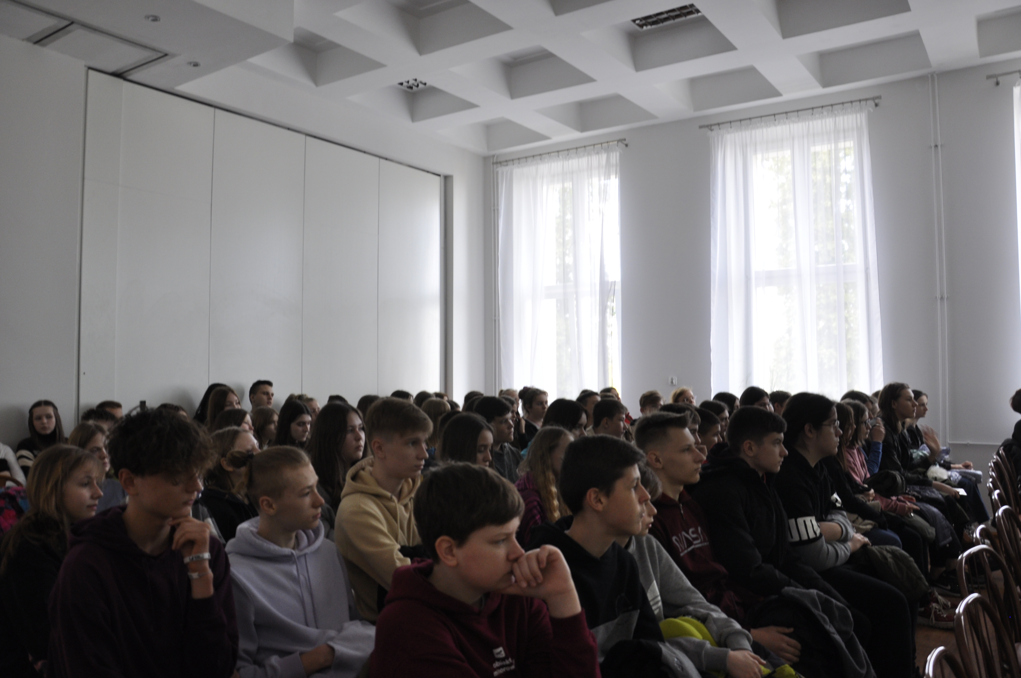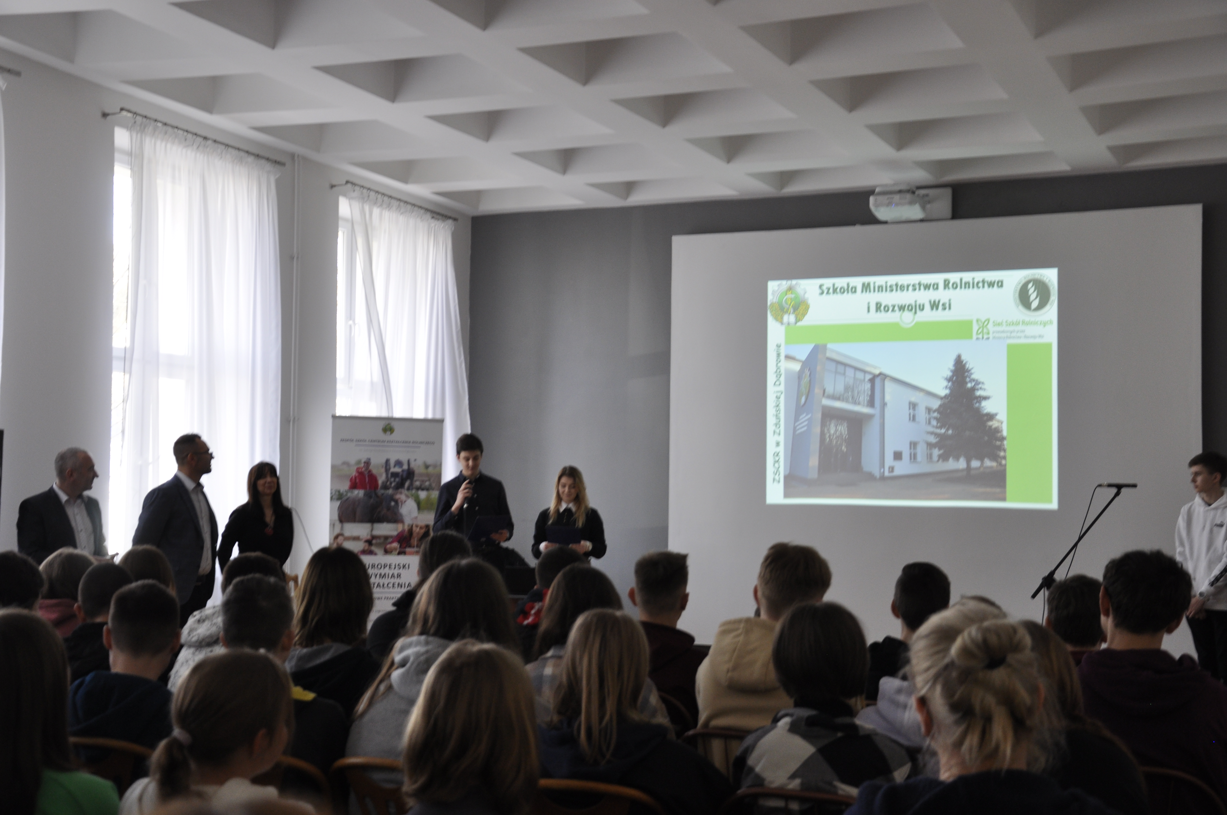 Część oficjalna odbyła się w sali multimedialnej, gdzie około godziny 1030 licznie zgromadzili się uczniowie szkół podstawowych. W pierwszej kolejności głos zabrali uczniowie ze Zduńskiej Dąbrowy – Dominika Kowalczyk i Michał Flisowski, którzy pełnili rolę prowadzących.