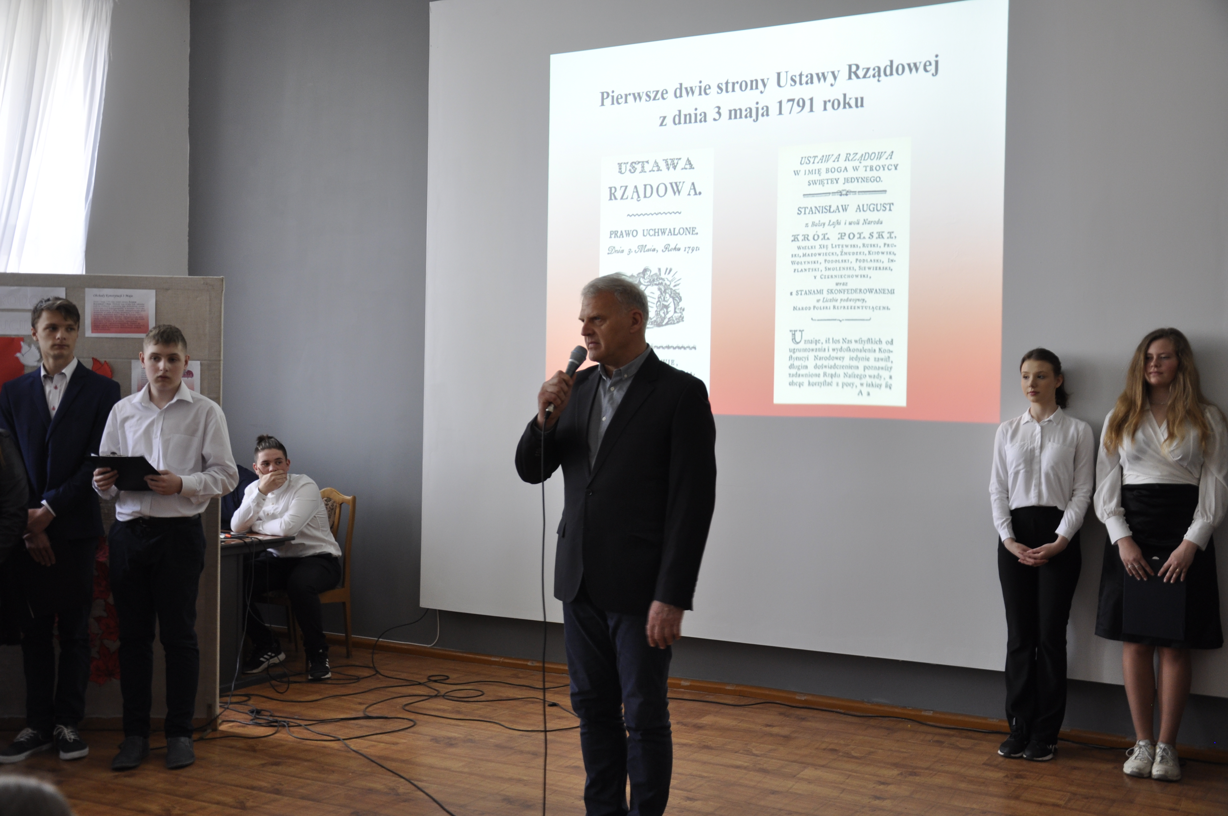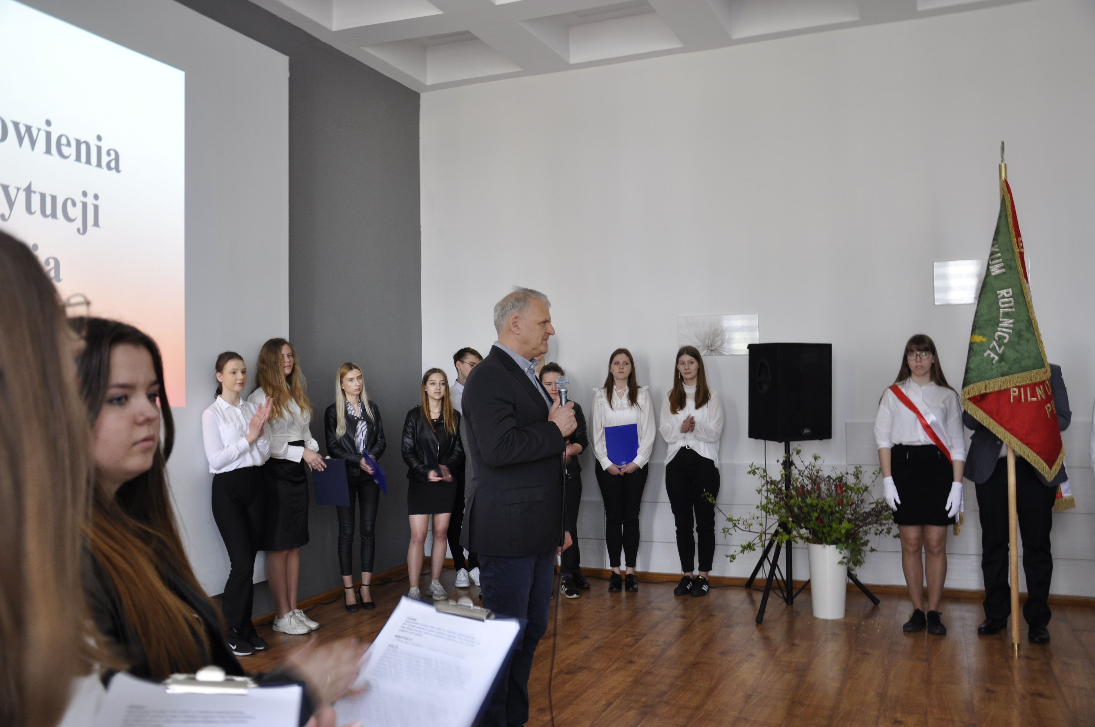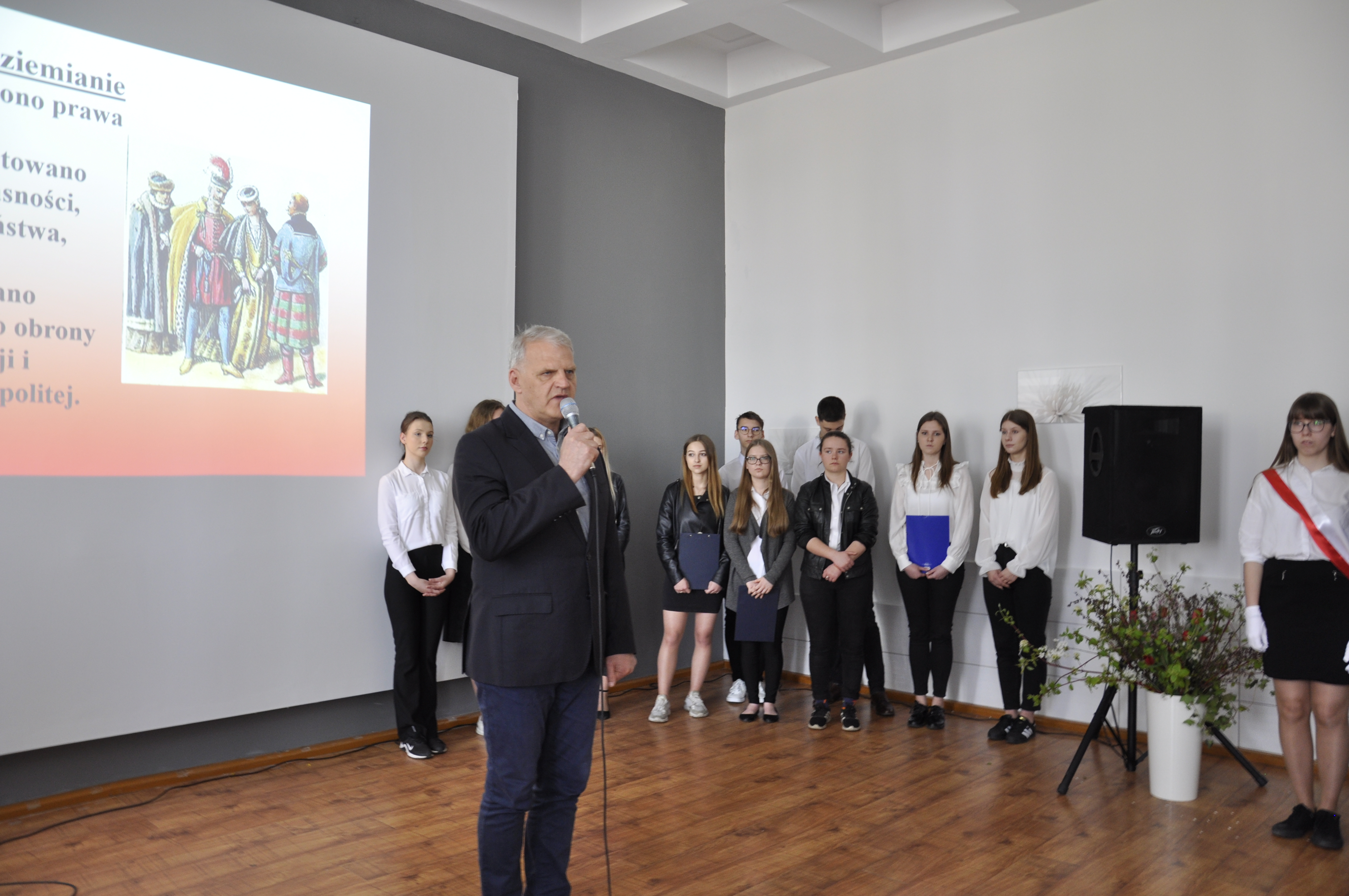 Po zakończeniu części artystycznej uroczystości głos zabrał Dyrektor szkoły – Stanisław Kosmowski, który w kilku słowach podziękował młodym wykonawcom i Ich opiekunom oraz podsumował istotę narodowego święta Konstytucji 3 Maja w zestawieniu z sytuacją geopolityczną mającą obecnie miejsce za naszą wschodnią granicą.