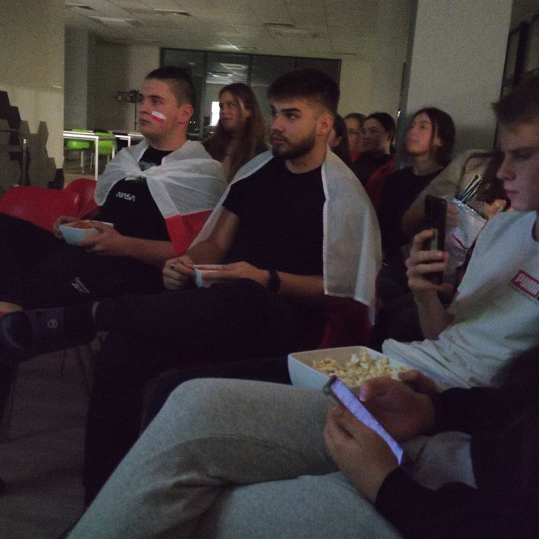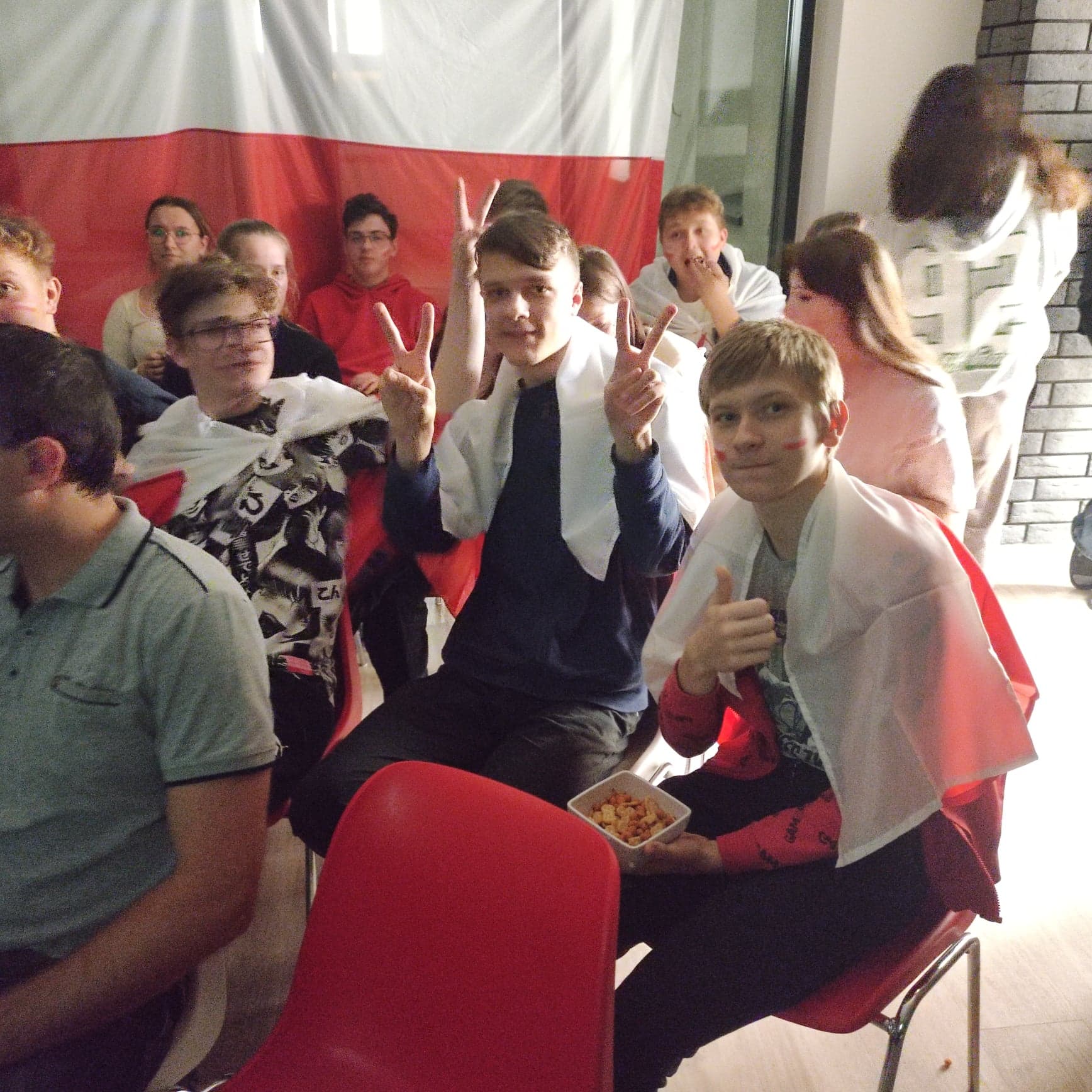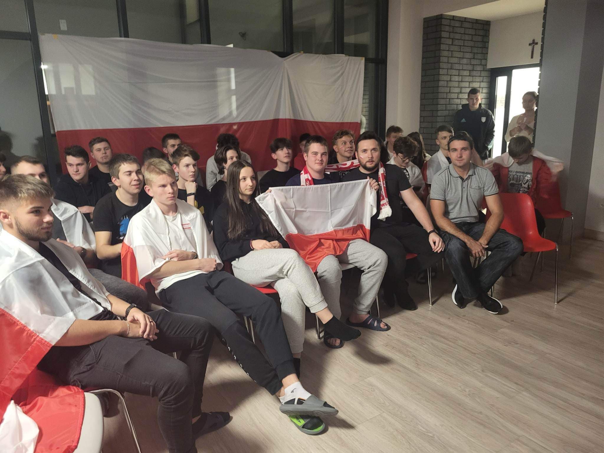 We wtorek, 22 listopada, polska reprezentacja piłkarska rozegrała pierwszy mecz na Mistrzostwach Świata w Katarze. Wychowankowie internatu mecz z reprezentacją Meksyku obejrzeli w specjalnie zorganizowanej strefie kibica. Mimo, iż spotkanie zakończyło się bezbramkowym remisem emocji nie brakowało, a nasza młodzież kibicowała do ostatniego gwizdka sędziego. W czasie meczu nie mogło zabraknąć biało-czerwonych szalików, flag oraz barw narodowych na twarzach naszych uczniów. W czasie oglądania zmagań naszych piłkarzy wychowankowie mieli do dyspozycji popcorn, chipsy, orzeszki oraz ciasteczka, czyli niezbędne przysmaki, po które zwykle sięgamy śledząc mecz przed telewizorem. Przed nami jeszcze co najmniej dwa spotkania biało-czerwonych podczas mundialu w Katarze, chociaż po cichu liczymy, że Polacy zakwalifikują się do kolejnej fazy turnieju, dzięki czemu będziemy mieli kolejne szanse do świetnej zabawy podczas wspólnego kibicowania. Organizatorami strefy kibica byli p. Damian Rybusiewicz oraz p. Cezary Pietrzak.