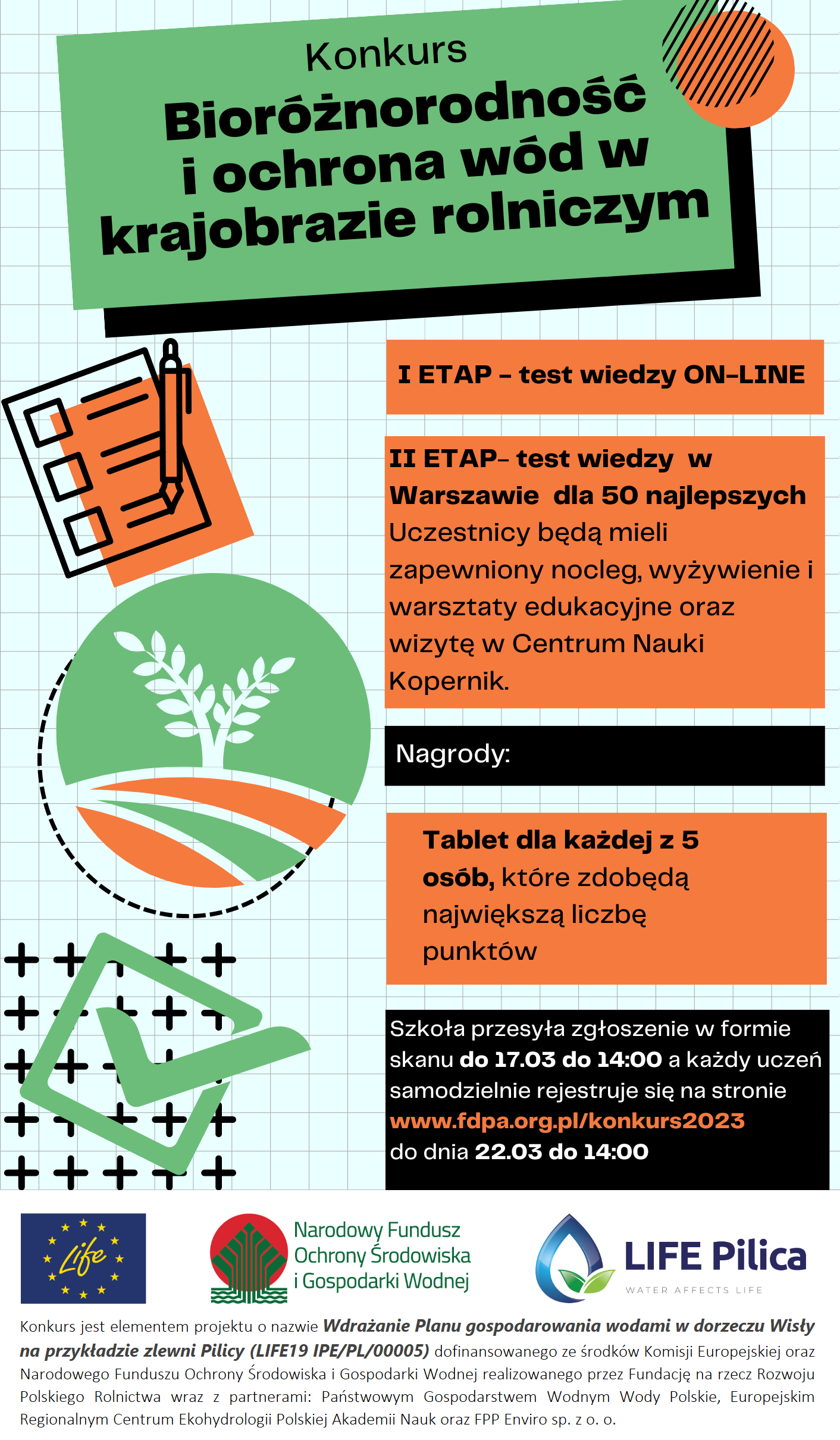 Zapraszamy wszystkich uczniów do udziału w KONKURSIE ” BIORÓŻNORODNOŚĆ I OCHRONA WÓD W KRAJOBRAZIE ROLNICZYM”