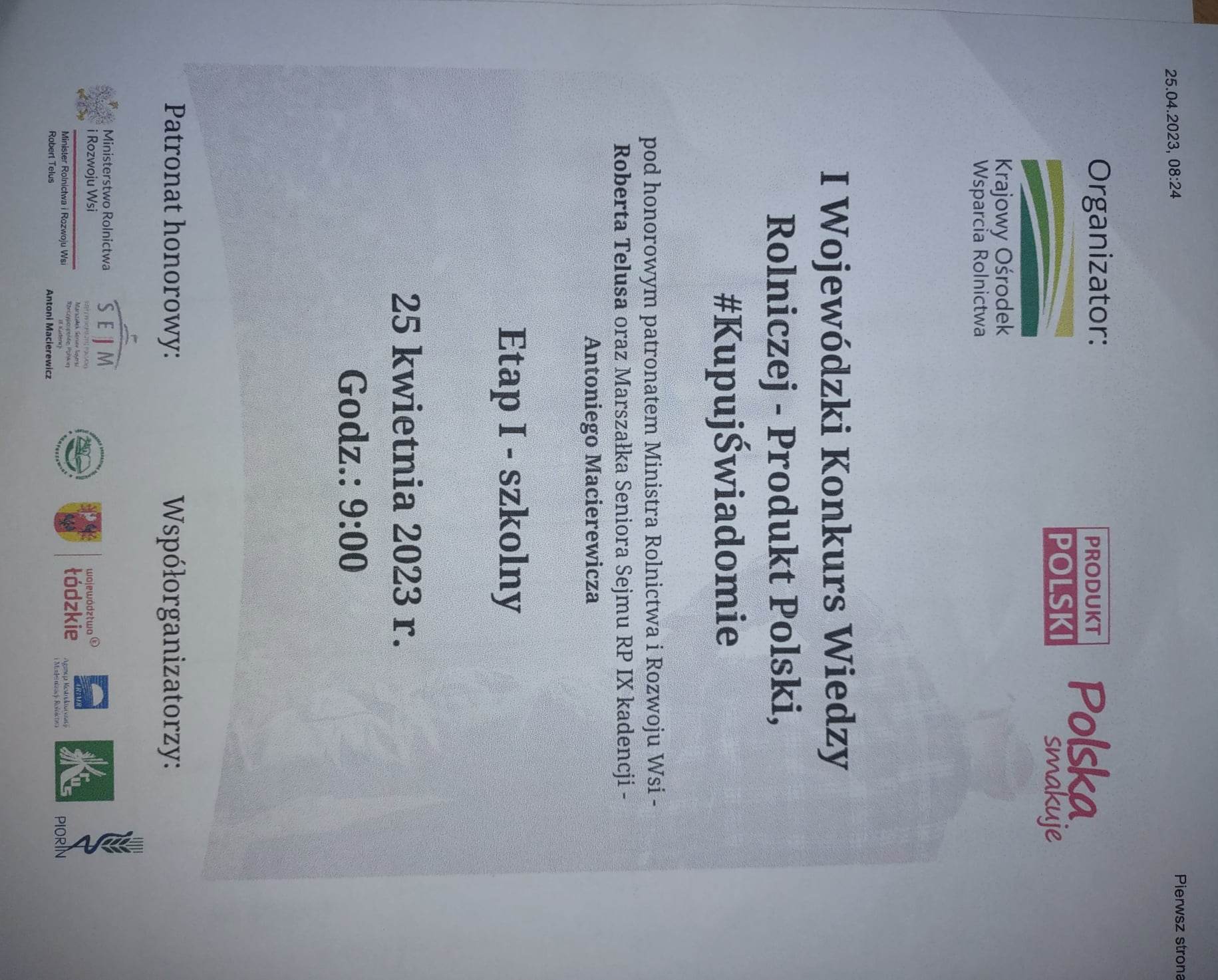 25 kwietnia 2023 roku odbył się etap szkolny I Konkursu Wiedzy Rolniczej – Produkt Polski, Kupuj Świadomie. Wzięło w nim udział 17 uczniów z naszej szkoły. To inicjatywa mająca na celu promowanie wiedzy na temat rolnictwa oraz zachęcanie do świadomego wyboru produktów pochodzących z polskich upraw i hodowli.