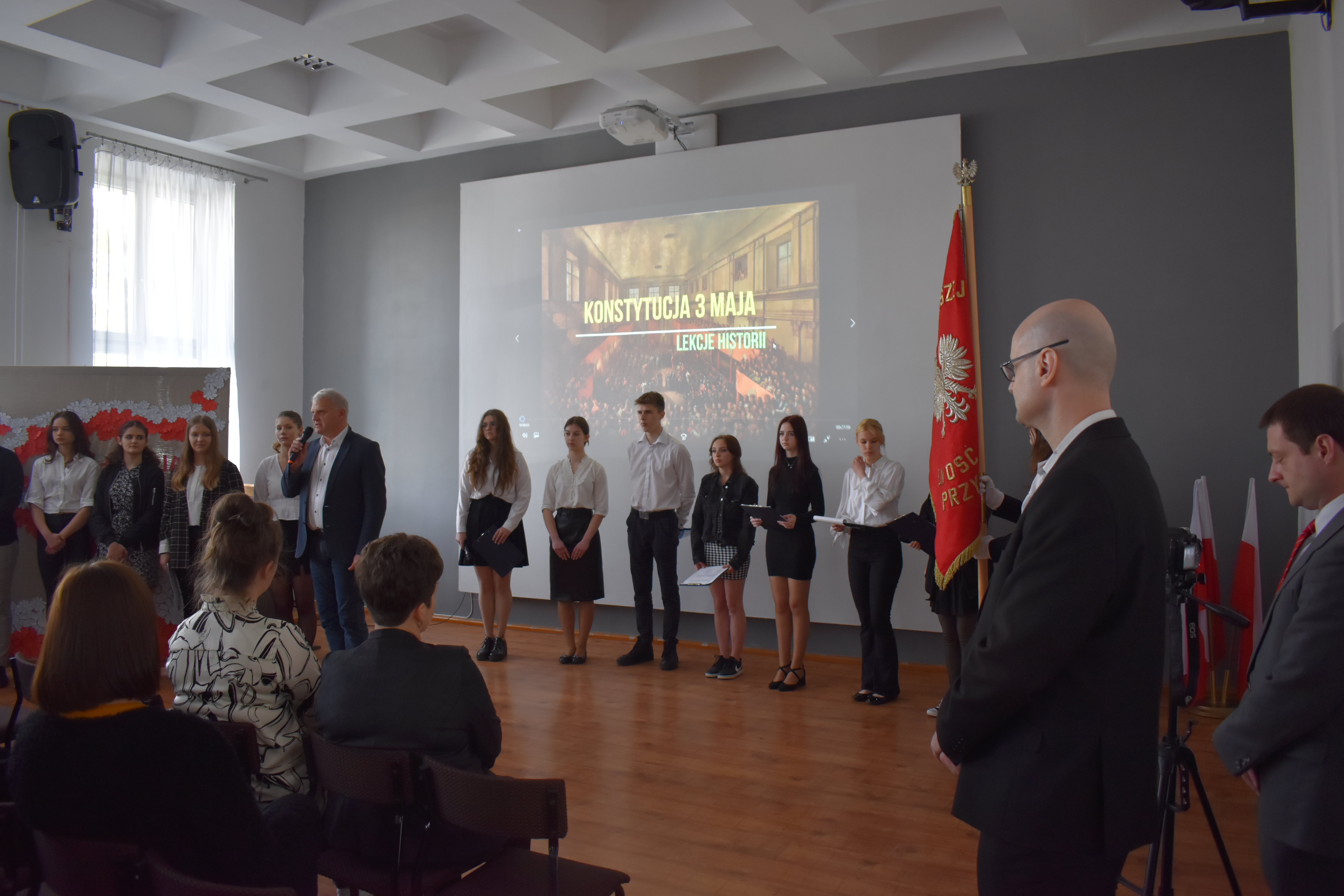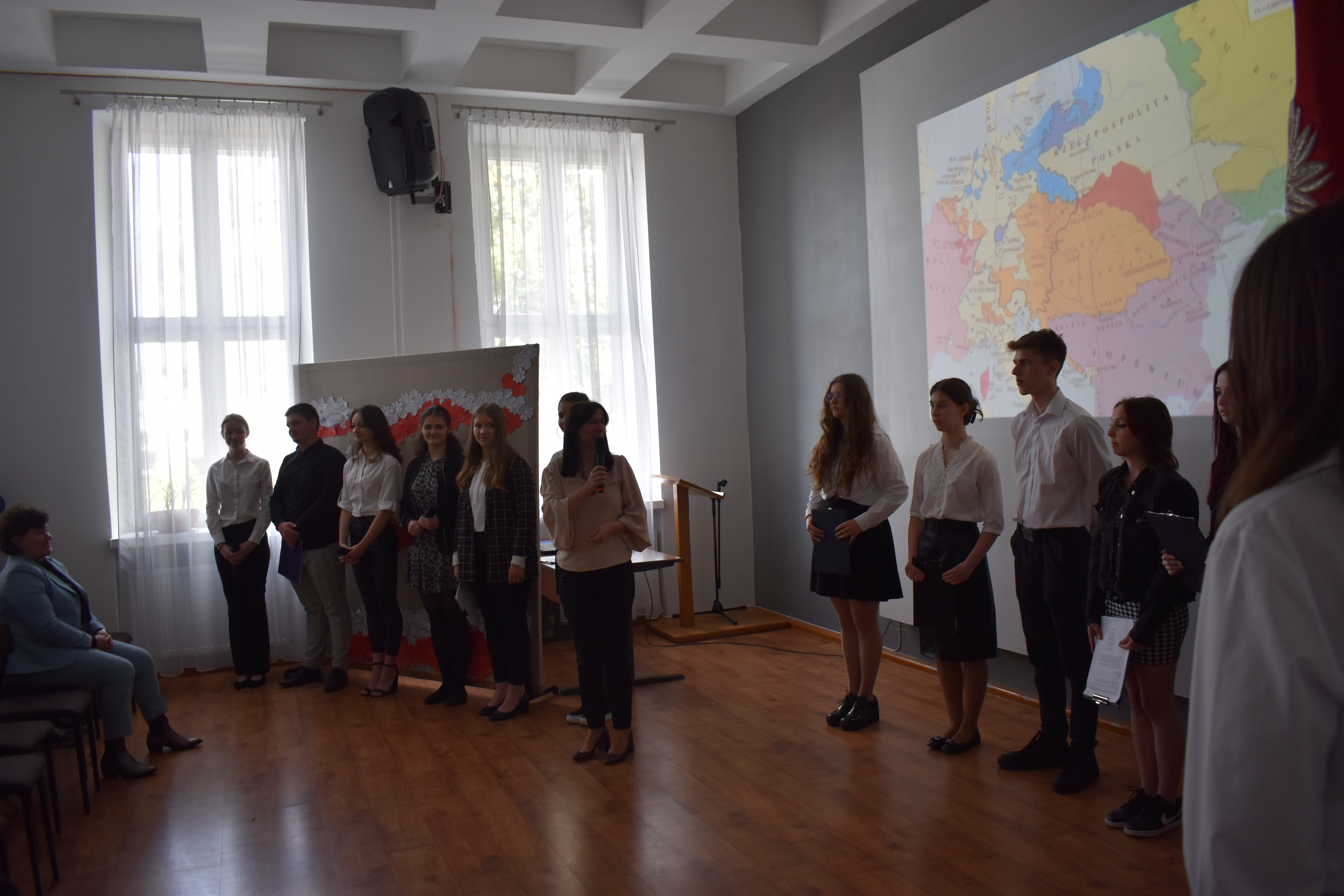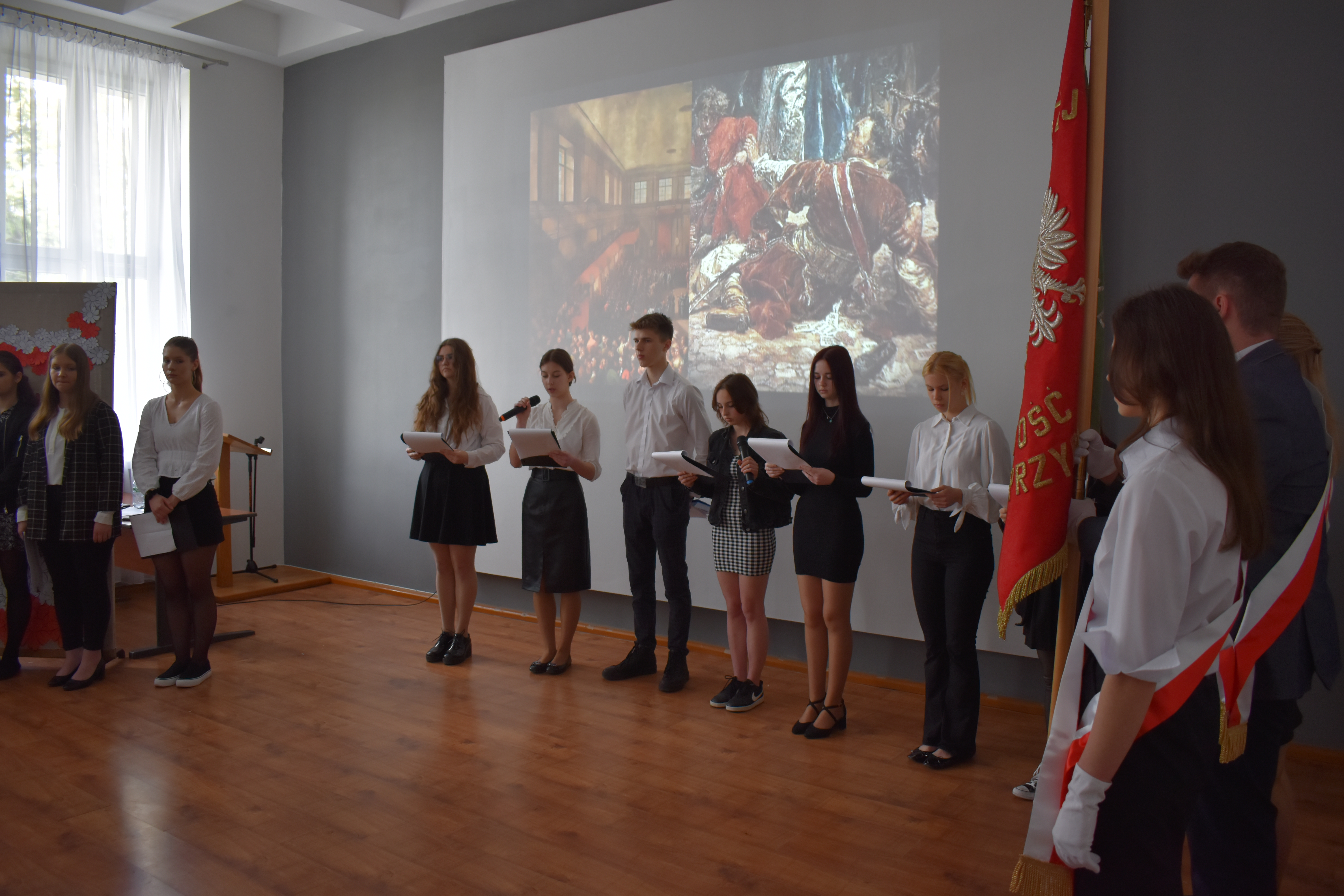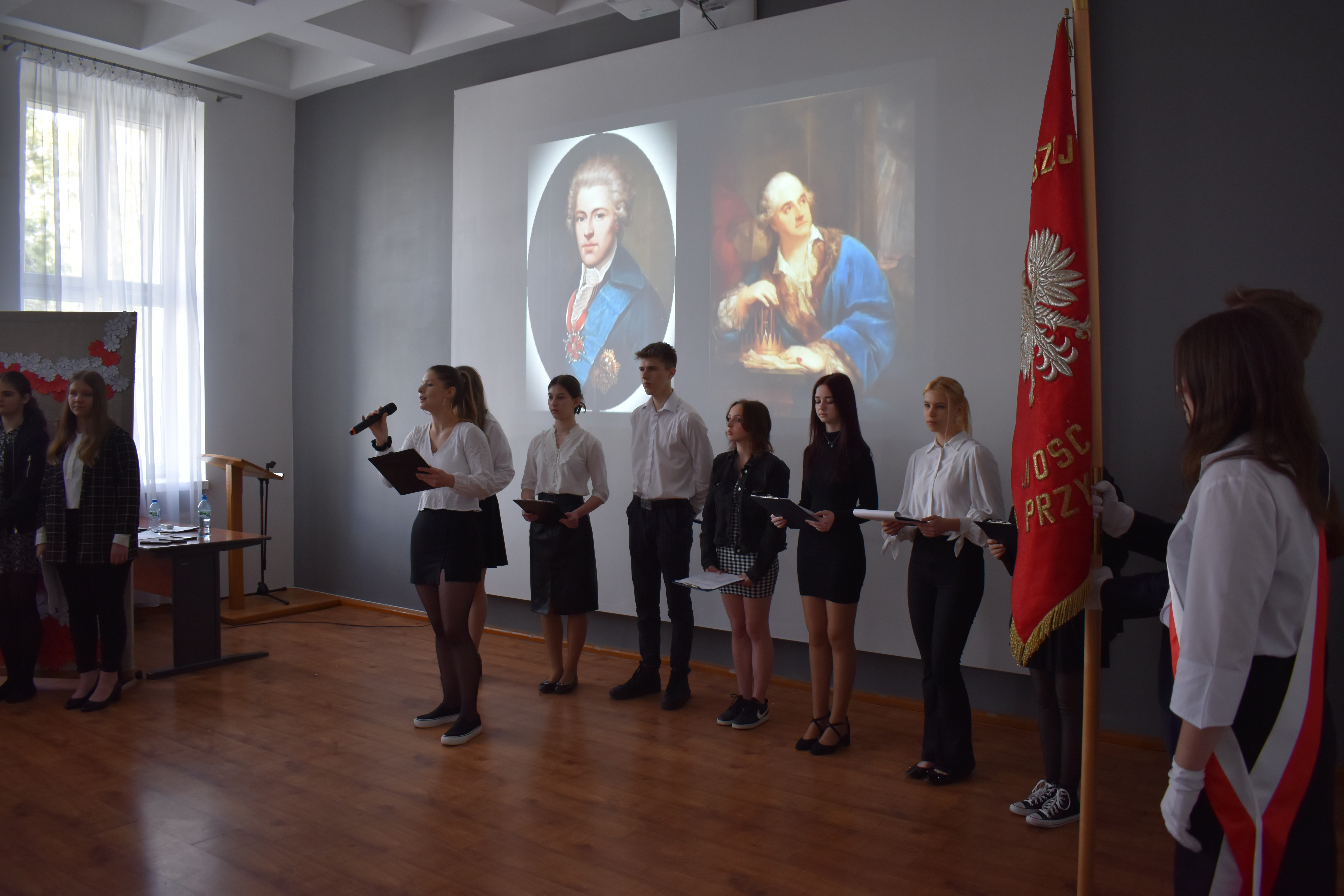 W czwartkowe przedpołudnie 27 kwietnia szkolne mury w Zduńskiej Dąbrowie przepełnione były majowym klimatem wielkiego narodowego święta związanego z uchwaleniem w roku 1791 pierwszej w Europie, a drugiej na świecie konstytucji. Zgodnie z wieloletnią tradycją, czyniąc zadość patriotycznym wartościom, uczniowie naszej placówki przygotowali jak co roku uroczystą akademię z okazji 232 rocznicy powołania do życia tego wyjątkowego dla historii Polski aktu normatywnego. Część oficjalna przedsięwzięcia rozpoczęła się od wprowadzenia pocztu sztandarowego, wspólnego odśpiewania hymnu narodowego i okolicznościowego przemówienia dyrektora szkoły – pana Stanisława Kosmowskiego. W dalszej kolejności scena sali multimedialnej naszej placówki należała już do młodych artystów, którzy pod kierunkiem nauczycieli zaprezentowali widowni niezwykle barwny pod względem merytorycznym, słowno-muzyczny montaż, przeplatanymi nastrojowymi pieśniami oraz patriotycznymi wierszami, dodatkowo okraszonymi niezwykle wymownym filmem edukacyjnym wyświetlanym podczas występu, a mającym na celu ukazać młodzieży realia Polski okresu XVIII wieku. Wielkie zaangażowanie i ciężka praca uczniów przygotowujących akademię zaowocowały wyjątkowym spektaklem pobudzającym historyczne zmysły publiki , która odwzajemniła się gromkimi brawami i wyrazami uznania.