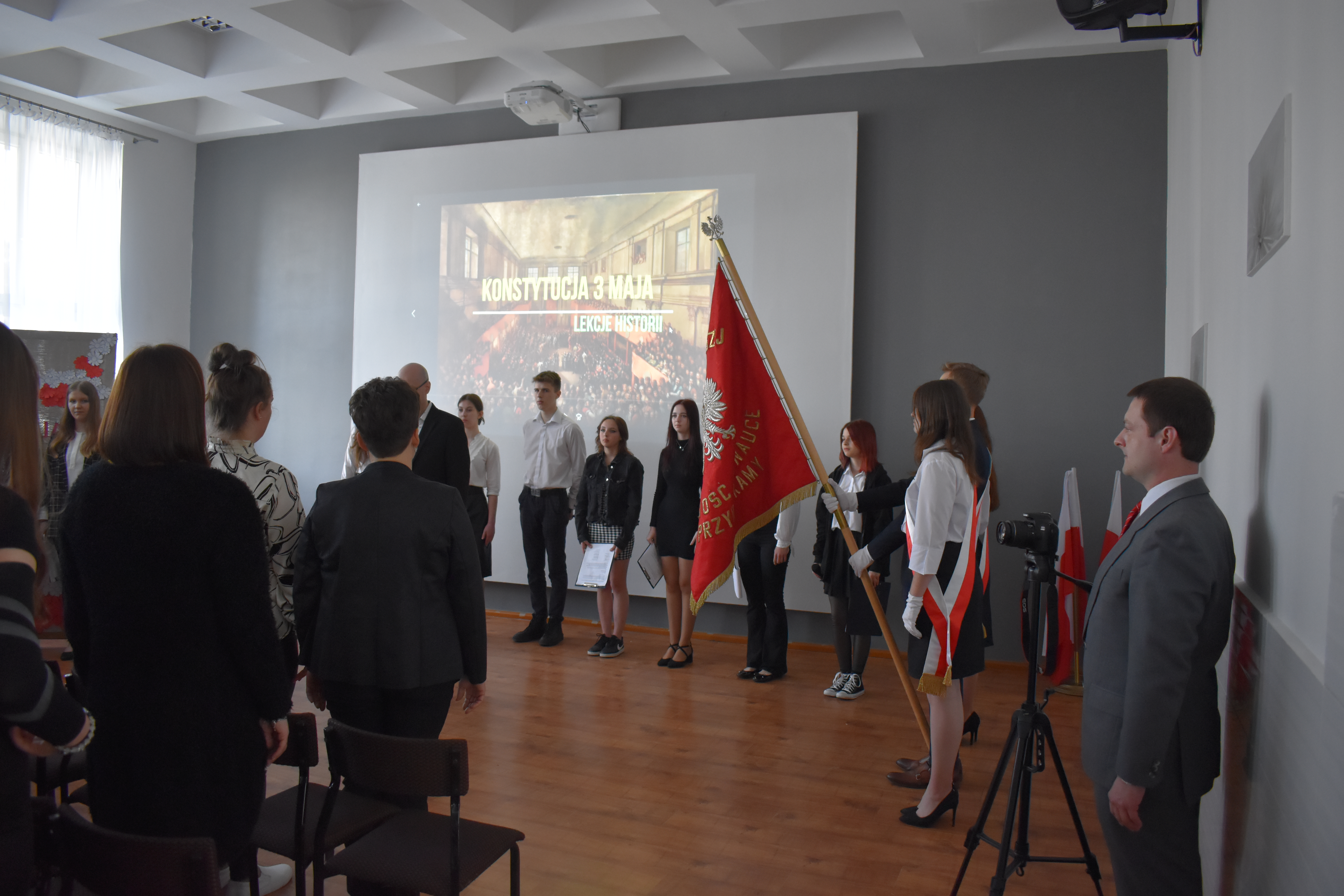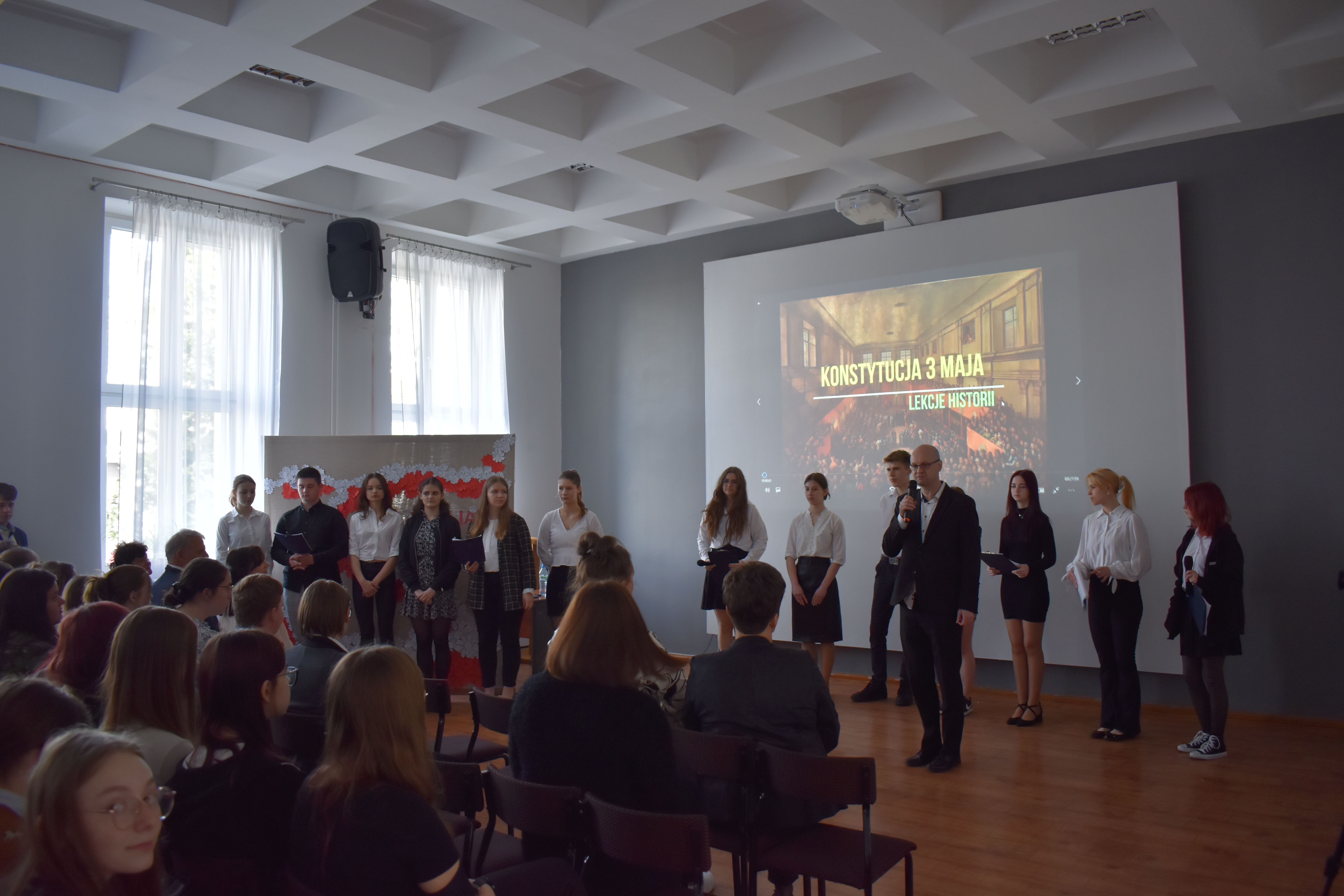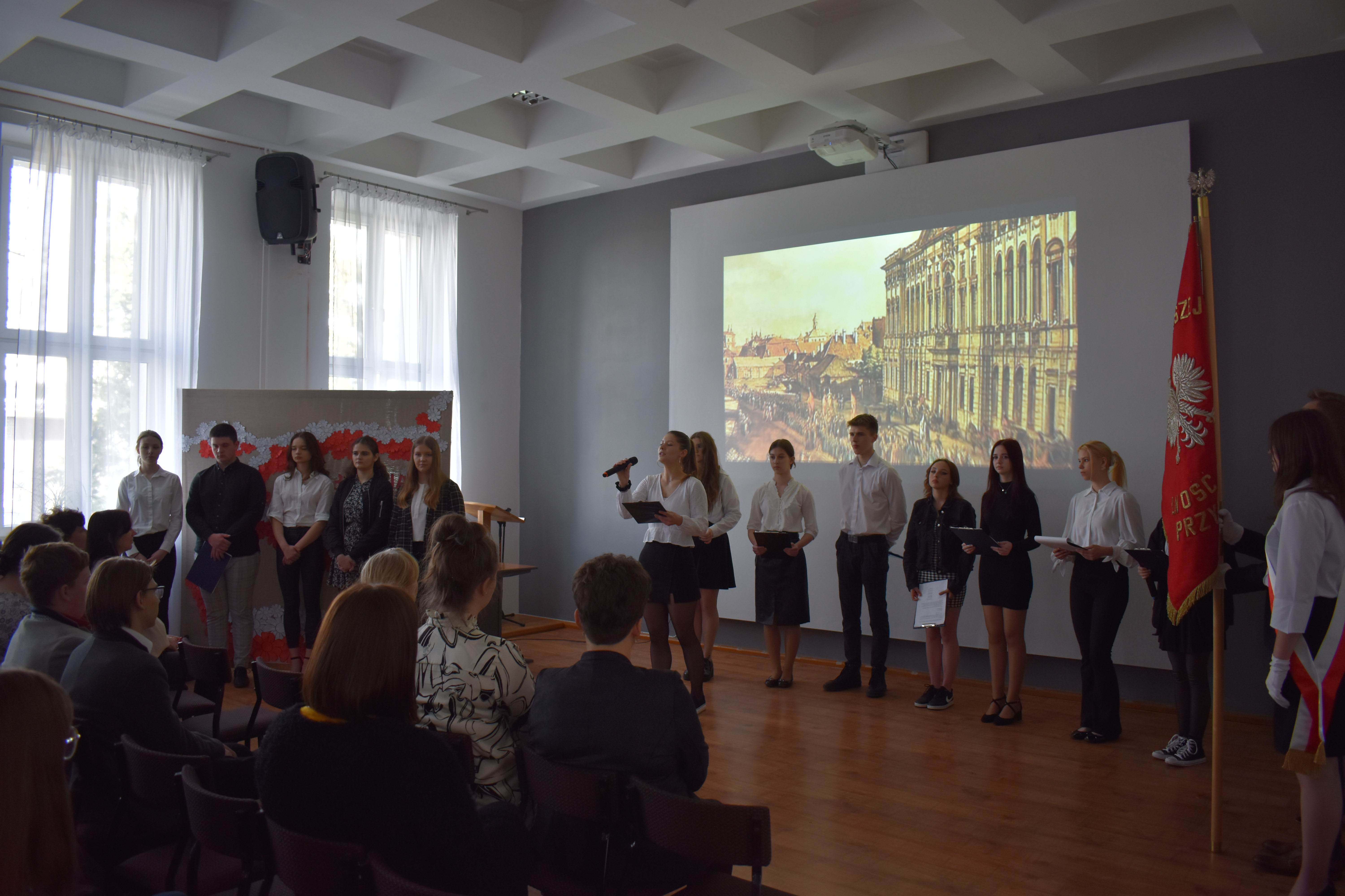 W czwartkowe przedpołudnie 27 kwietnia szkolne mury w Zduńskiej Dąbrowie przepełnione były majowym klimatem wielkiego narodowego święta związanego z uchwaleniem w roku 1791 pierwszej w Europie, a drugiej na świecie konstytucji. Zgodnie z wieloletnią tradycją, czyniąc zadość patriotycznym wartościom, uczniowie naszej placówki przygotowali jak co roku uroczystą akademię z okazji 232 rocznicy powołania do życia tego wyjątkowego dla historii Polski aktu normatywnego. Część oficjalna przedsięwzięcia rozpoczęła się od wprowadzenia pocztu sztandarowego, wspólnego odśpiewania hymnu narodowego i okolicznościowego przemówienia dyrektora szkoły – pana Stanisława Kosmowskiego. W dalszej kolejności scena sali multimedialnej naszej placówki należała już do młodych artystów, którzy pod kierunkiem nauczycieli zaprezentowali widowni niezwykle barwny pod względem merytorycznym, słowno-muzyczny montaż, przeplatanymi nastrojowymi pieśniami oraz patriotycznymi wierszami, dodatkowo okraszonymi niezwykle wymownym filmem edukacyjnym wyświetlanym podczas występu, a mającym na celu ukazać młodzieży realia Polski okresu XVIII wieku. Wielkie zaangażowanie i ciężka praca uczniów przygotowujących akademię zaowocowały wyjątkowym spektaklem pobudzającym historyczne zmysły publiki , która odwzajemniła się gromkimi brawami i wyrazami uznania.