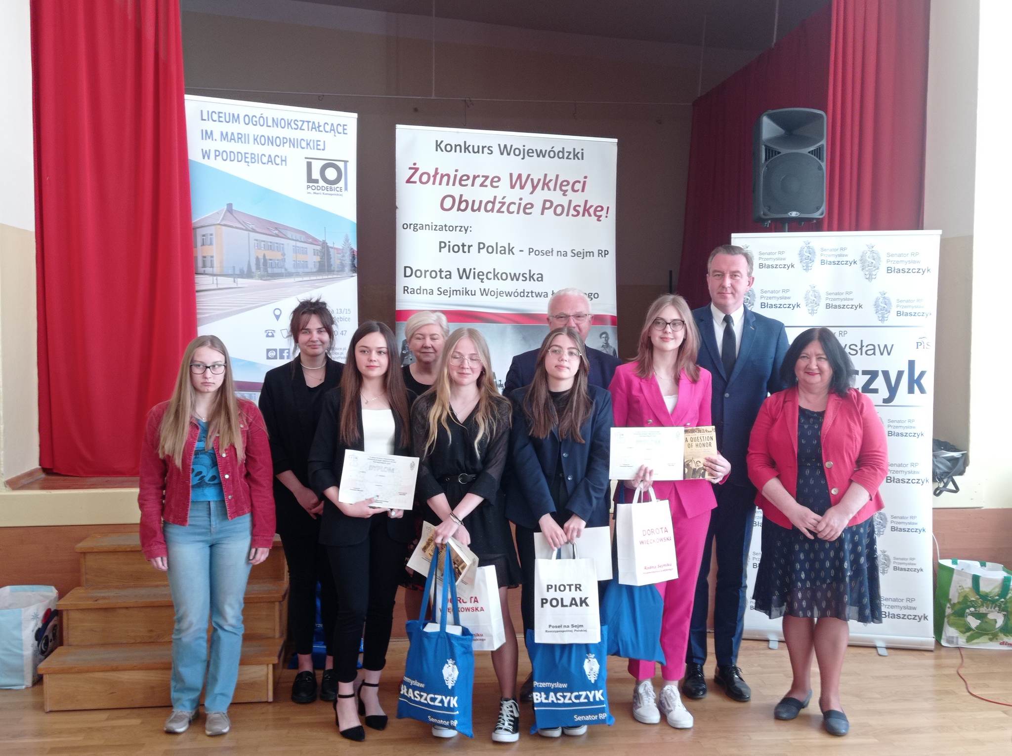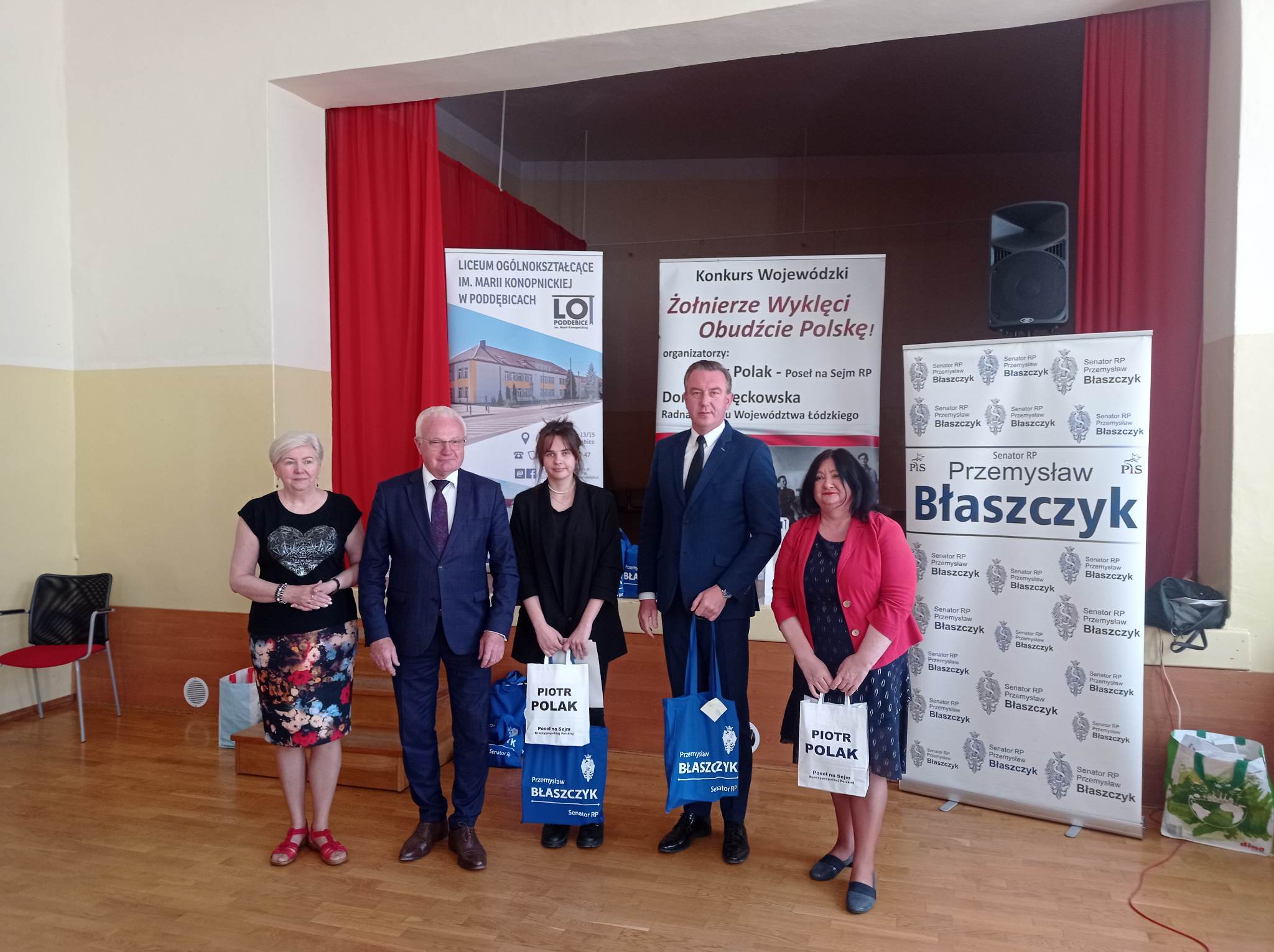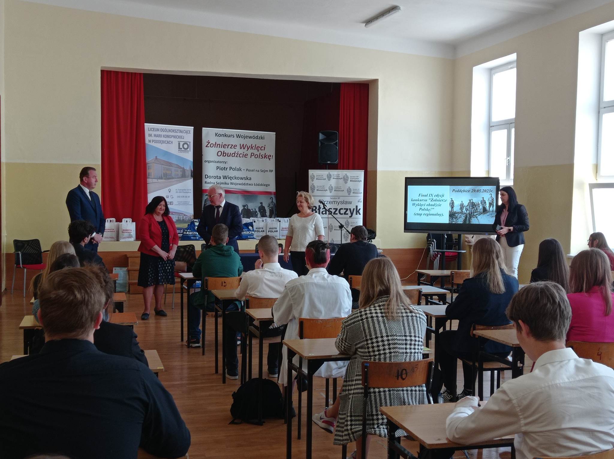 W poniedziałek 29 maja uczniowie naszej szkoły w osobach: Przemysław Rześny, Bartłomiej Góral oraz Weronika Bakalarz wzięli udział w etapie regionalnym IX edycji konkursu „Żołnierze Wyklęci obudźcie Polskę”, który przeprowadzony został w Liceum Ogólnokształcącym im. Marii Konopnickiej w Poddębicach. Dokładnie o godzinie 10.00 38 laureatów etapu szkolnego z powiatów: łowickiego, kutnowskiego, poddębickiego i łęczyckiego przystąpiło do pisemnej rywalizacji w tematyce związanej ze zbrojnym podziemiem antykomunistycznym rozwiązując test składający się z 30 pytań.