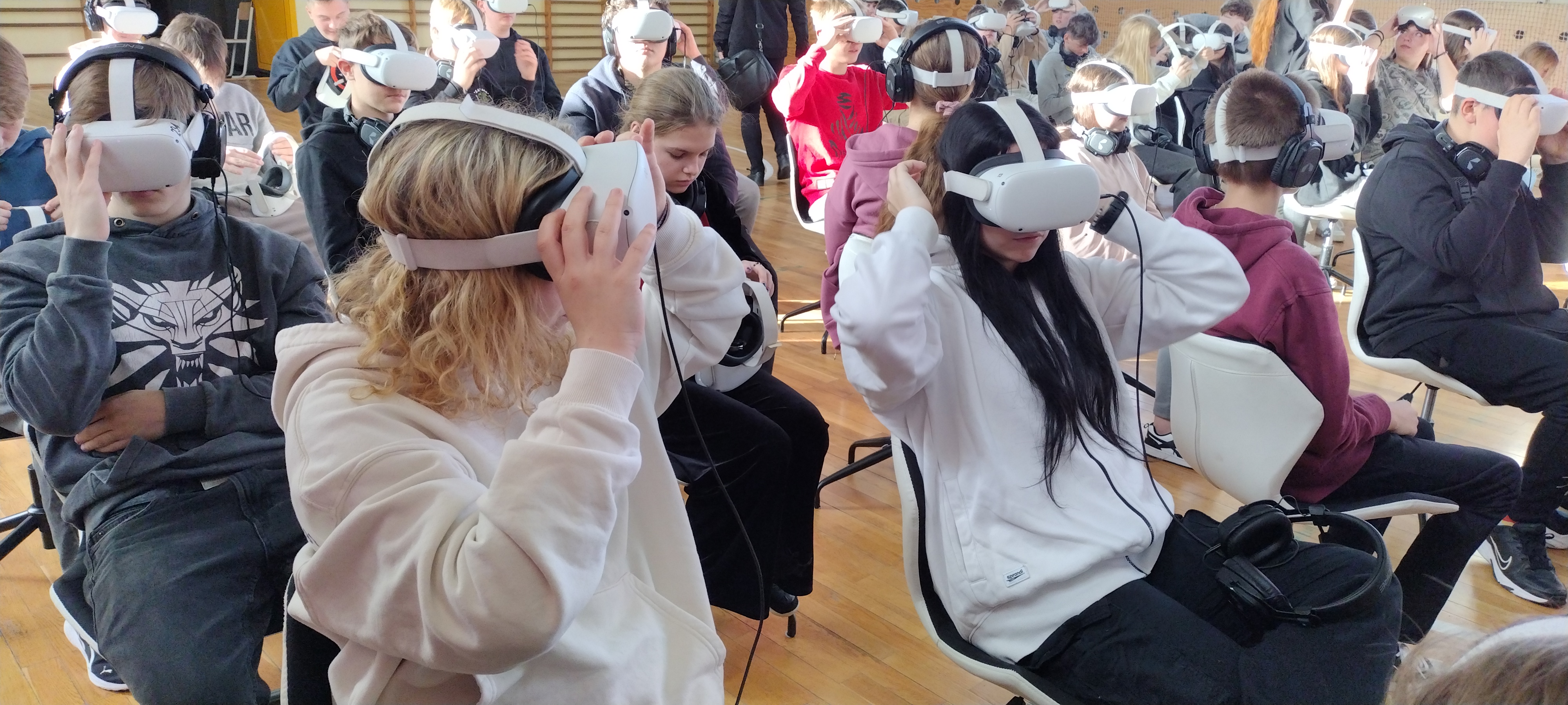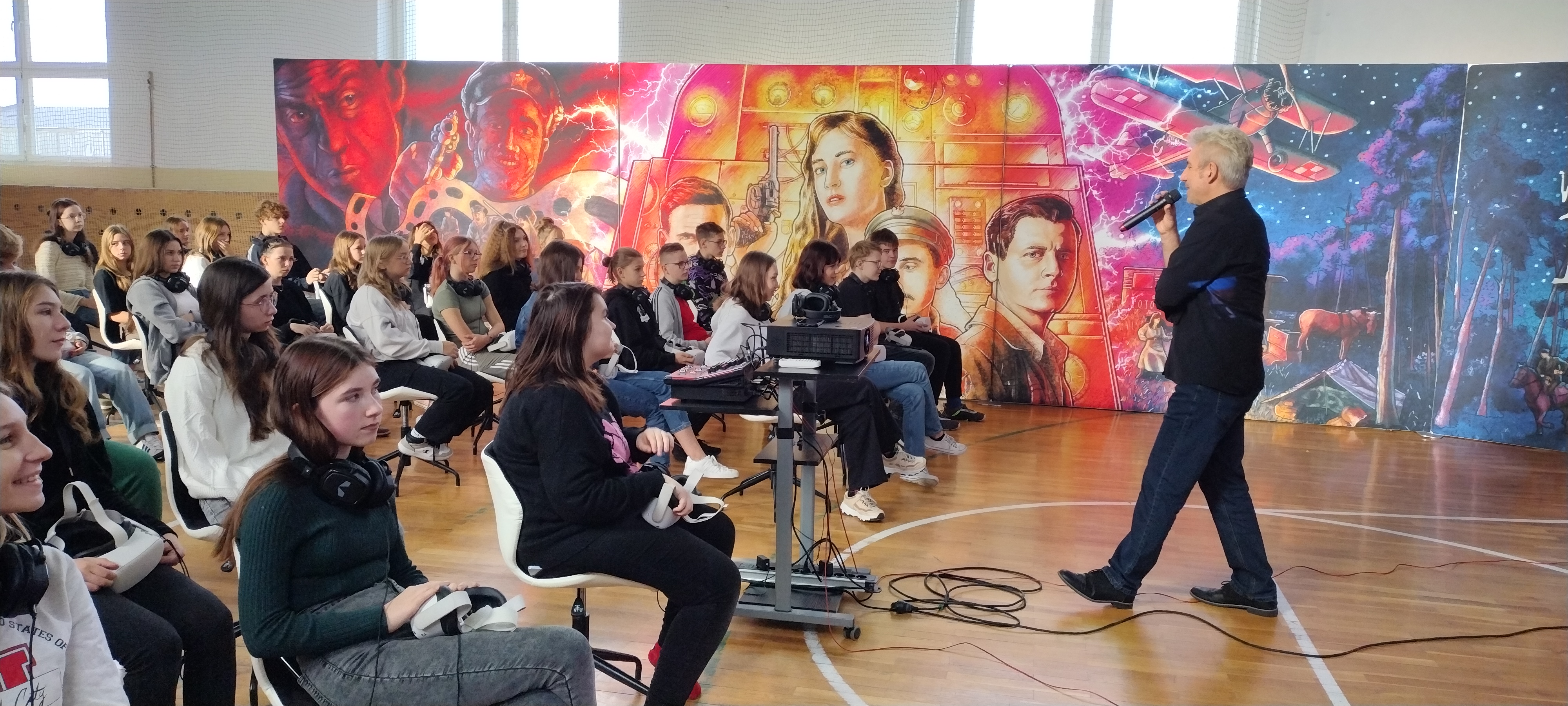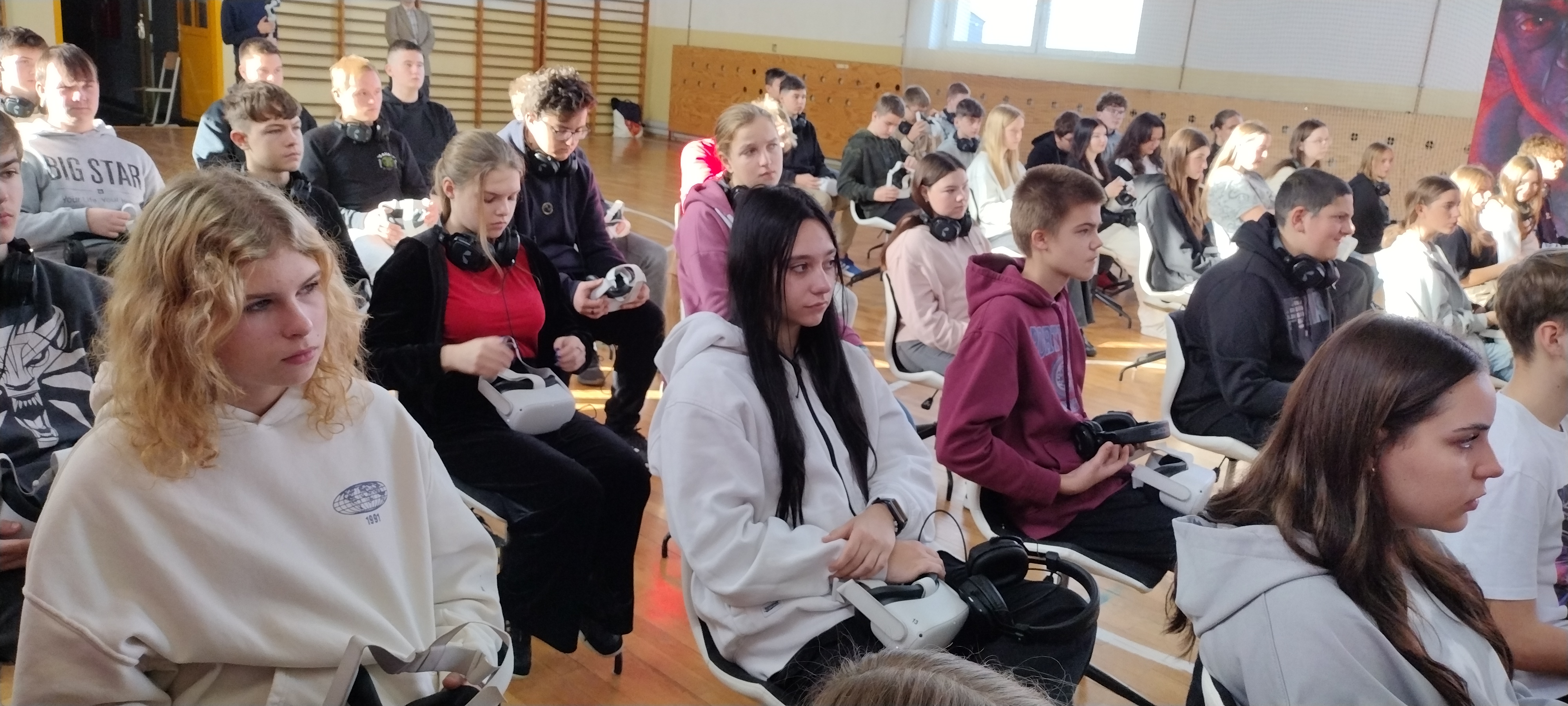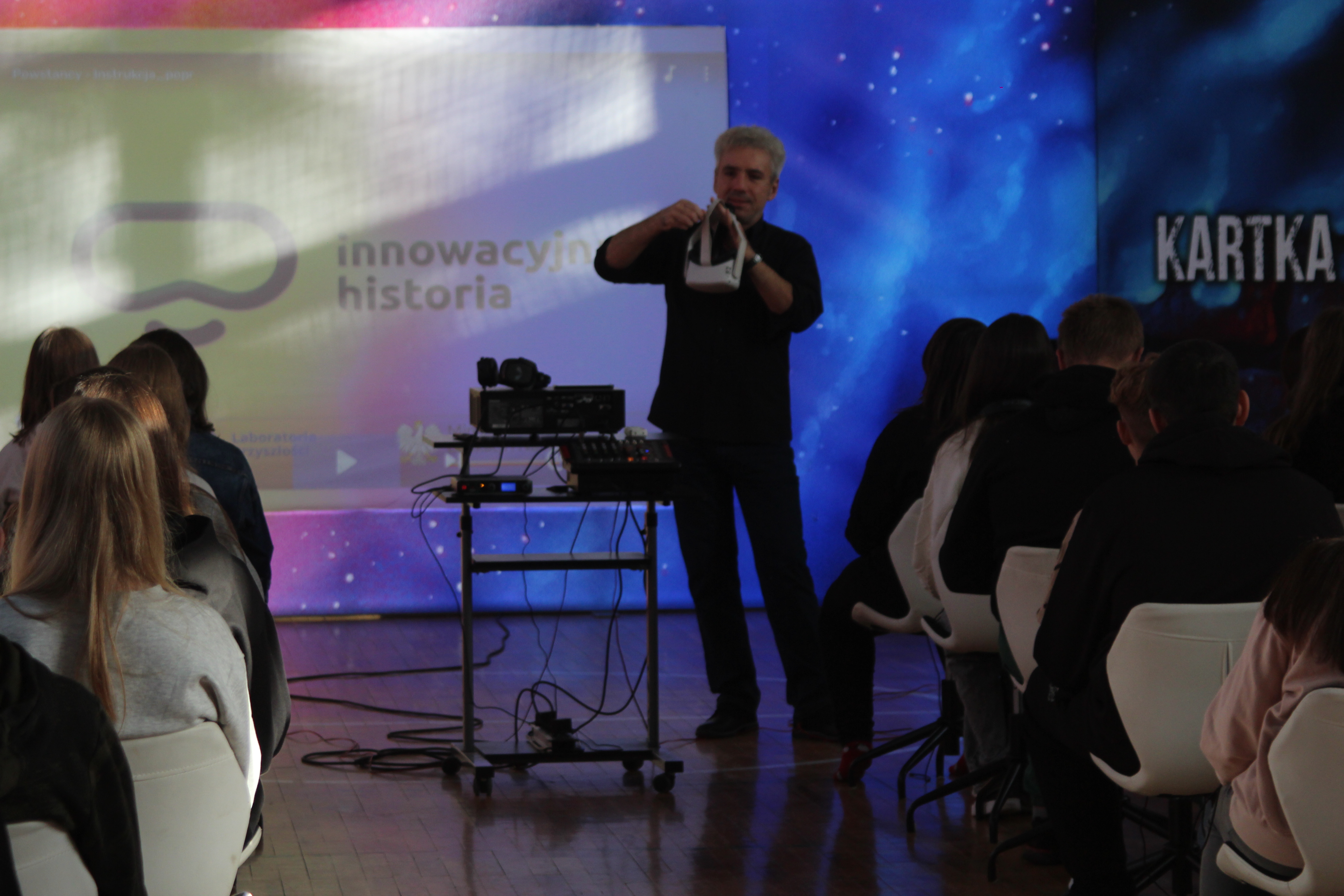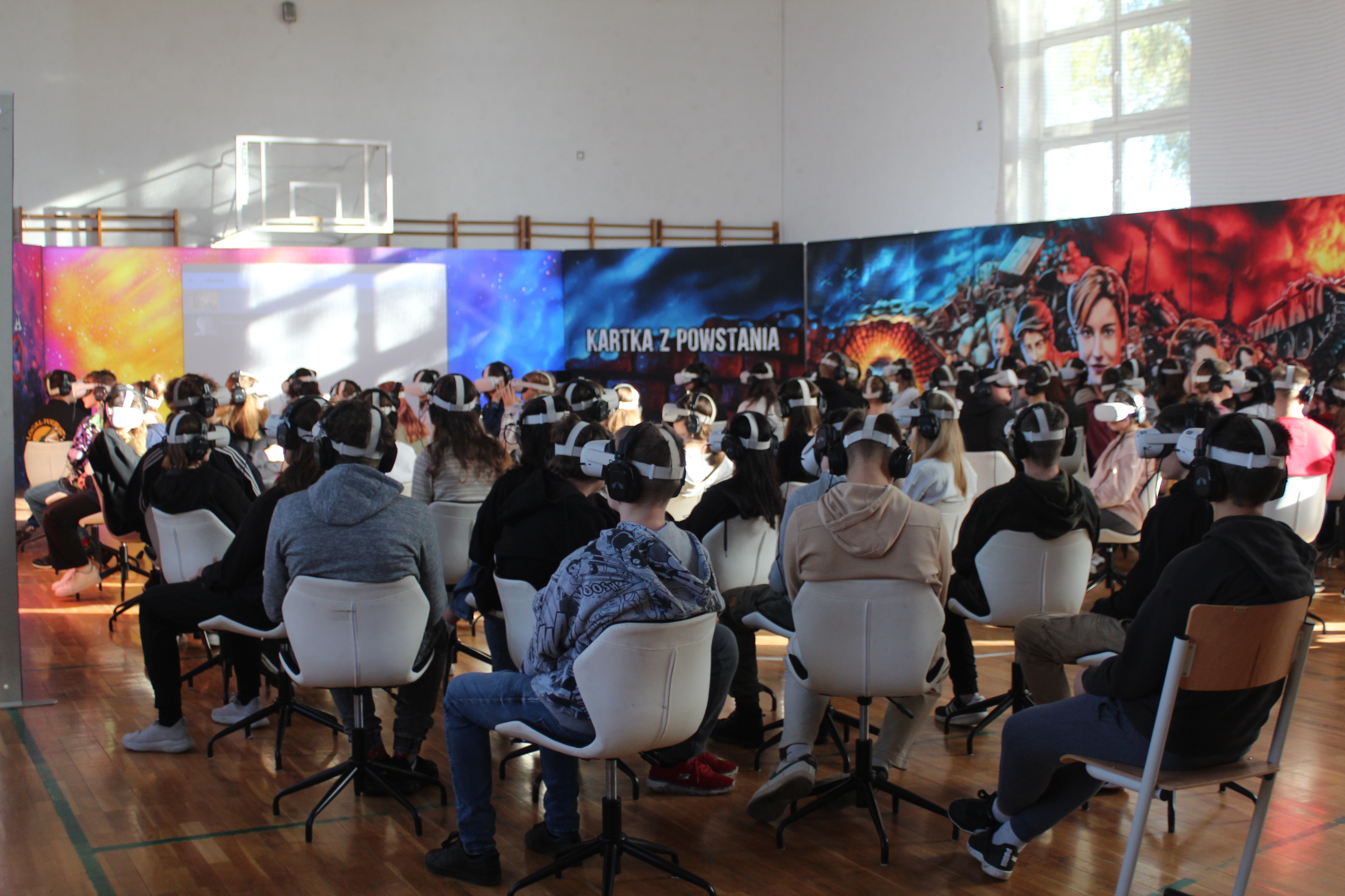 Zaprezentowano uczniom innowacyjną lekcję historii. W sali gimnastycznej zbudowano specjalną scenografię. Młodzież uczestniczyła w projekcji dwóch filmów historycznych: „Kartka z powstania” i „Wiktoria 1920”. Oba seanse odbyły się w technologii wirtualnej rzeczywistości przy wykorzystaniu narzędzi multimedialnych, w szczególności technologii wirtualnej (VR). Projekt bardzo podobał się uczniom, opuszczali pokaz pełni wrażeń i emocji. Z pewnością taka lekcja historii zapadnie w ich pamięci na długo.