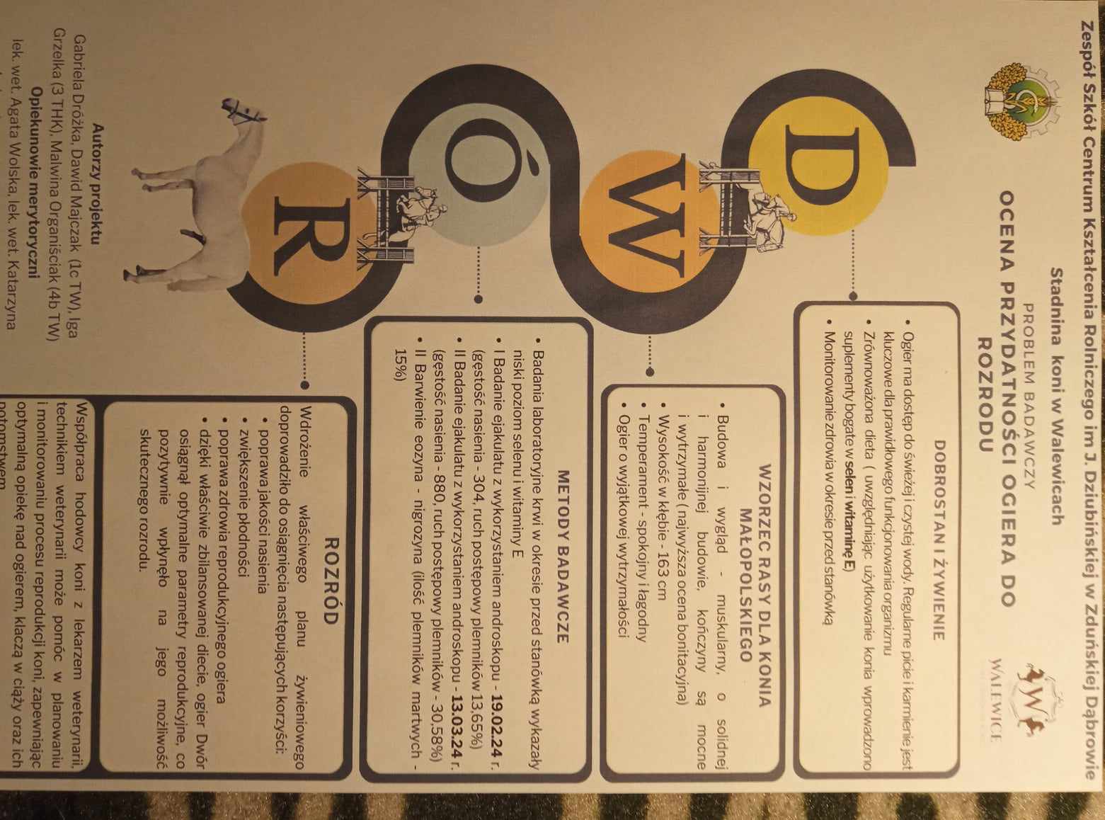 Miejsce I – „Ocena przydatności ogiera – Dwora do rozrodu” – uczniowie klasy Ic TW – Gabriela Dróżka, Dawid Majczak, klasy III THK Iga Grzelka, klasy IVb TW– Malwina Organiściak.