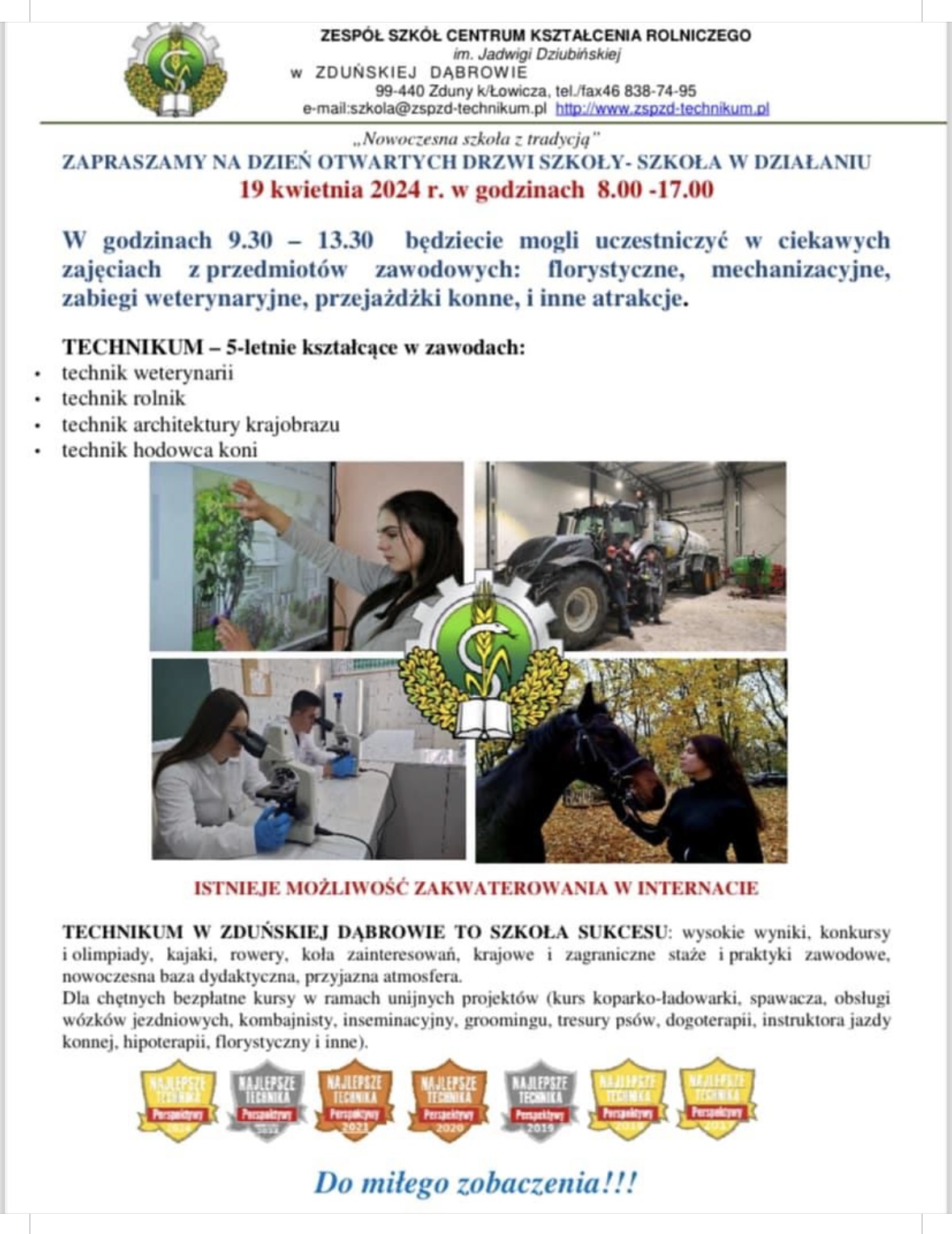 W godzinach 9.30 – 13.30 będziecie mogli uczestniczyć w ciekawych zajęciach z przedmiotów zawodowych: florystyczne, mechanizacyjne, zabiegi weterynaryjne, przejażdżki konne, i inne atrakcje.