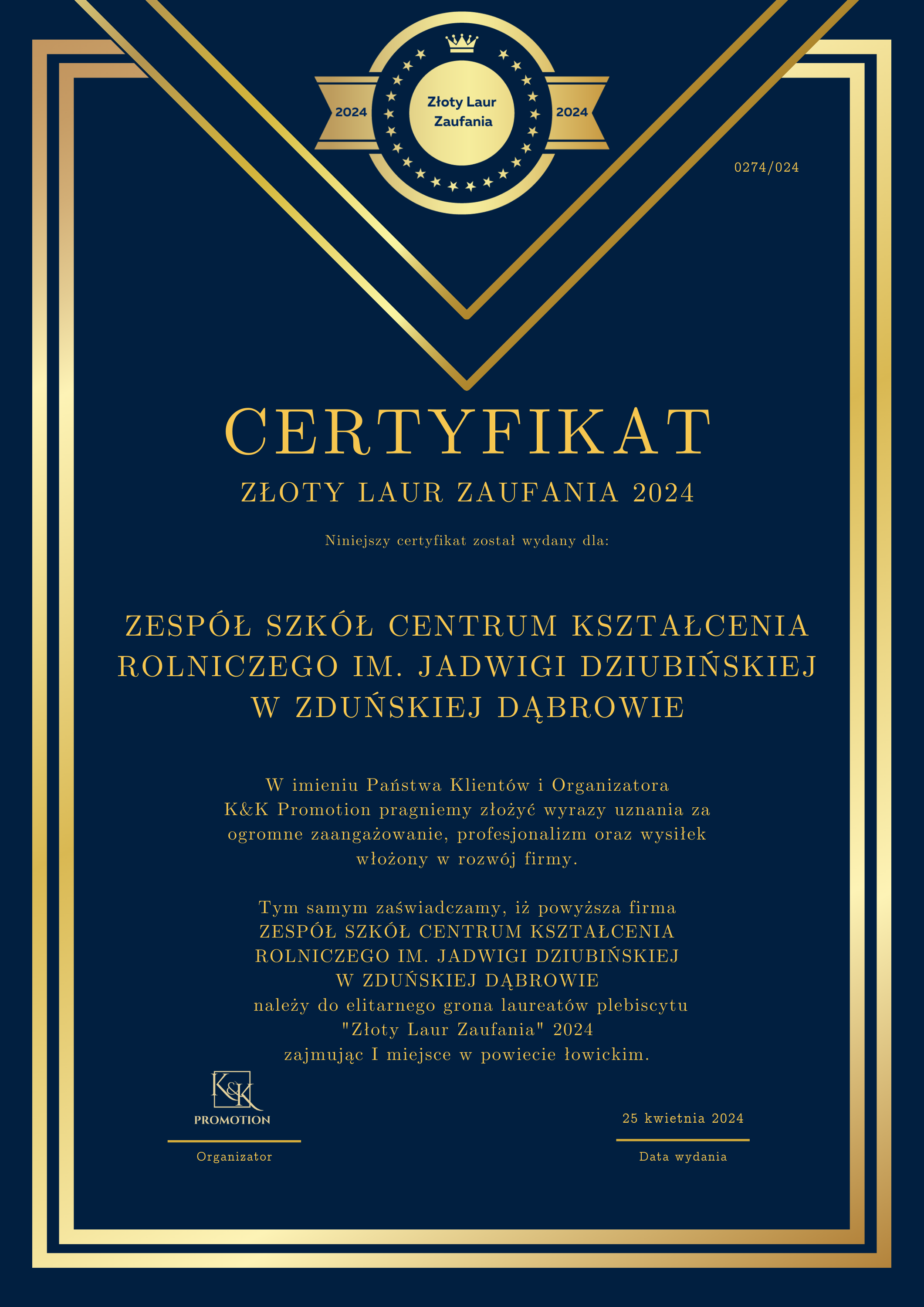 ZSCKR W ZDUŃSKIEJ DĄBROWIE WYRÓŻNIONY ZŁOTYM LAUREM ZAUFANIA 2024