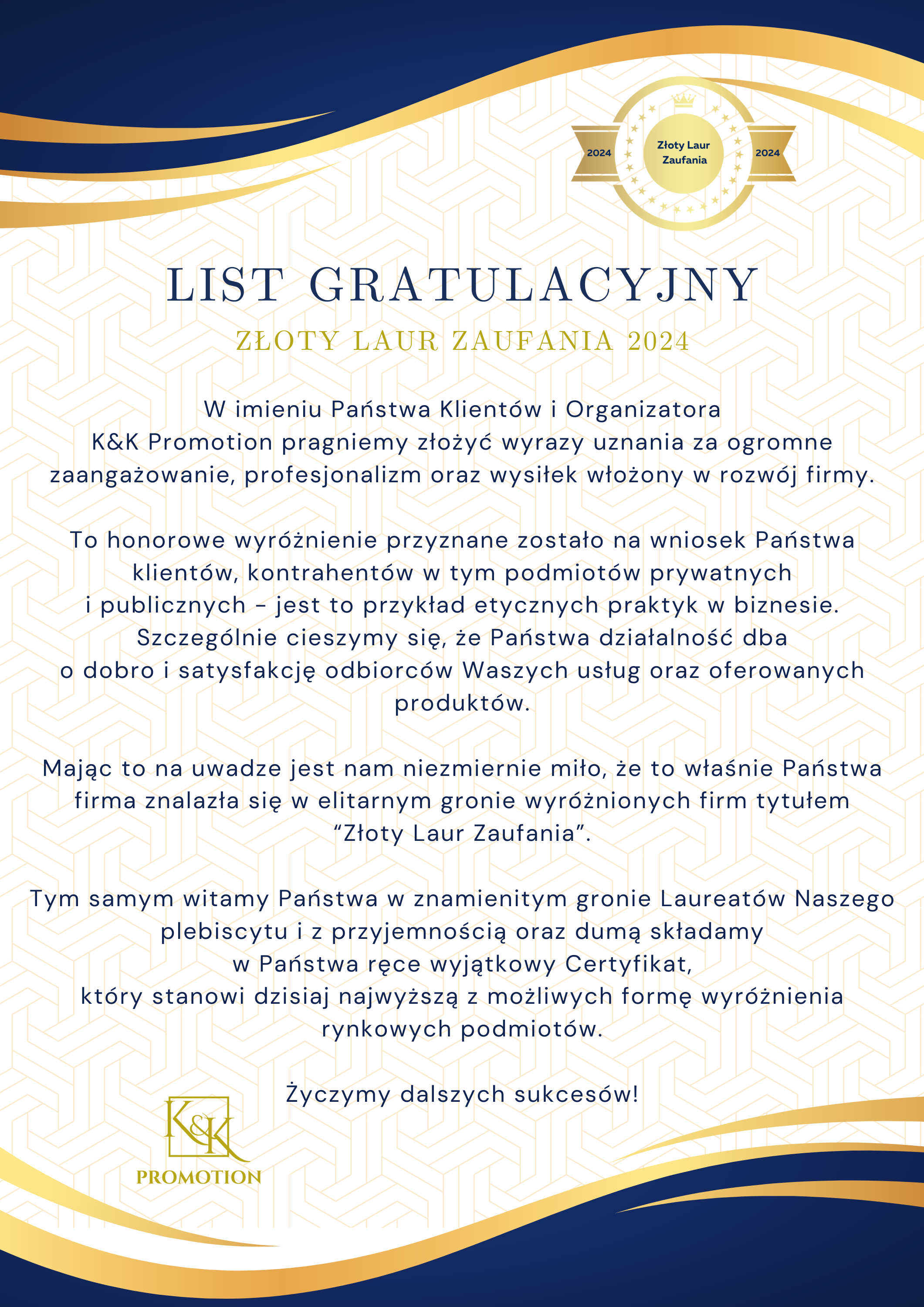 Możemy się pochwalić CERTYFIKATEM „ZŁOTY LAUR ZAUFANIA 2024” przyznanym za ogromne zaangażowanie, profesjonalizm oraz wysiłek włożony w rozwój firmy.