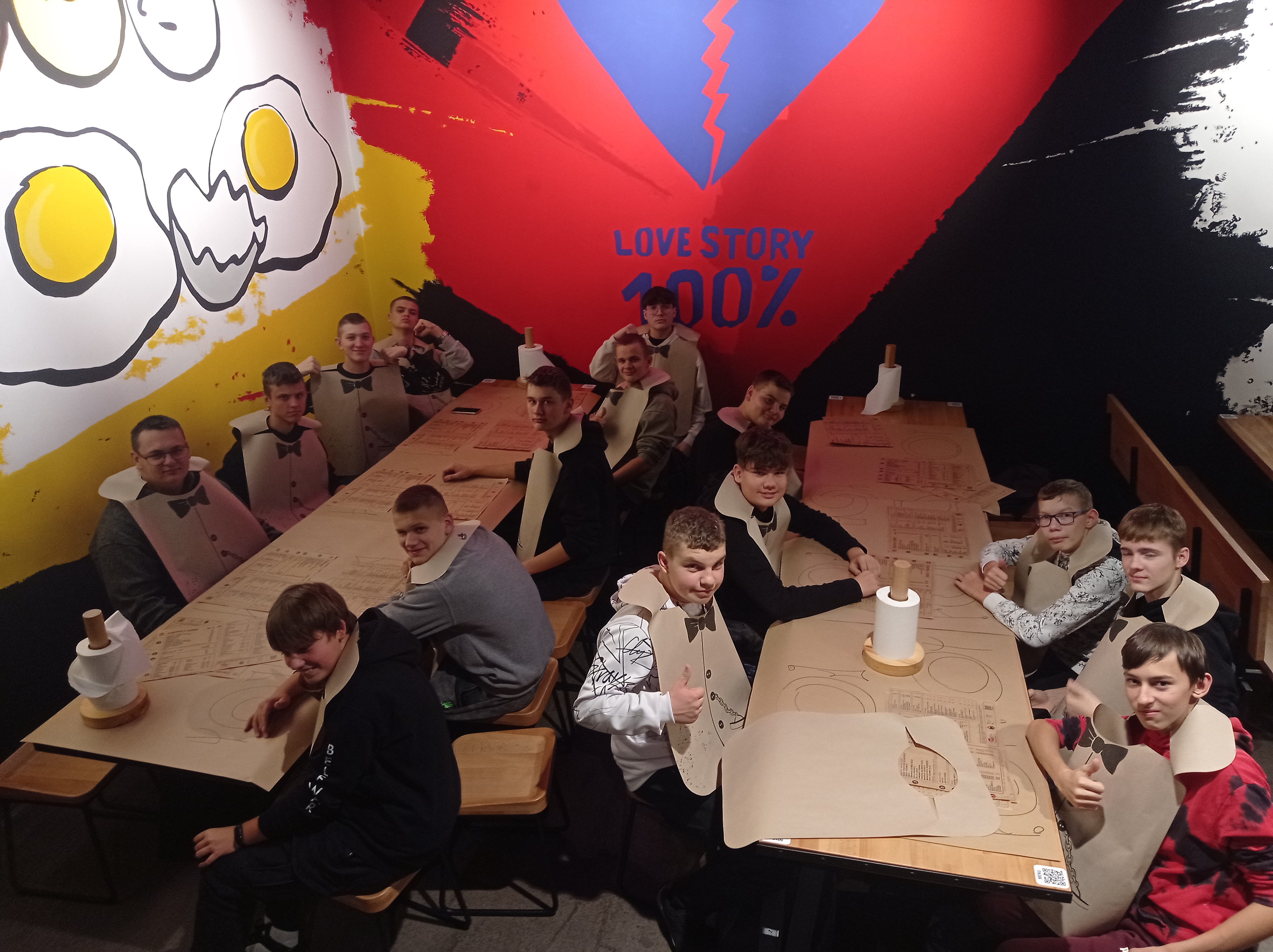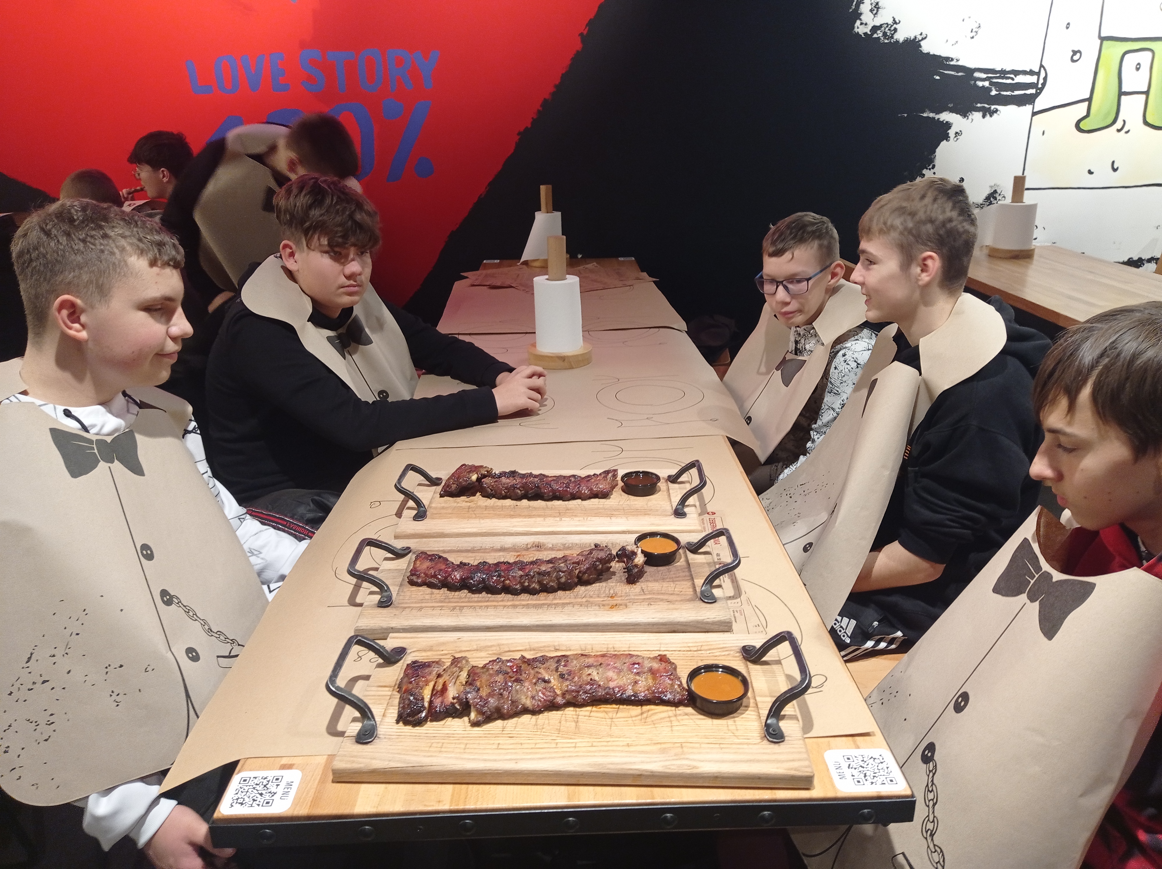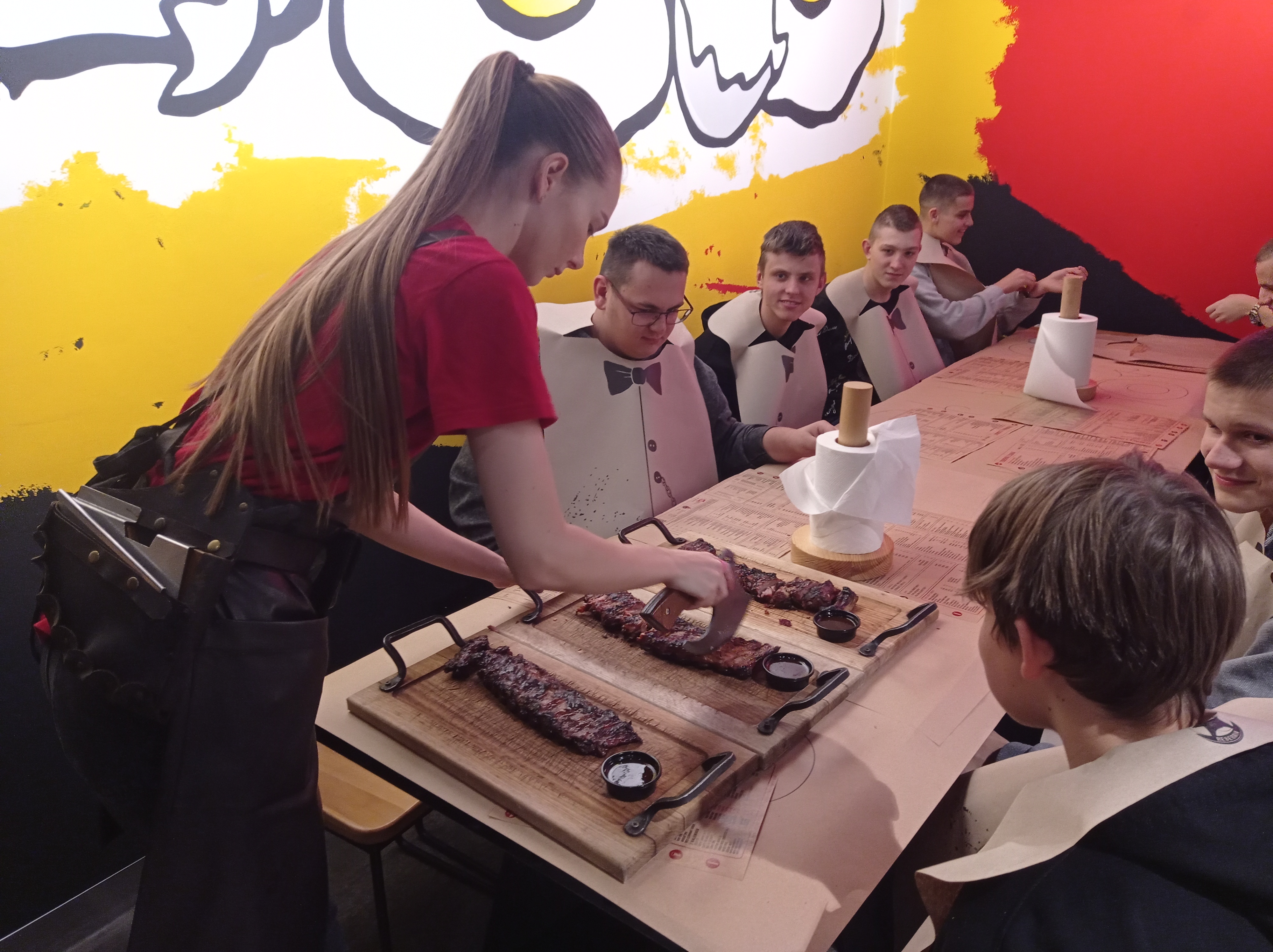 Na koniec udaliśmy się na nietypowy obiad – sprawdziliśmy, jak smakują żeberka grillowane na żywym ogniu. Przy wejściu do lokalu przywitała nas hostessa i zaprowadziła do stolików. Na początek dostaliśmy papierowe fartuchy. Na stole zamiast obrusów wylądowały papierowe arkusze, na których obsługa narysowała nam talerze i sztućce. Niespodzianek było więcej, jak chociażby rąbanie żeberek toporkiem przy stoliku, czy jedzenie rękoma. Było to dla nas całkiem nowe, ciekawe i smaczne doznanie- relacjonują chłopcy z I TR.