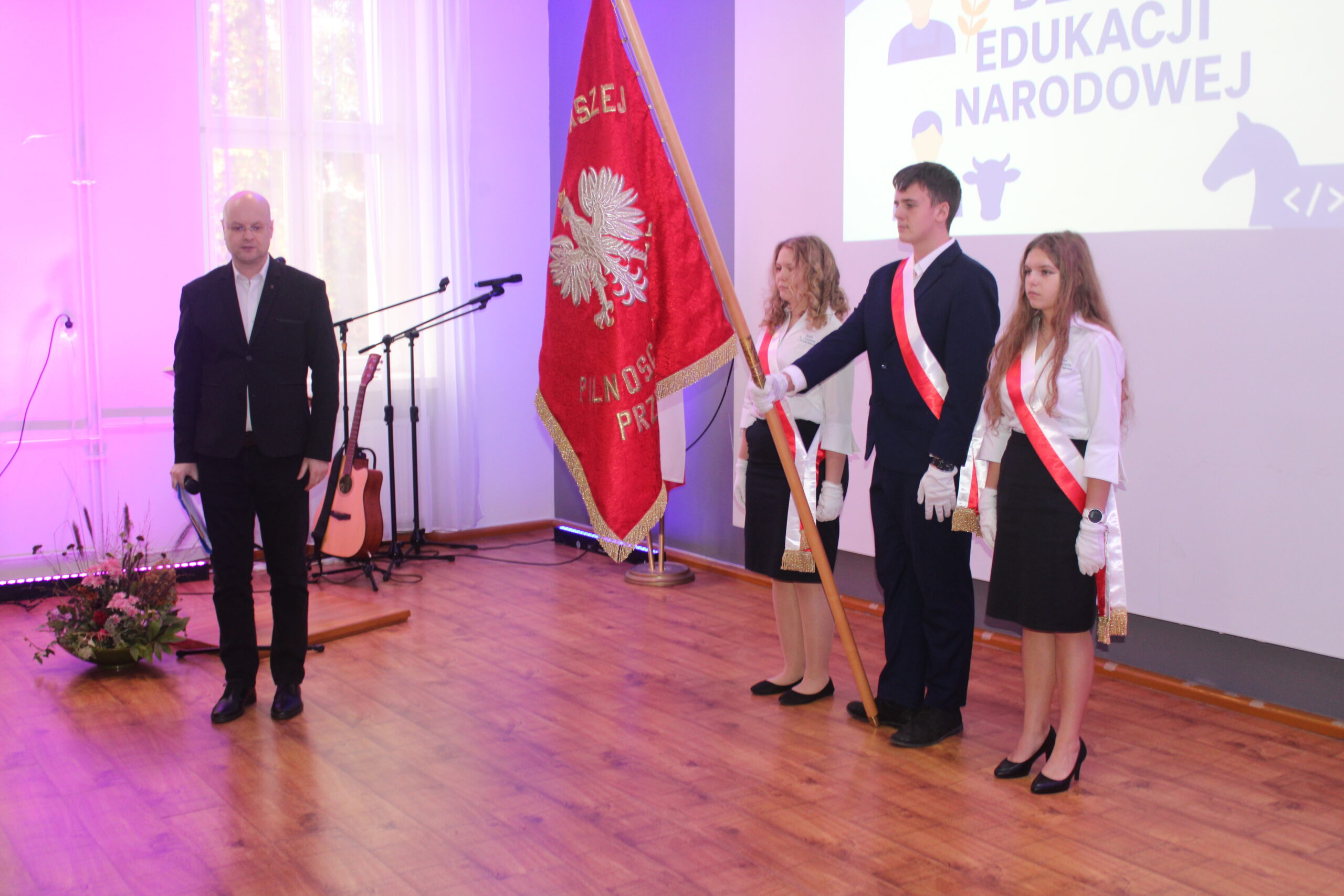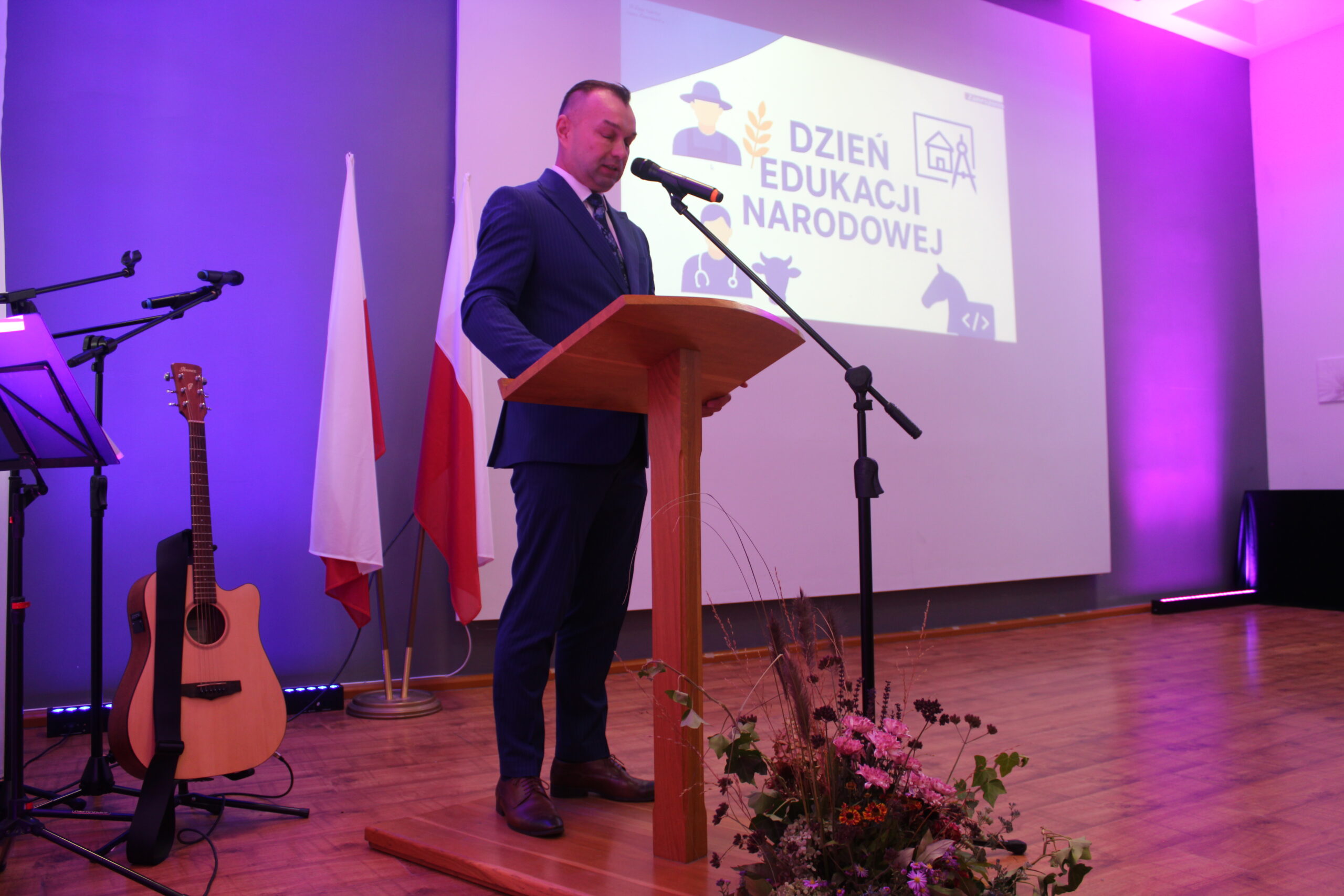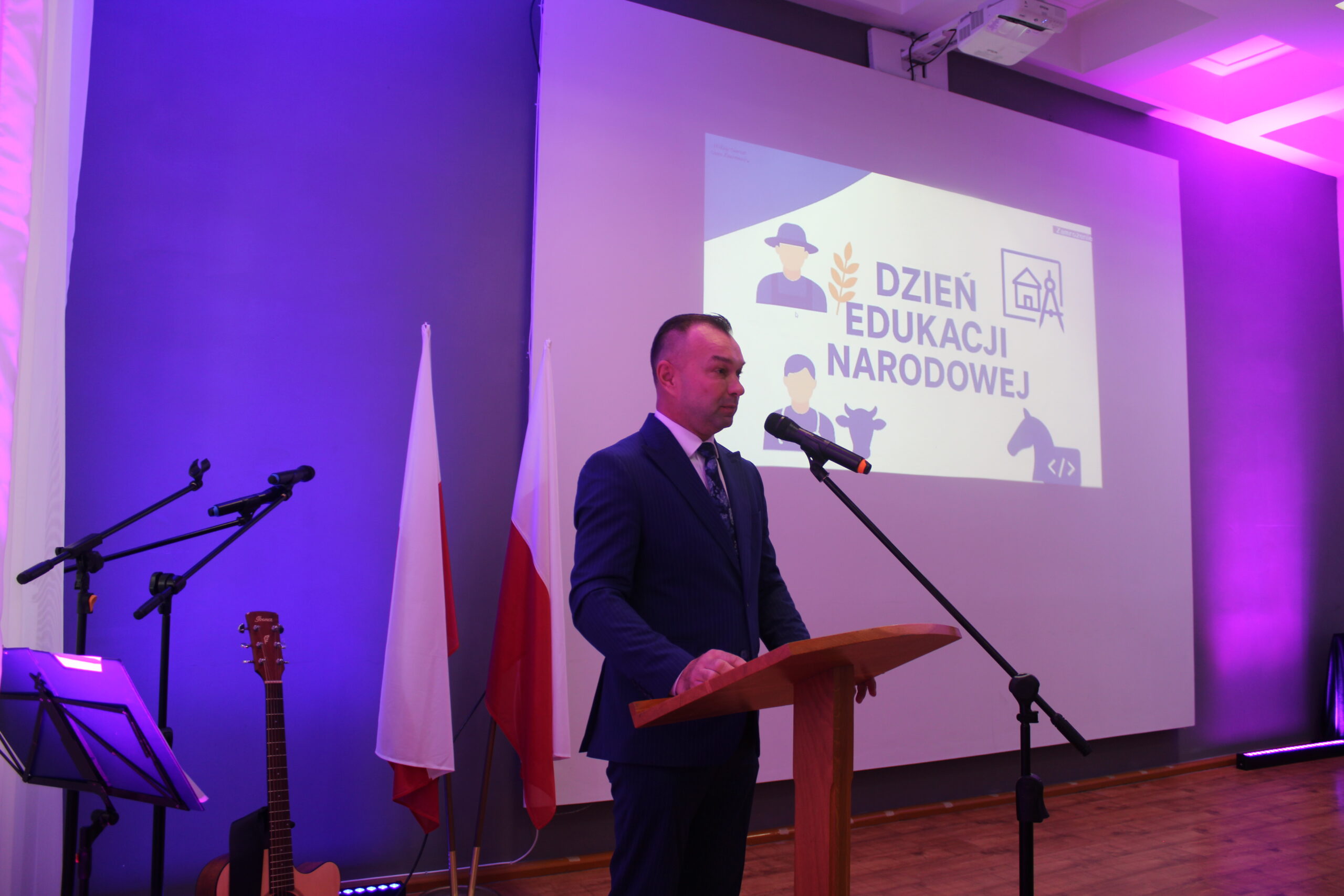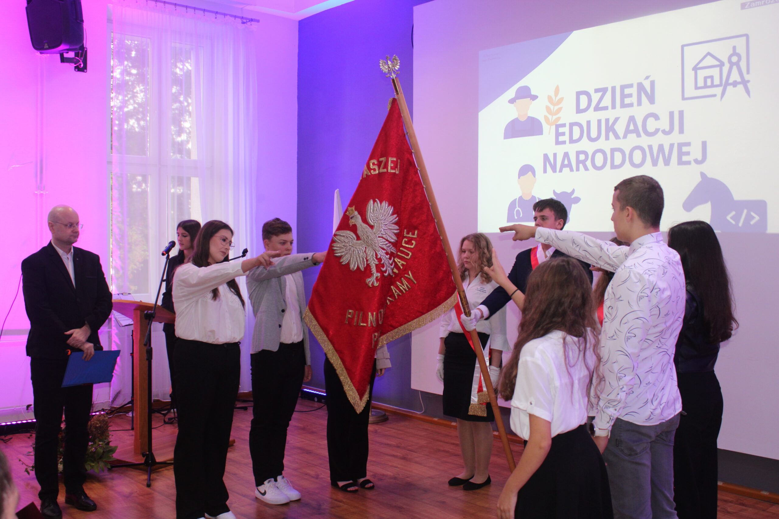 Uroczystość rozpoczęła się od wprowadzenia pocztu sztandarowego i odśpiewania hymnu państwowego. Następnie głos zabrał dyrektor szkoły, pan Stanisław Kosmowski, który powitał wszystkich zebranych gości, nauczycieli, uczniów oraz pracowników szkoły — zarówno tych obecnych, jak i emerytowanych. W swoim przemówieniu podkreślił, że Dzień Edukacji Narodowej to święto całej społeczności szkolnej – nie tylko nauczycieli, ale także wszystkich osób, które na co dzień dbają o prawidłowe funkcjonowanie placówki. Dyrektor wyraził wdzięczność za pracę, życzliwość i zaangażowanie wszystkich, którzy swoją postawą i oddaniem przyczyniają się do tworzenia przyjaznej, twórczej atmosfery w ZSCKR w Zduńskiej Dąbrowie.